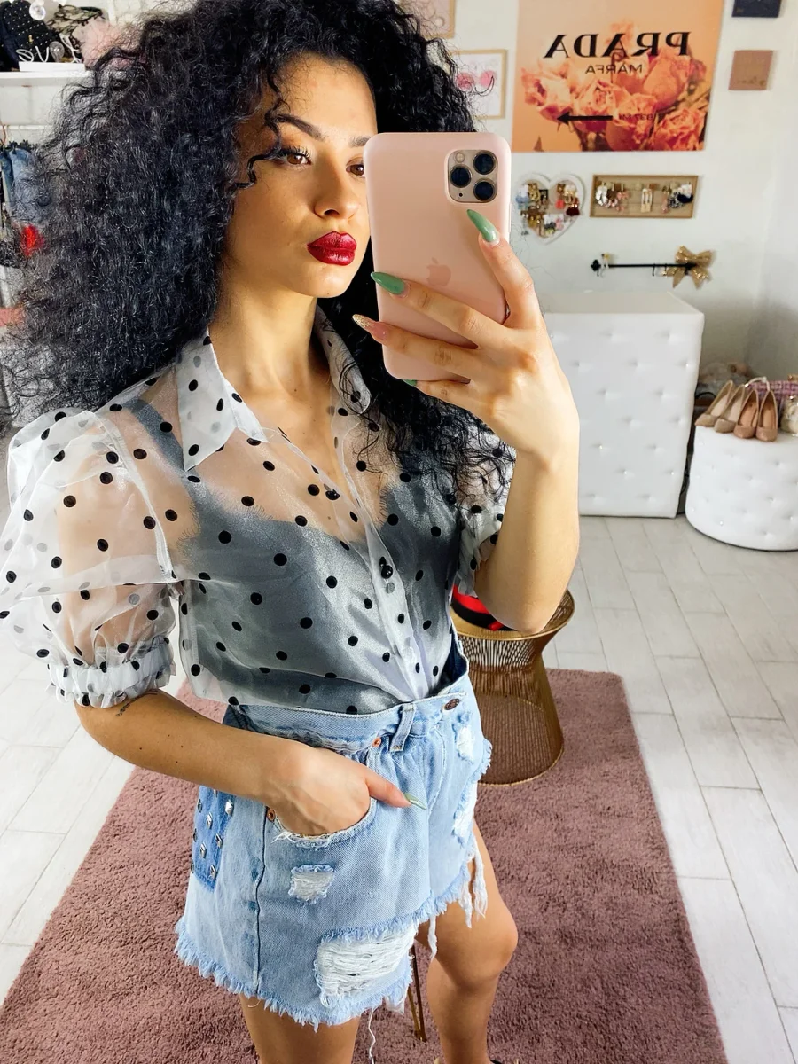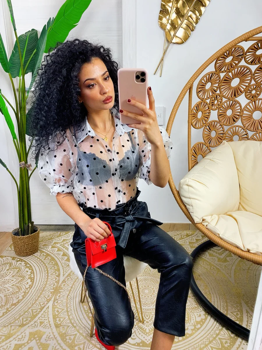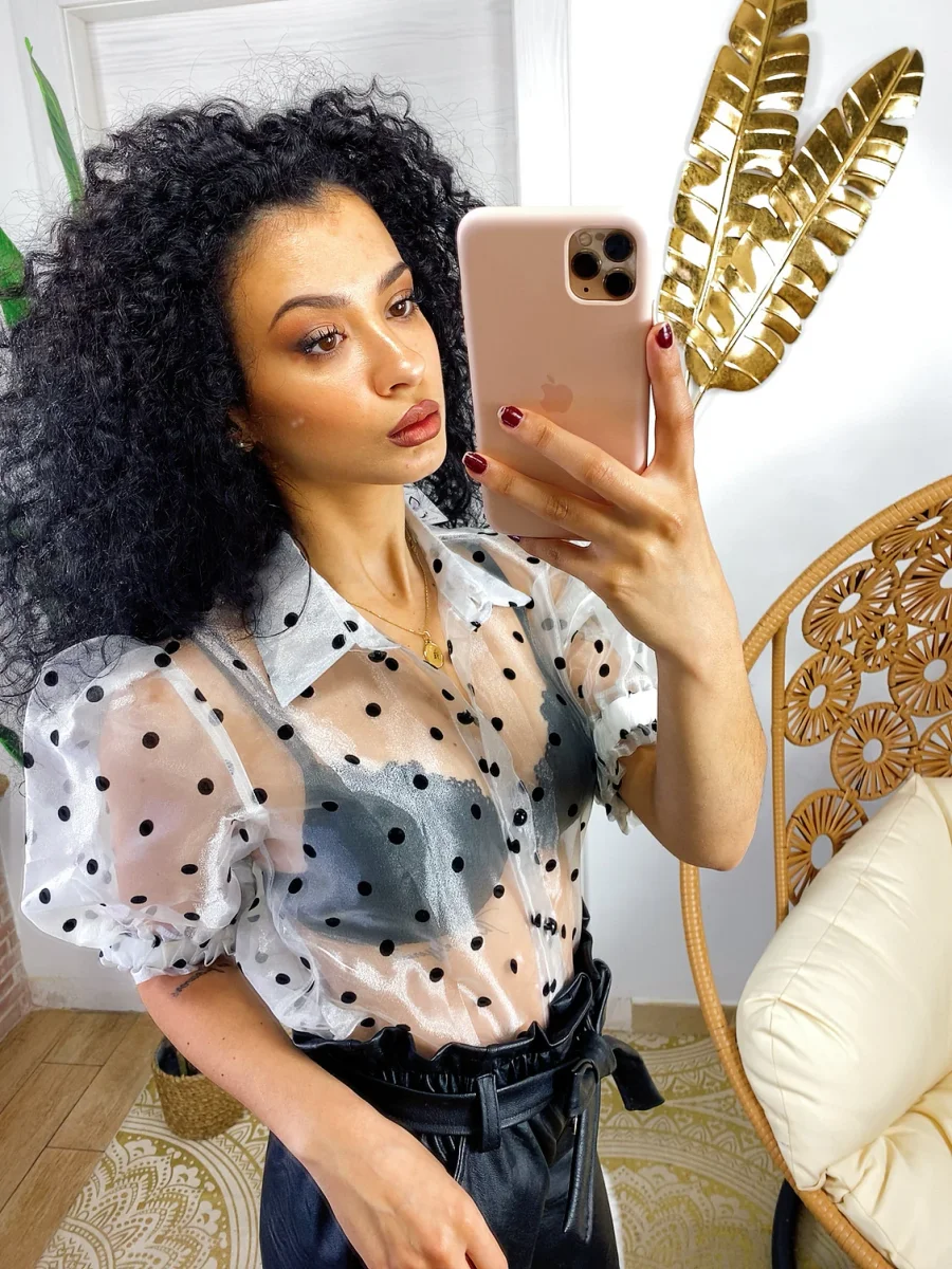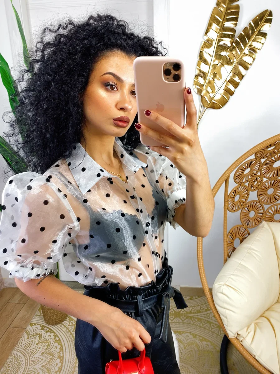 Camicetta leggera con manica bombata e trama a pois. Chiusura con bottoncini neri.