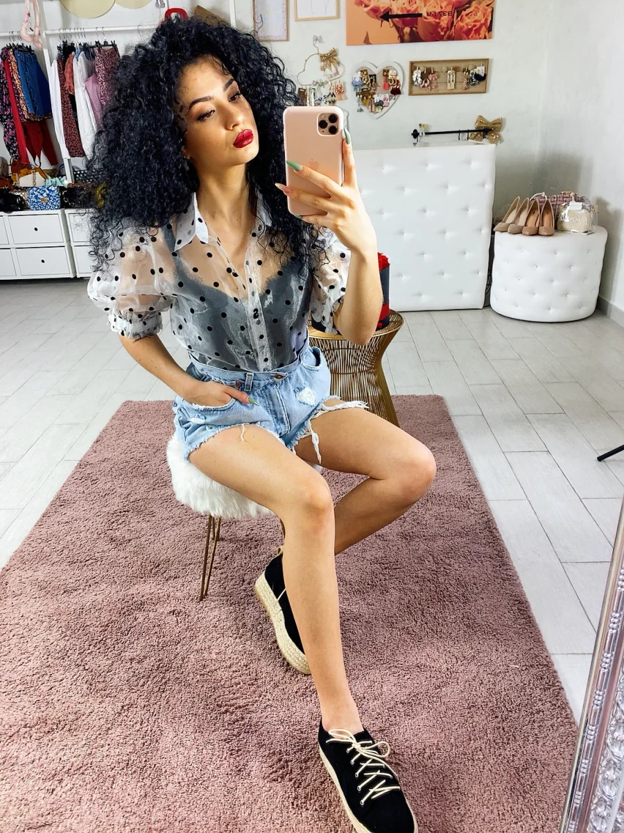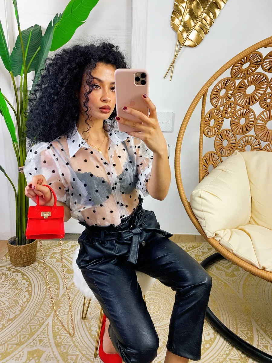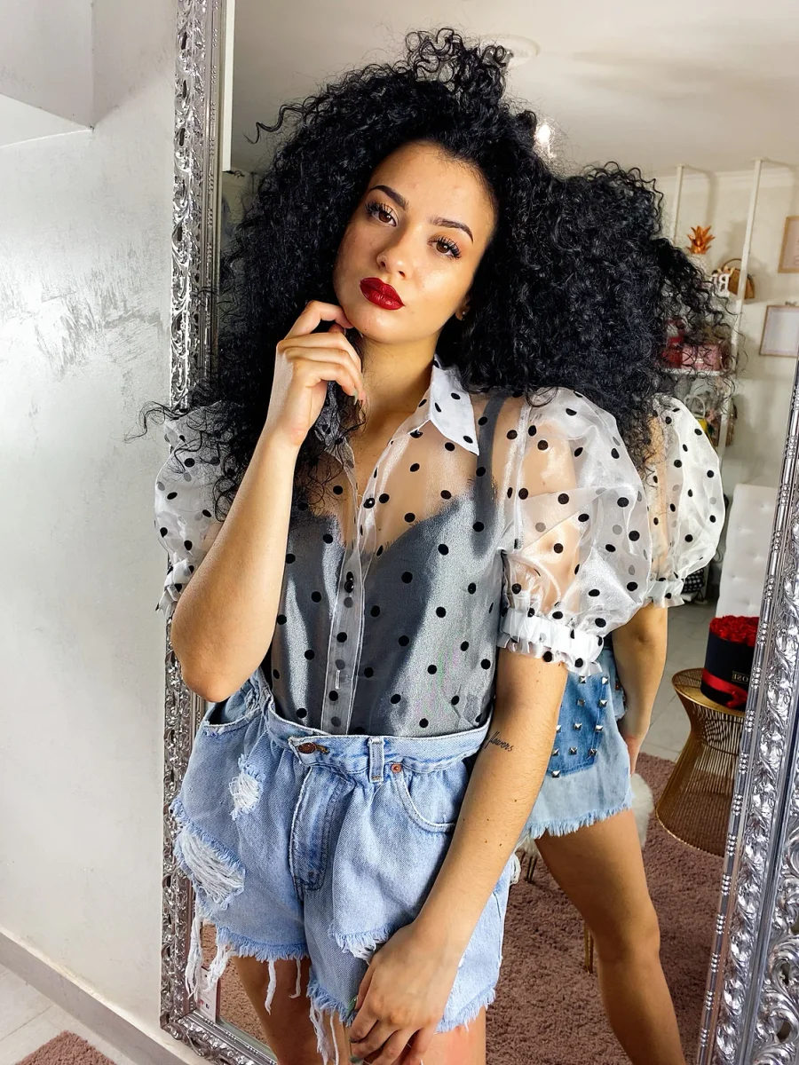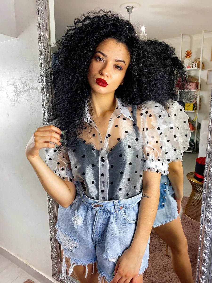 Camicetta leggera con manica bombata e trama a pois. Chiusura con bottoncini neri.