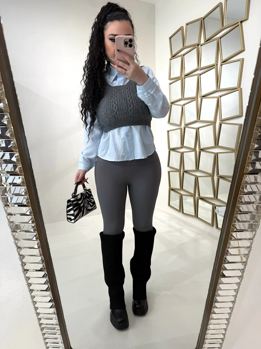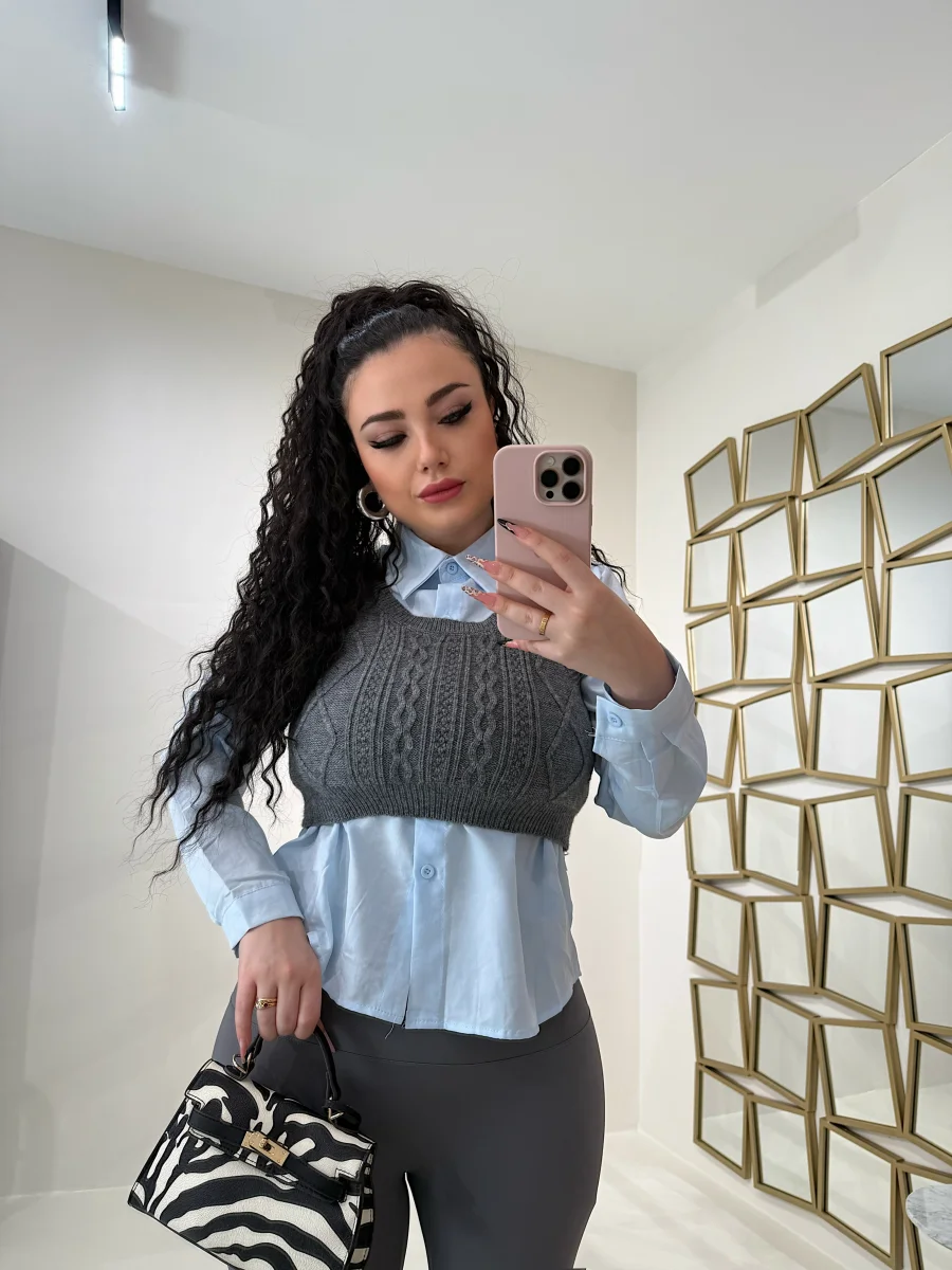 Eleva il tuo stile con la nostra camicetta celeste con gilet a maglioncino! Mostra il tuo spirito audace e coraggioso mentre indossi questo look unico e di tendenza. Aggiungilo al tuo guardaroba per dare un tocco di avventura ai tuoi outfit. Adatto per ogni occasione, otterrai sicuramente l’attenzione di tutti!