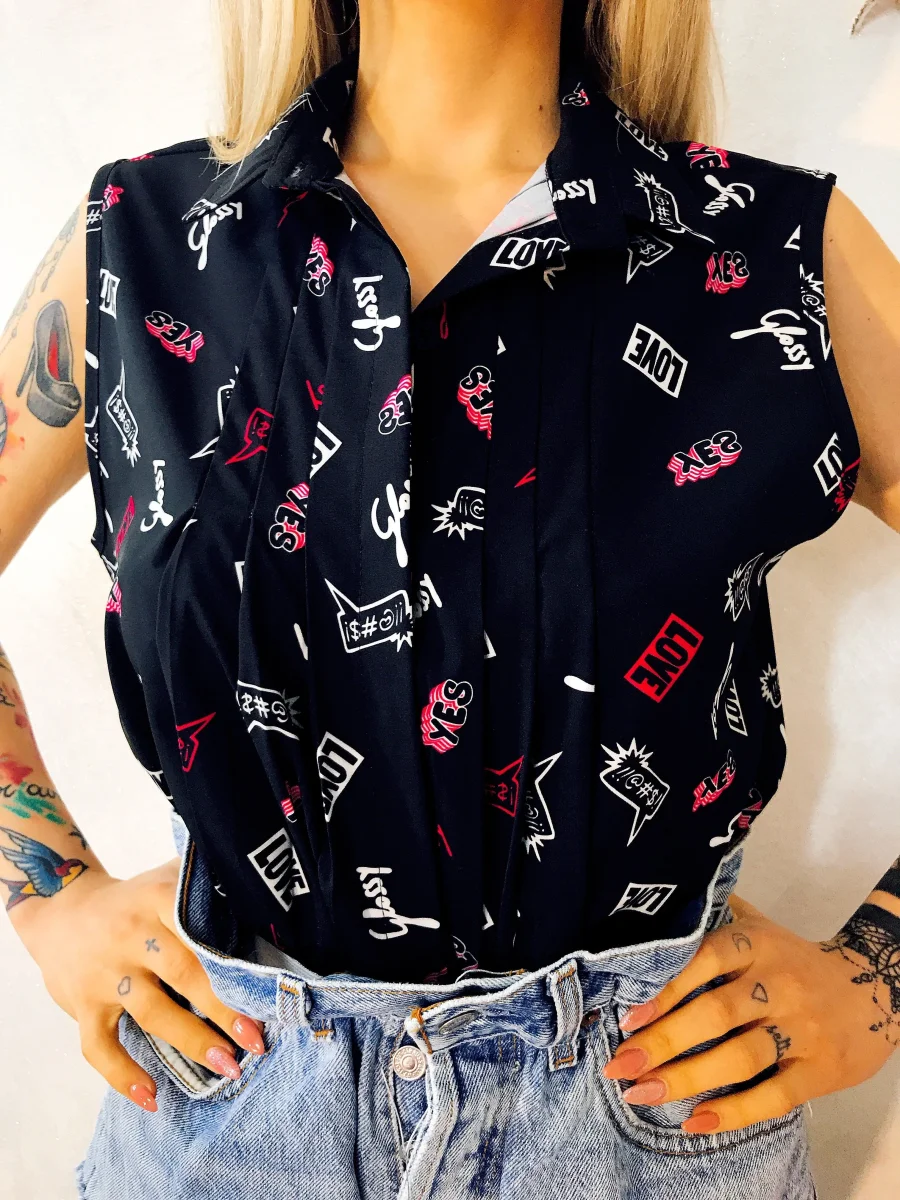Camicetta con pieghi. Bottoni nascosti e e stampa con scritte. Taglia unica