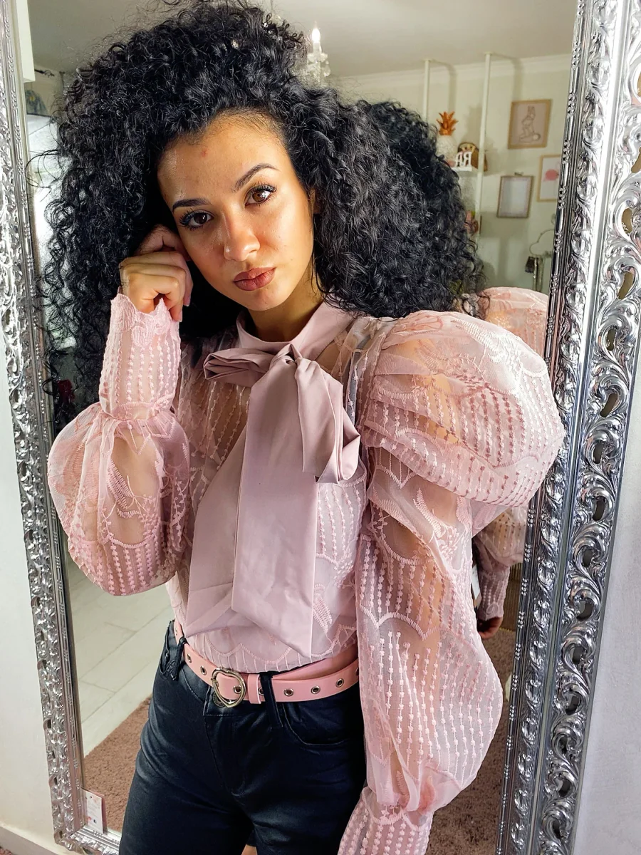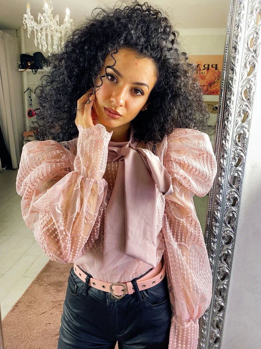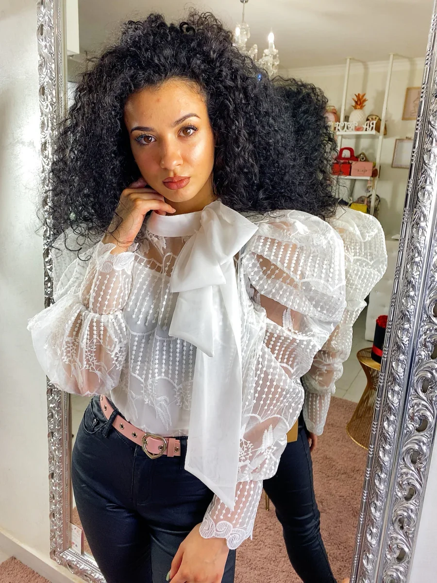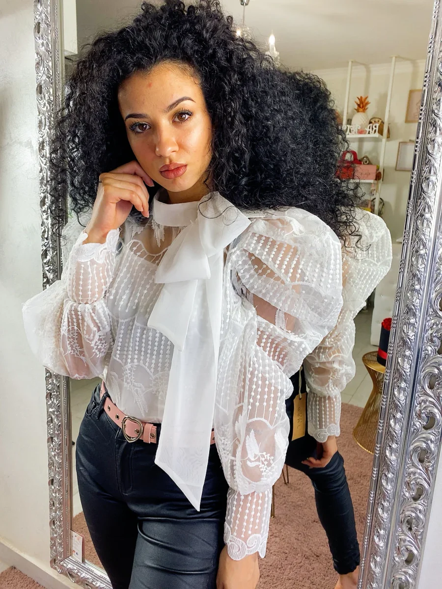 Deliziosa camicetta in pizzo dotata di canotta. Maxi fiocco in raso al collo. Chiusura con zip sulla schiena