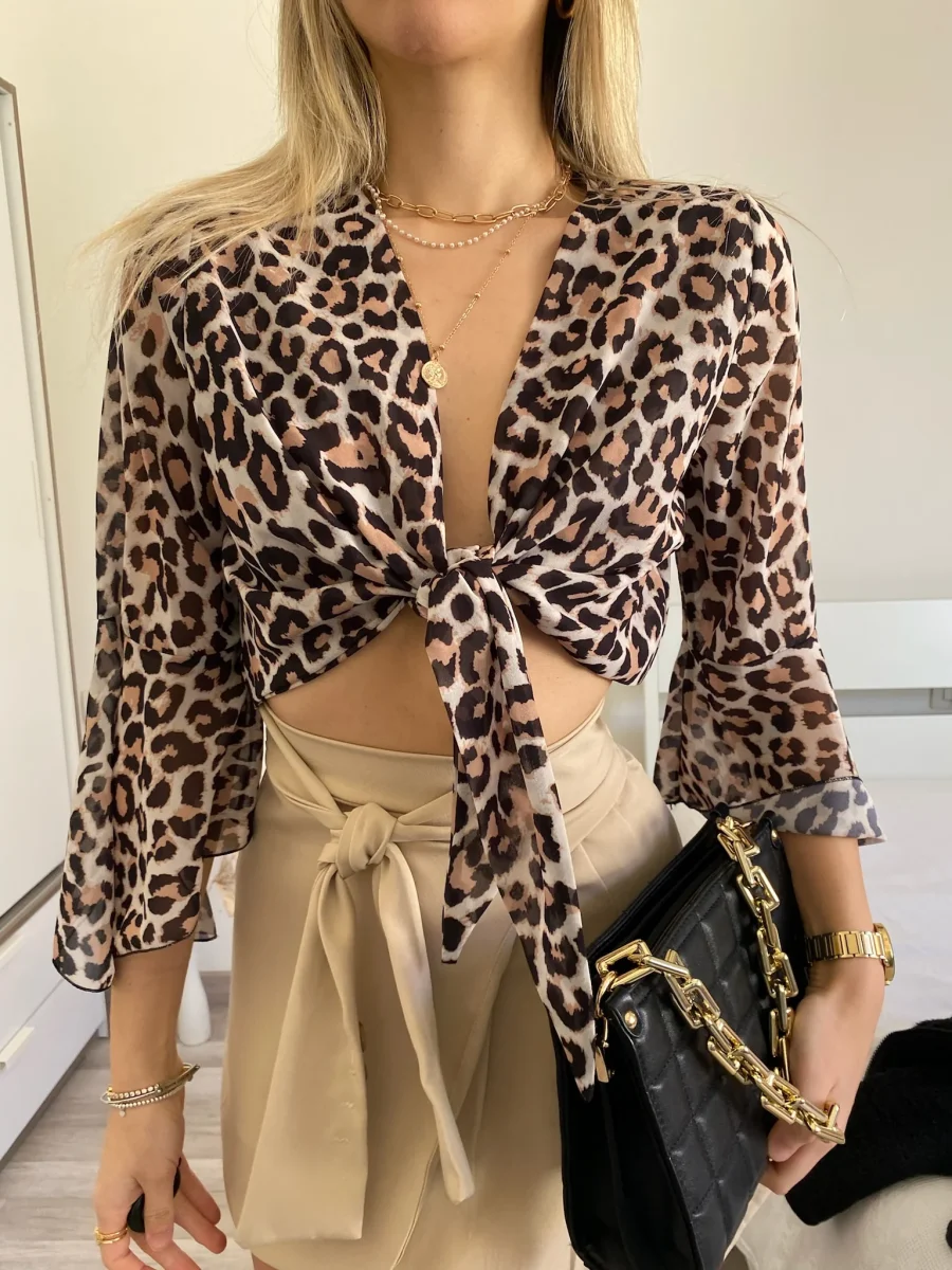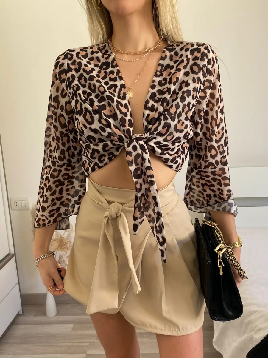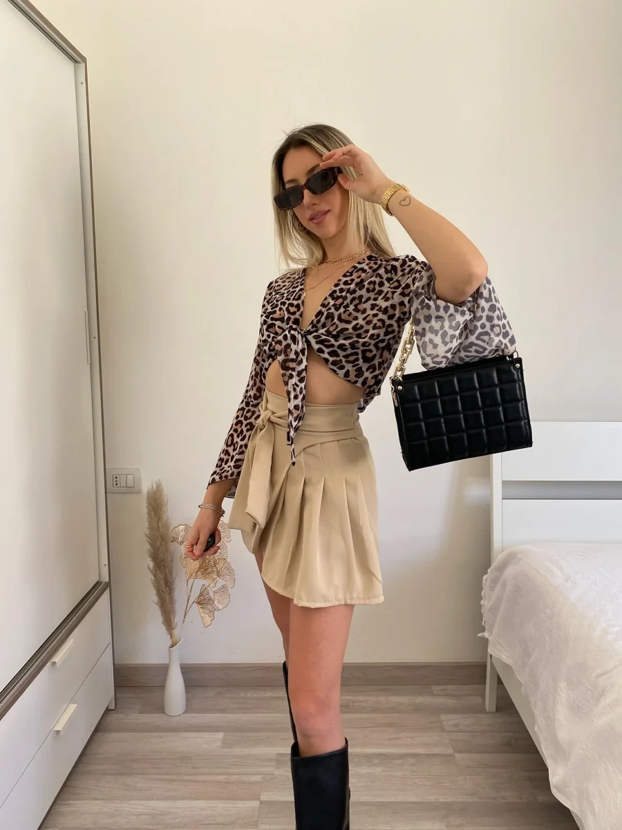 Camicetta a manica lunga con bottoncini in trama maculata e base lilla. Nodo sul davanti