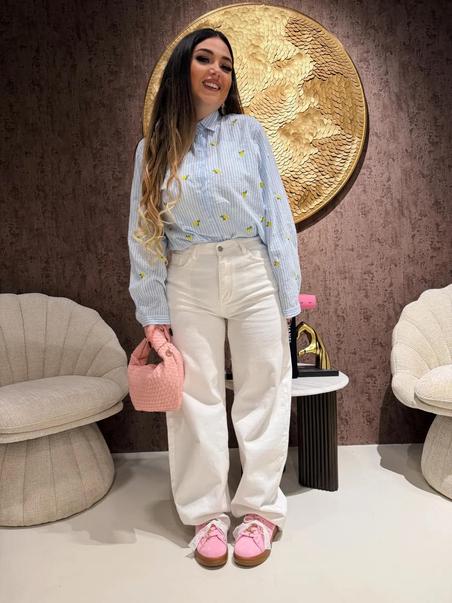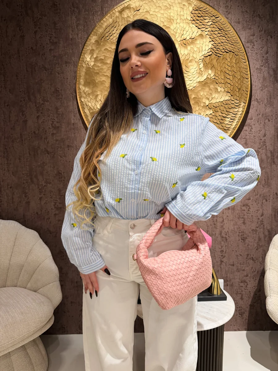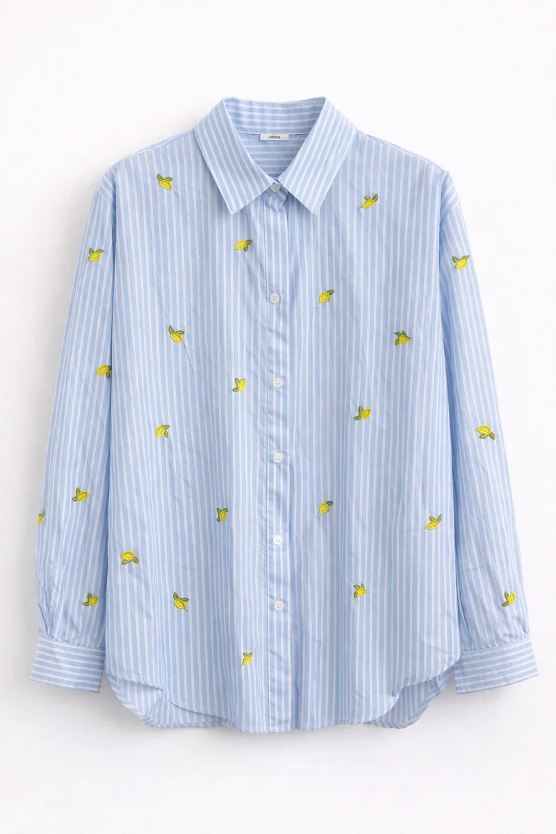 Camicia in tessuto leggero a righe celesti e bianche, arricchita da delicati limoni ricamati che donano un tocco fresco, solare e mediterraneo. Il taglio morbido garantisce comfort e versatilità, rendendola perfetta sia per look quotidiani che per outfit più ricercati. Un capo originale ma facile da abbinare, ideale per la stagione primavera/estate.