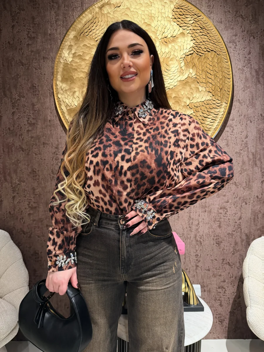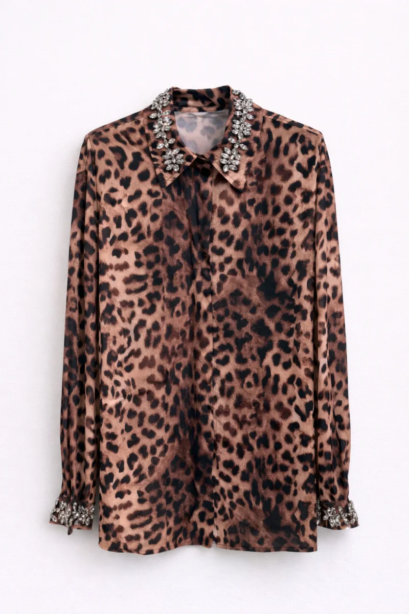 Camicia dal carattere deciso e raffinato, realizzata in tessuto fluido con stampa leopard. Il capo è impreziosito da uno splendido colletto gioiello con applicazioni luminose che donano un tocco luxury e rendono la camicia protagonista assoluta del look. I dettagli gioiello sui polsini completano il design, rendendola perfetta per outfit eleganti e serali.