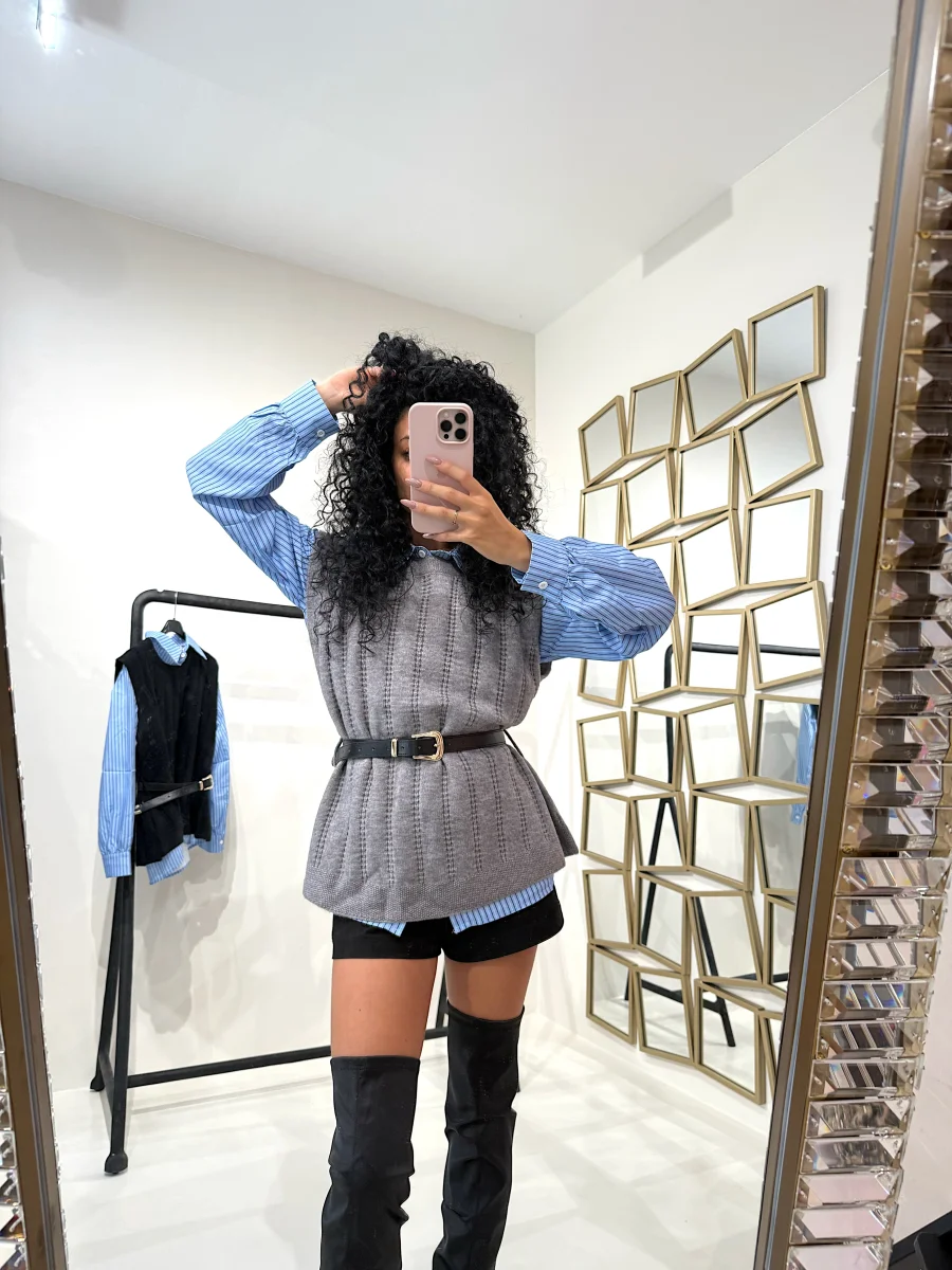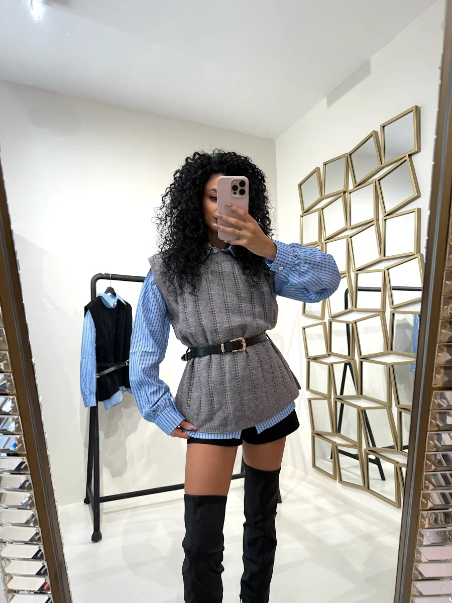 Un capo unico dal design sofisticato che unisce la praticità della camicia classica al calore del maglioncino. La camicia a righe azzurre con colletto e bottoni frontali è impreziosita da un gilet in maglia grigia lavorata che si può anche togliere