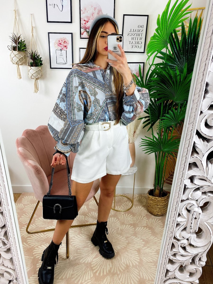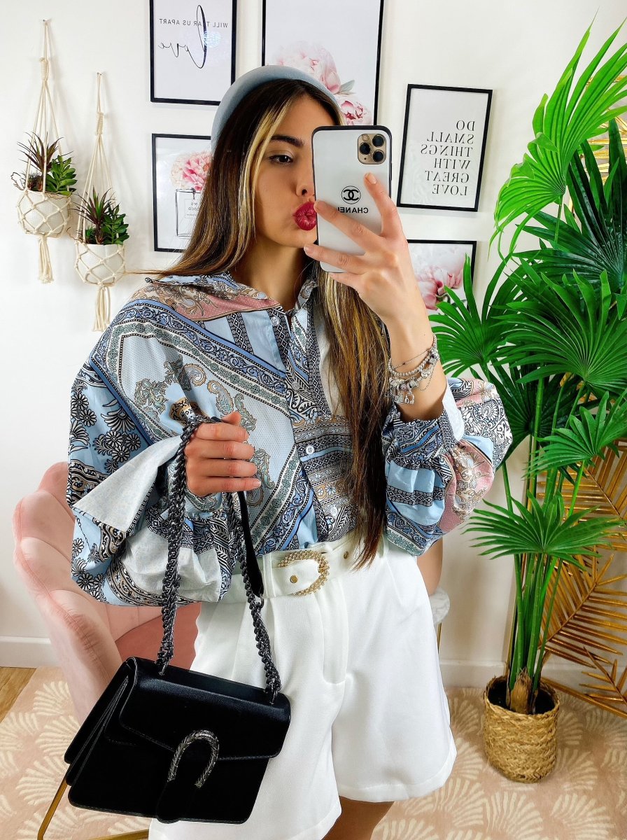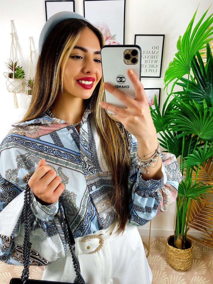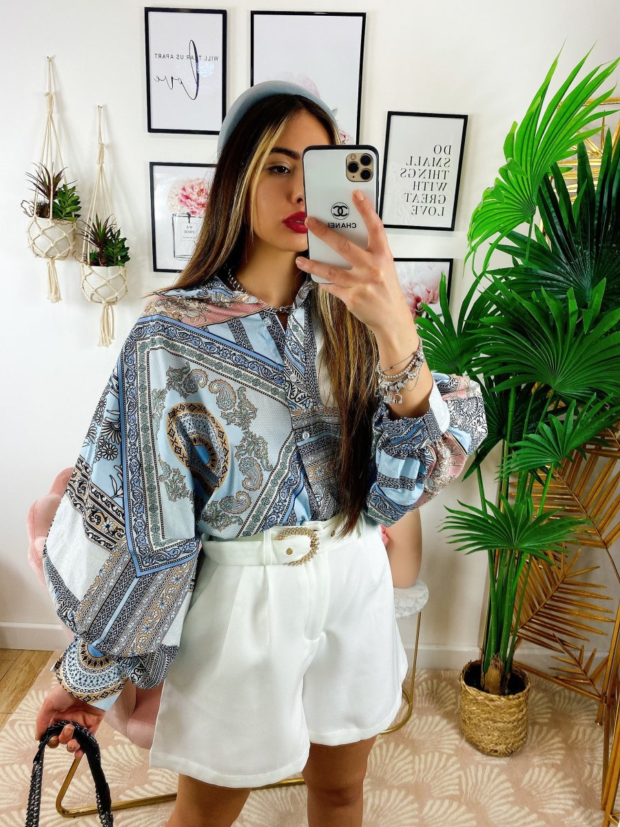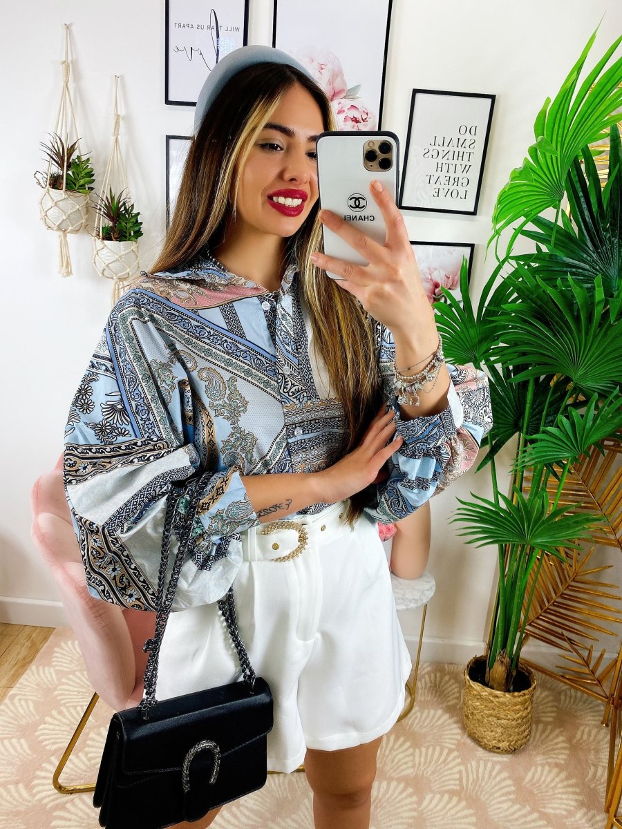 Camicia etnica medio lunga sfumature Celesti, tessuto ottimo, manica leggermente larga e chiusura a polsino.