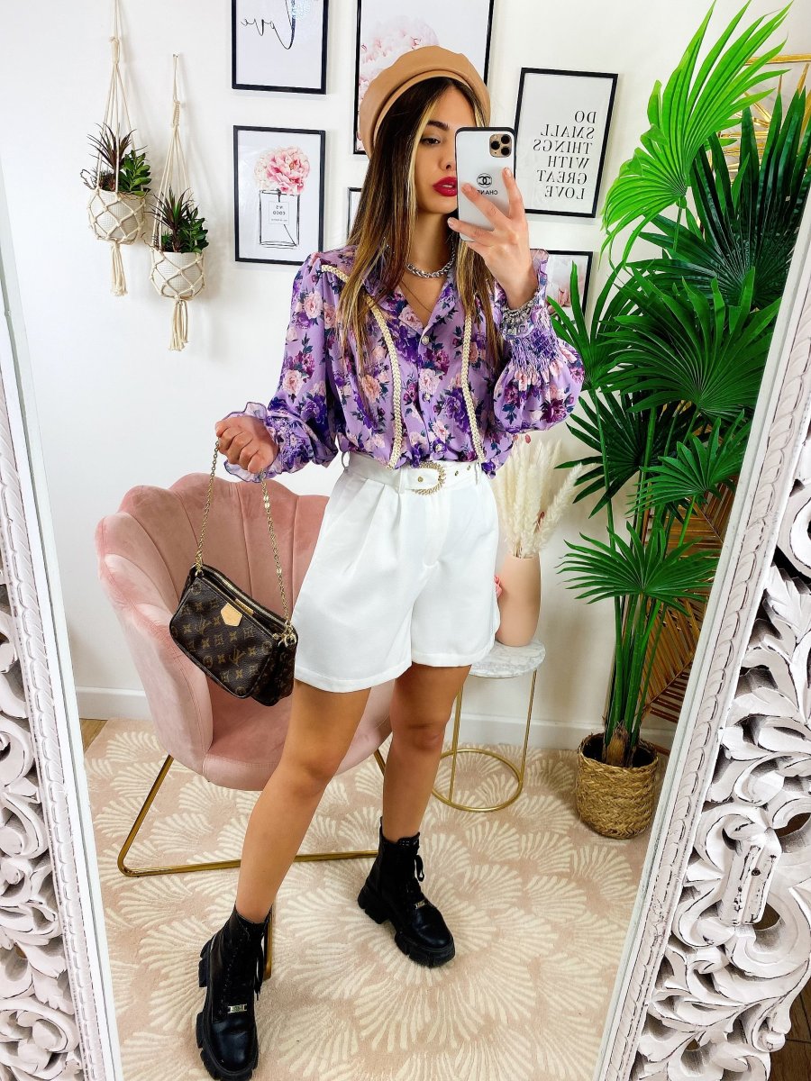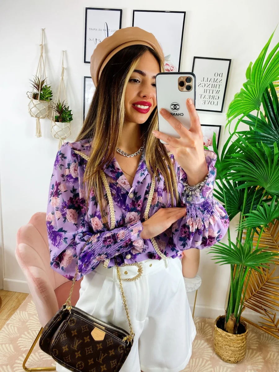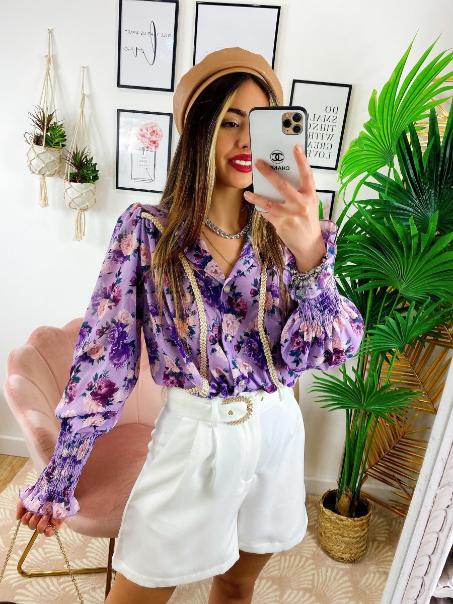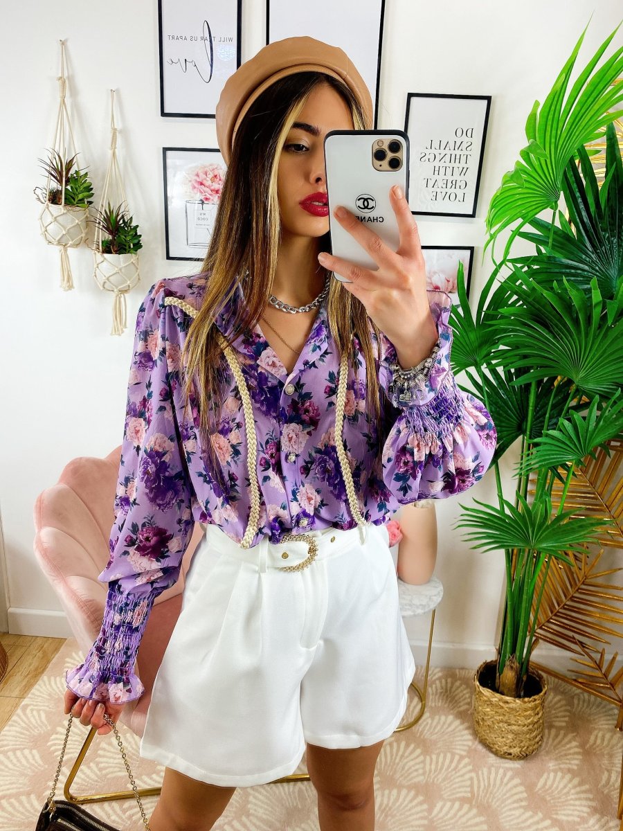 Camicia fiorata con ricami base lilla Leggermente velata con bottoni gioiellò, polsino elasticizzato.