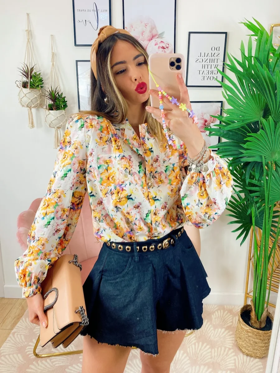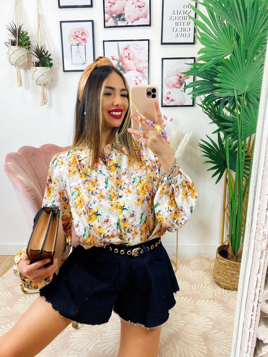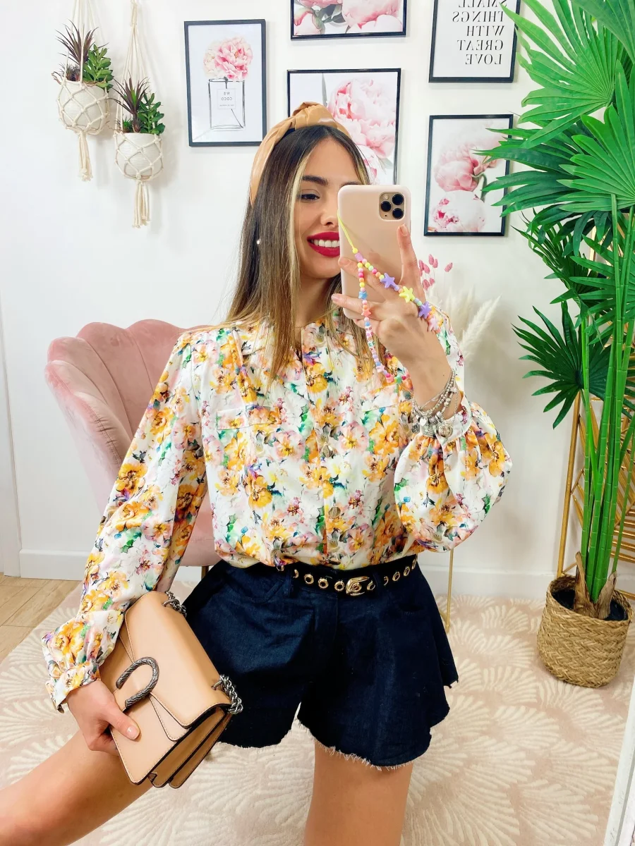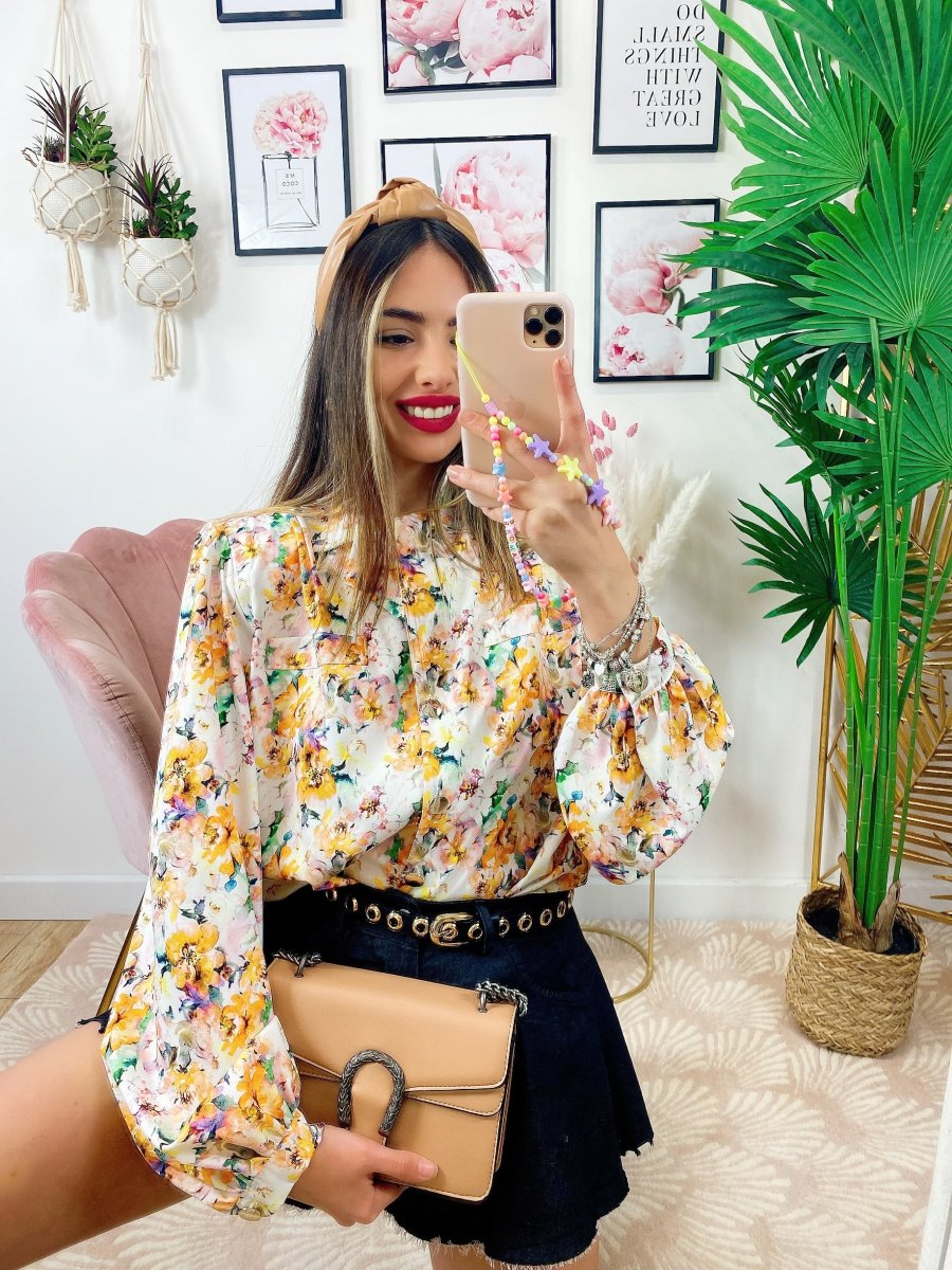 Camicia fiorata sfumature arancio Vestibilità morbida.