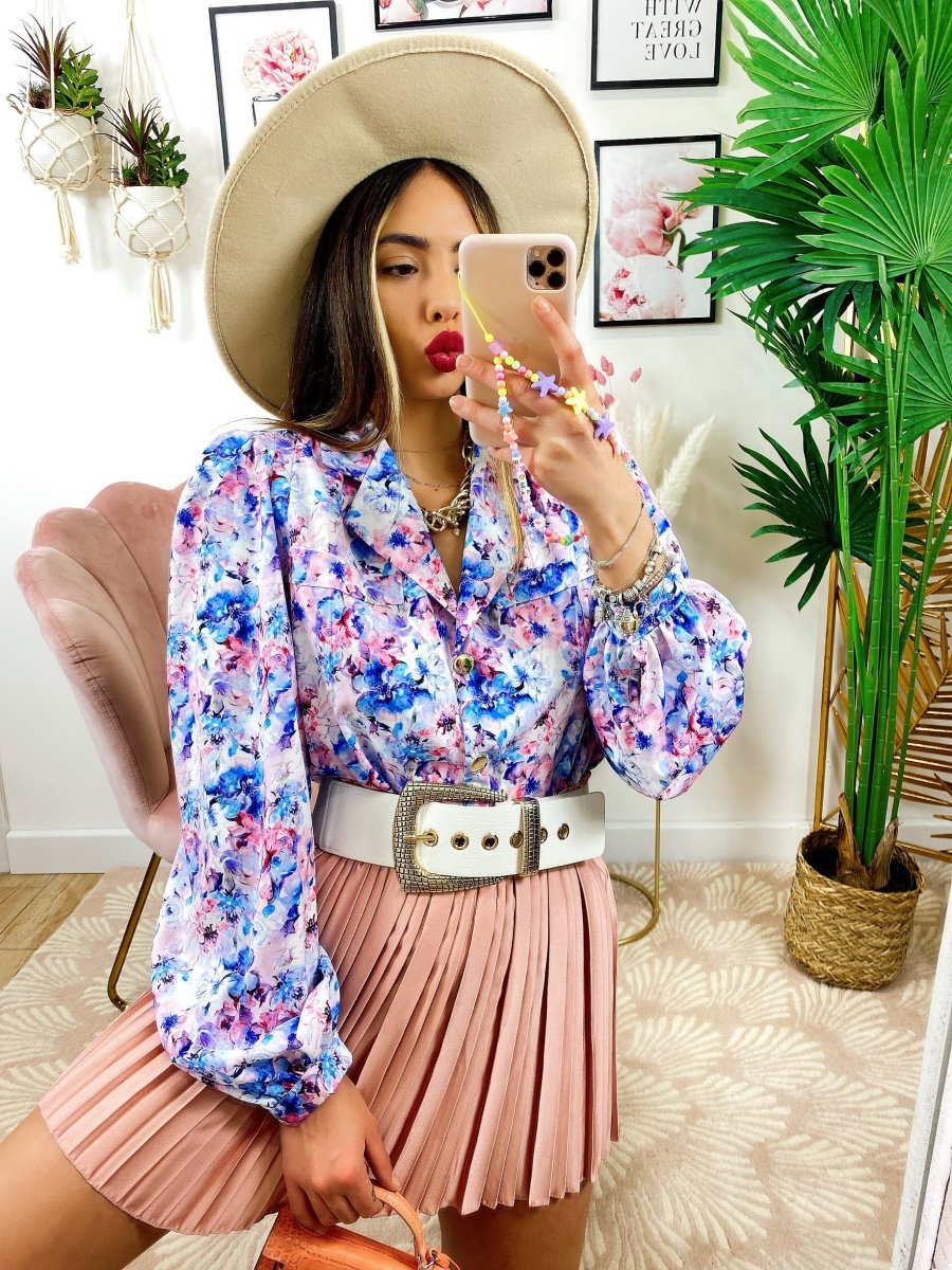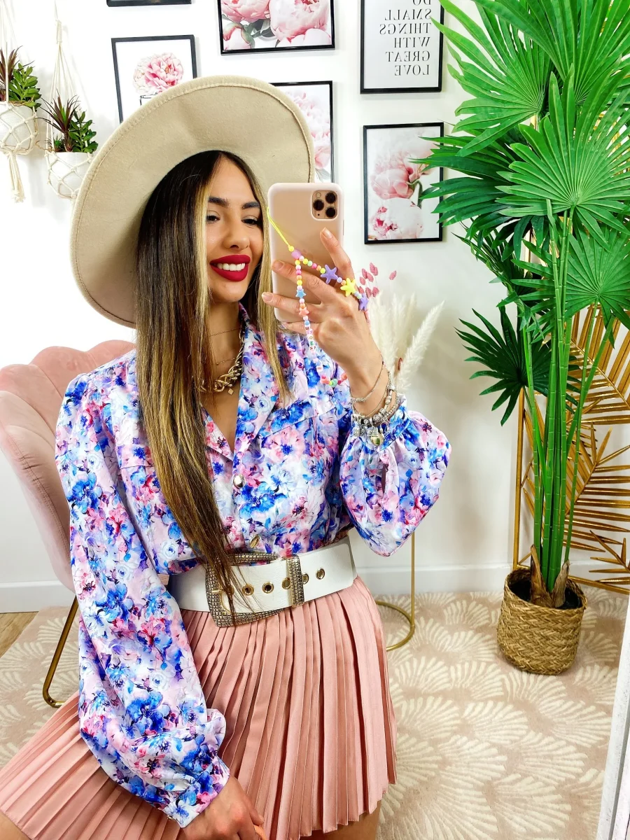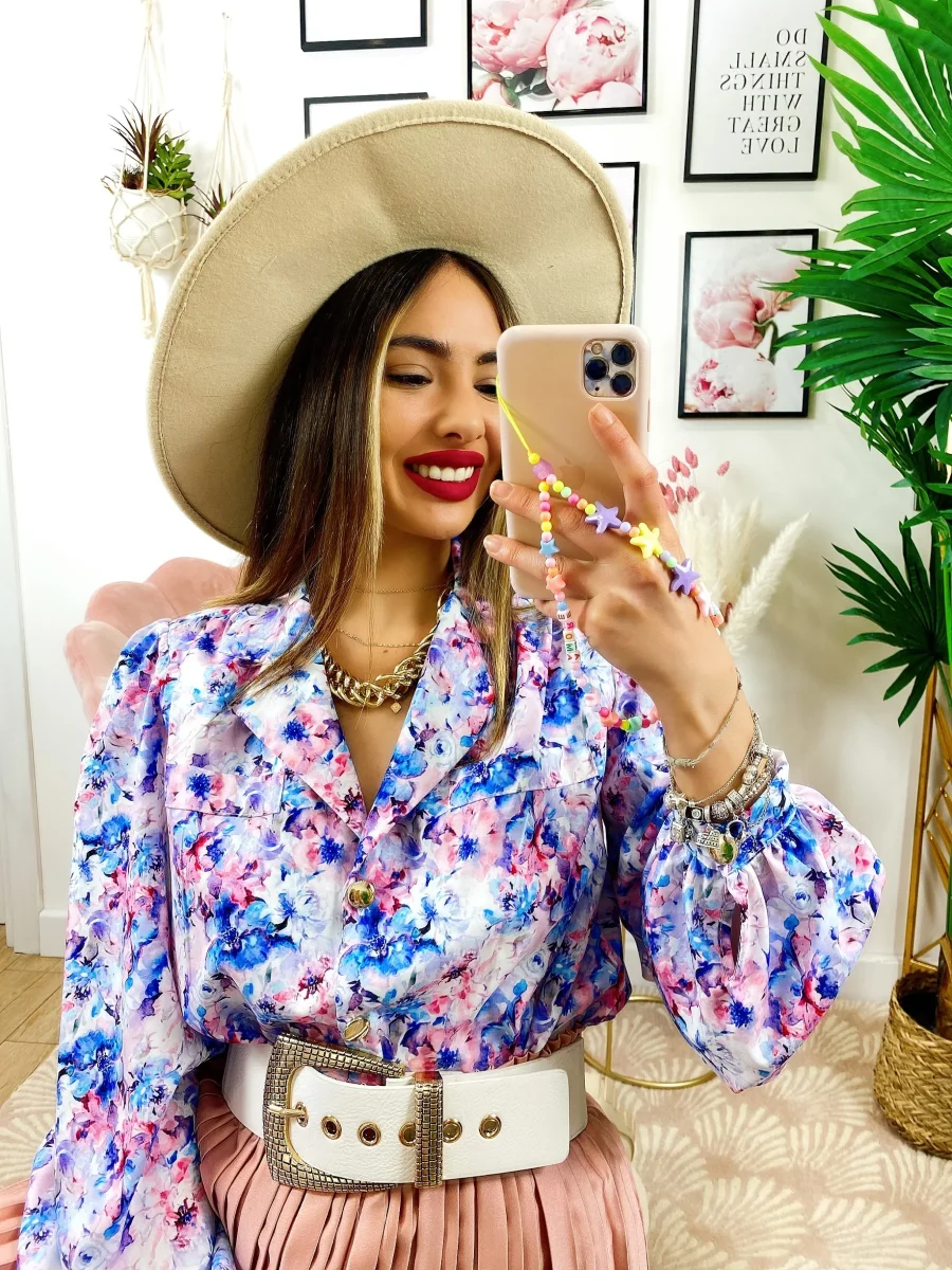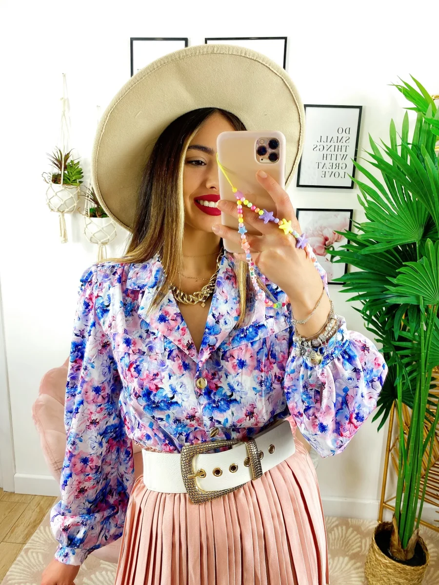 Camicia fiorata sfumature azzurre Vestibilità morbida.