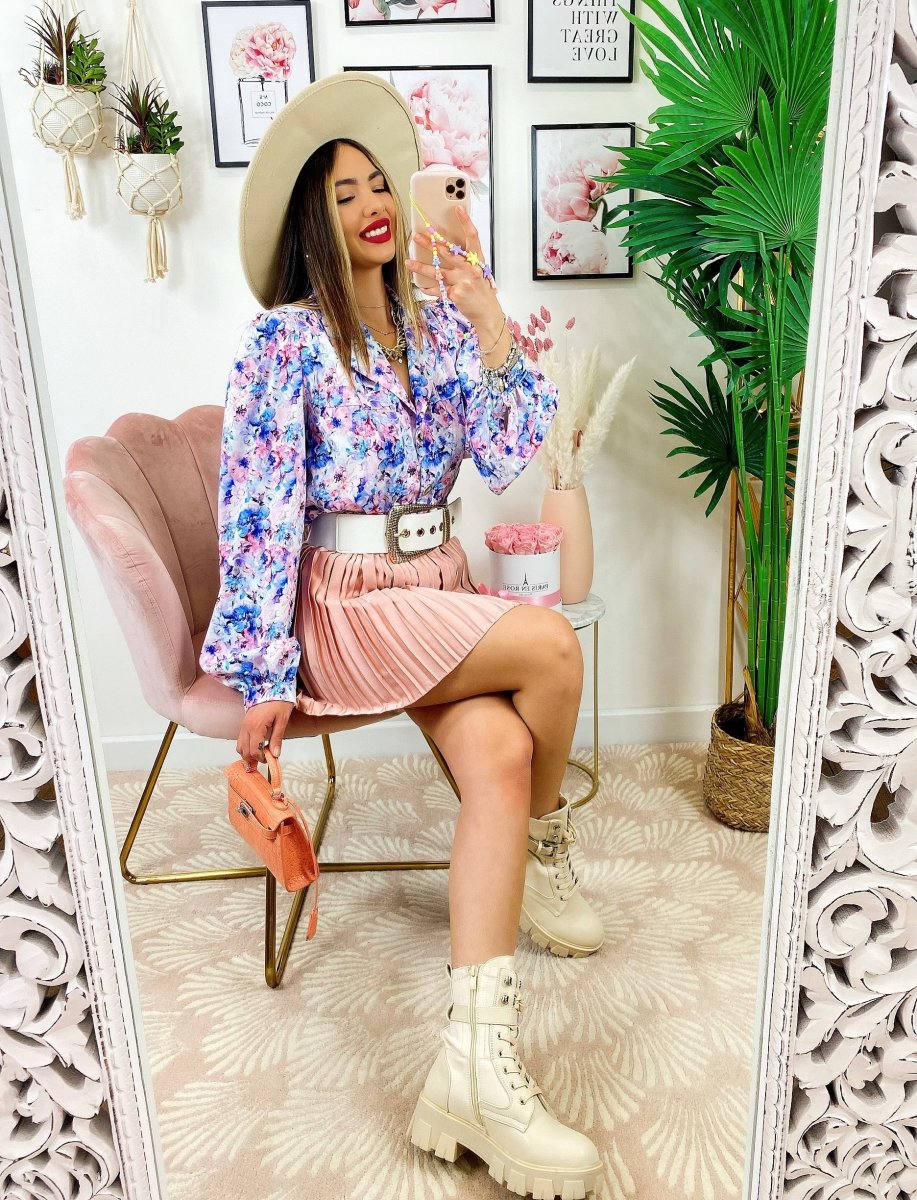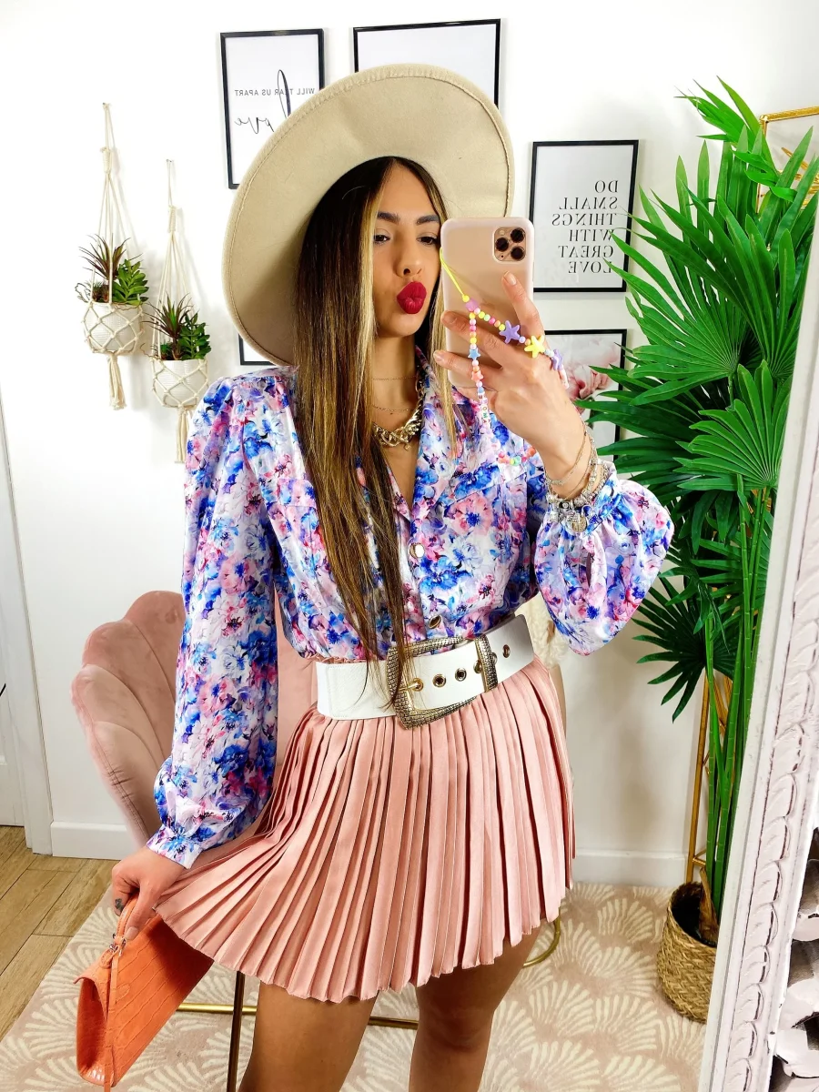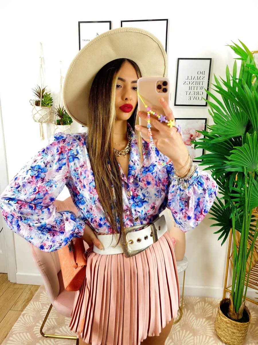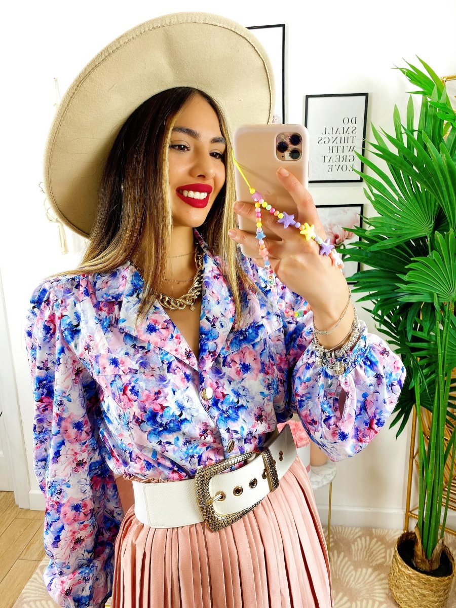 Camicia fiorata sfumature azzurre Vestibilità morbida.