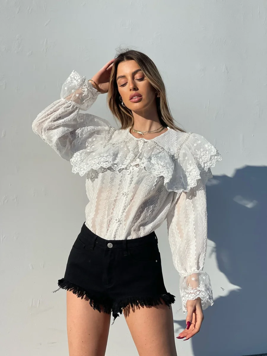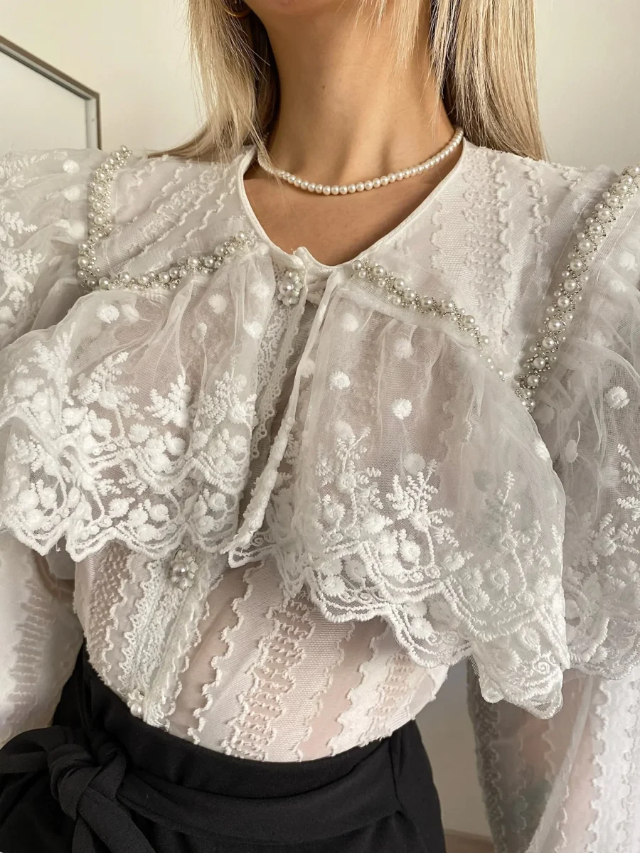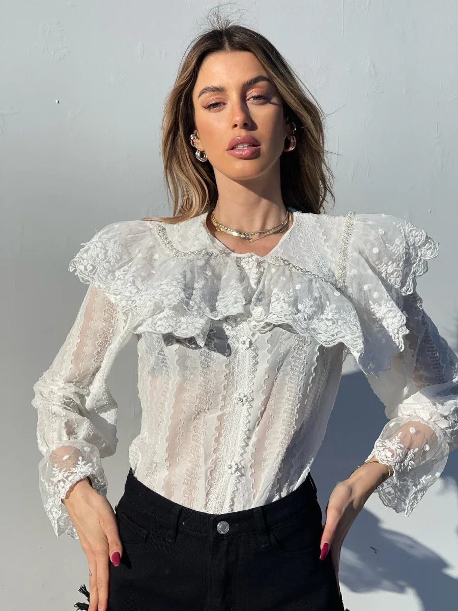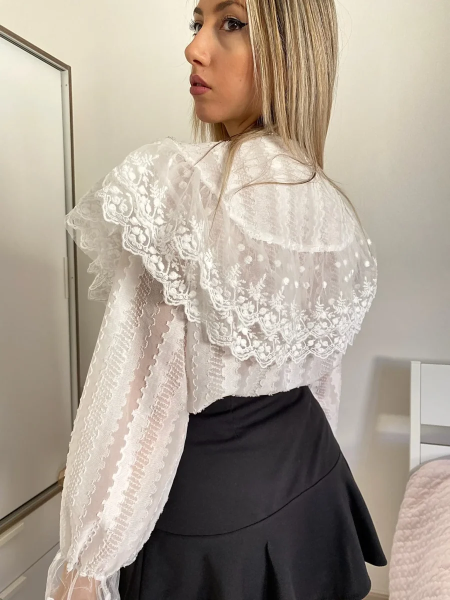 Camicia di altissima qualità in pizzo con maxi collo e bottoni gioiello.