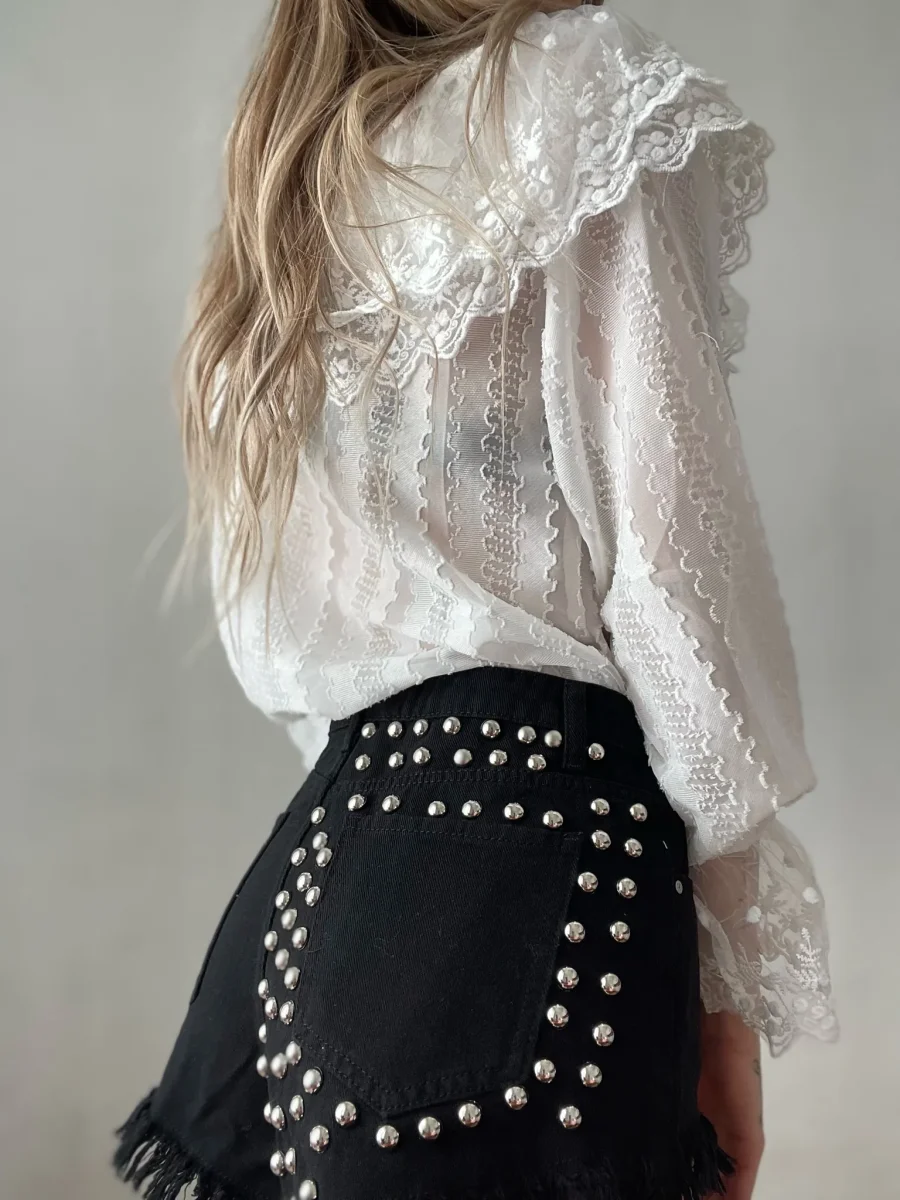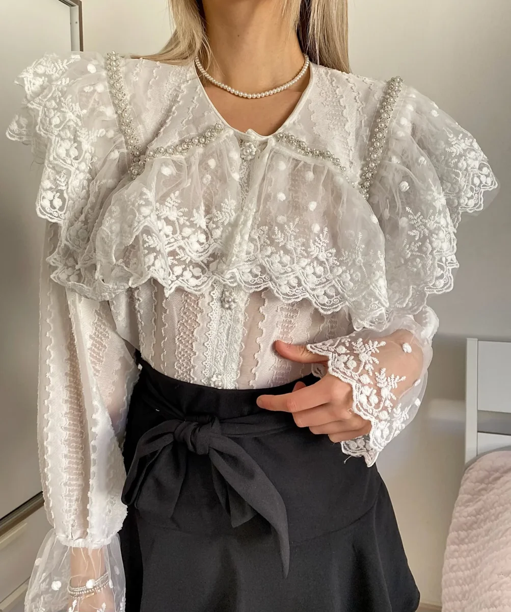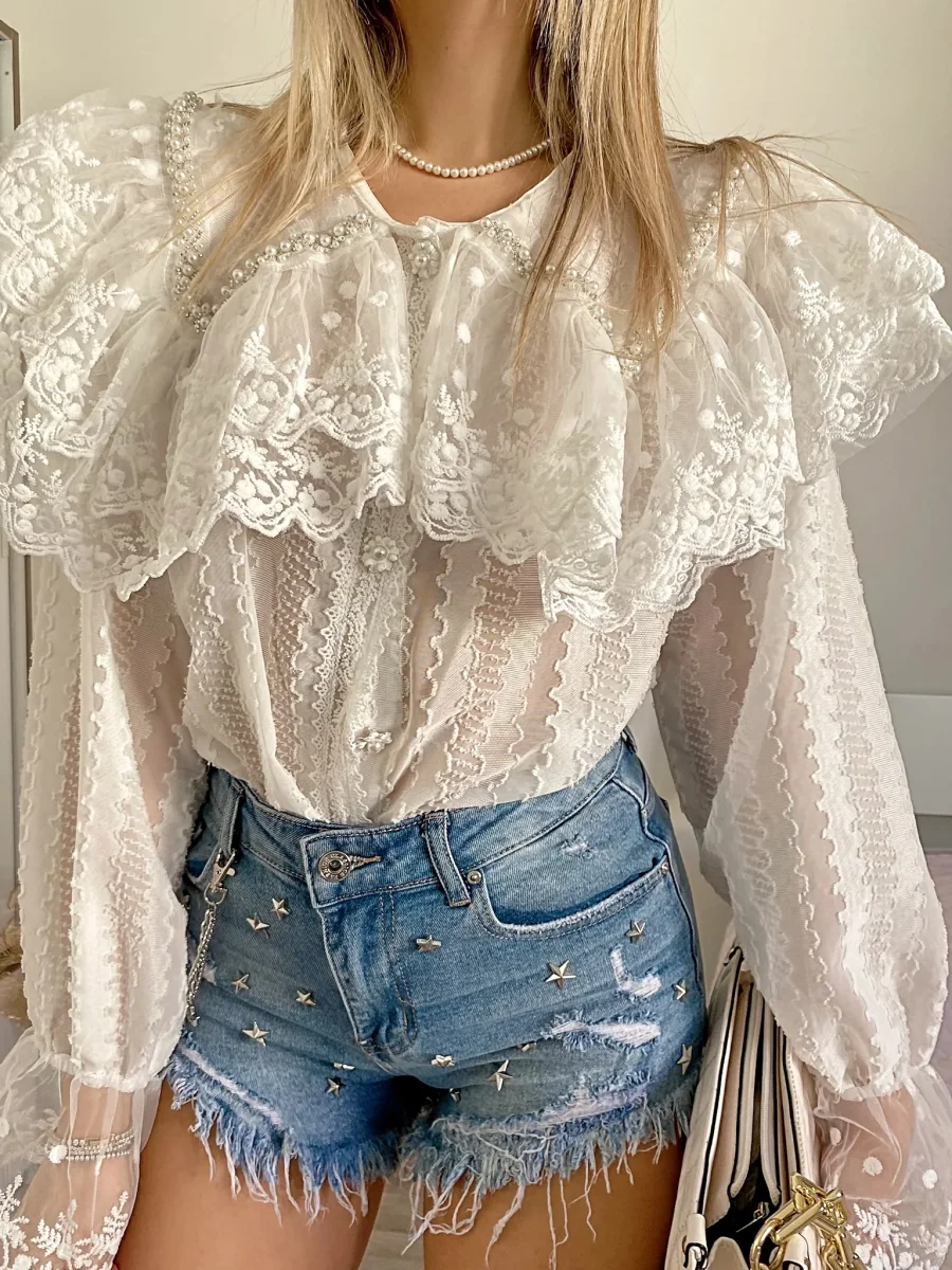 Camicia di altissima qualità in pizzo con maxi collo e bottoni gioiello.