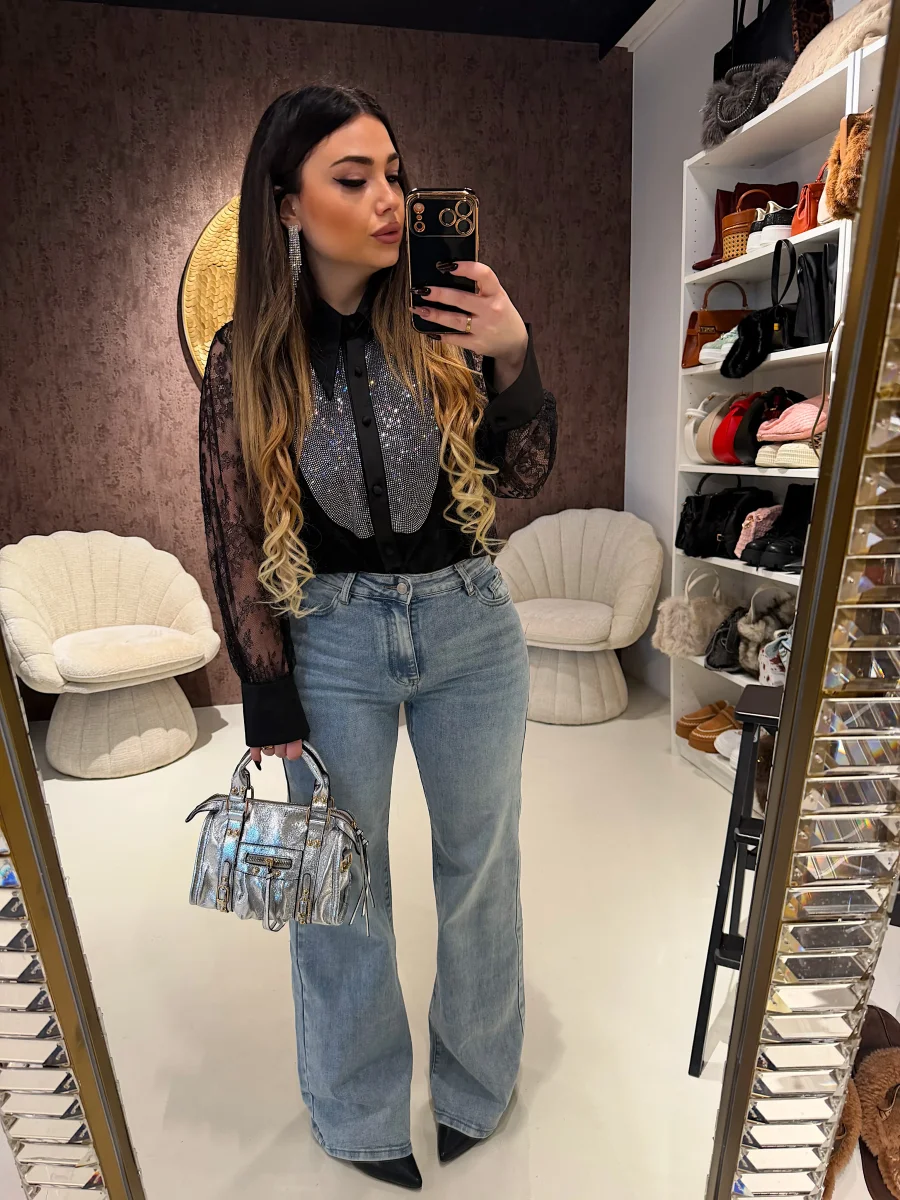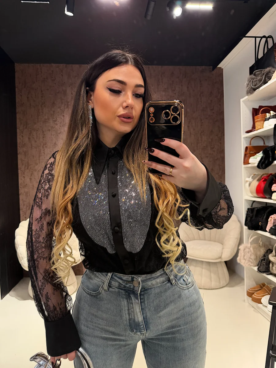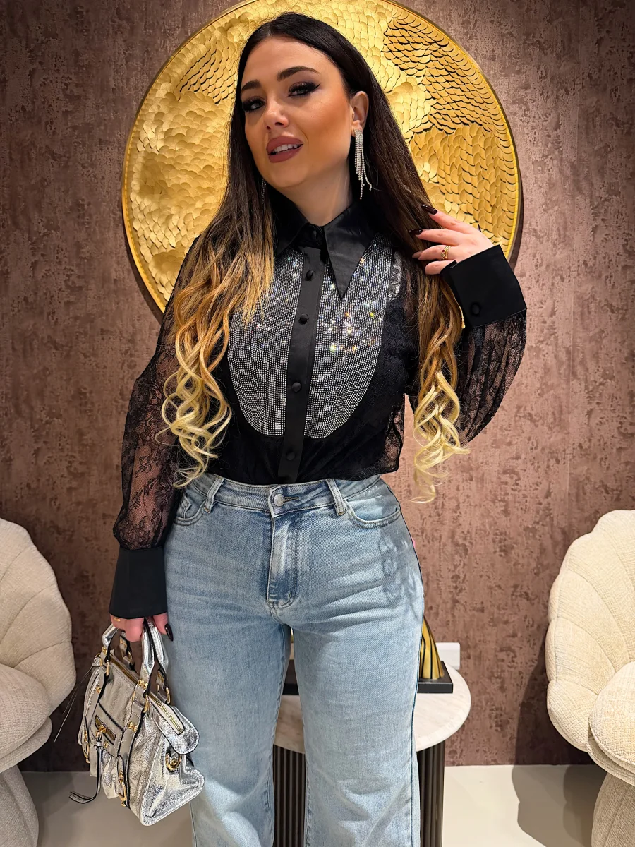 Camicia elegante e sofisticata realizzata in delicato pizzo nero semi-trasparente, impreziosita da un raffinato inserto frontale con micro strass luminosi effetto gioiello. Il colletto strutturato e i polsini in tessuto liscio creano un contrasto chic che valorizza il design. Chiusura frontale con bottoni rivestiti. Perfetta per look serali, eventi speciali o outfit fashion dal carattere deciso e femminile. Da indossare con pantaloni sartoriali, gonne o denim per un mix glam irresistibile.