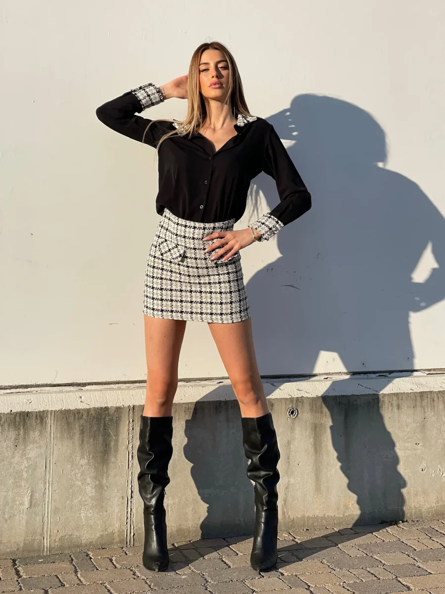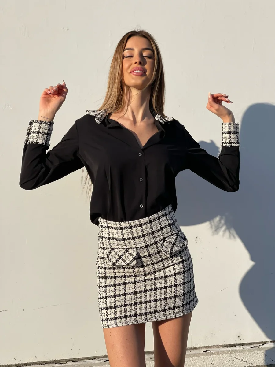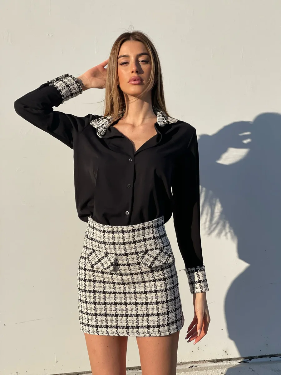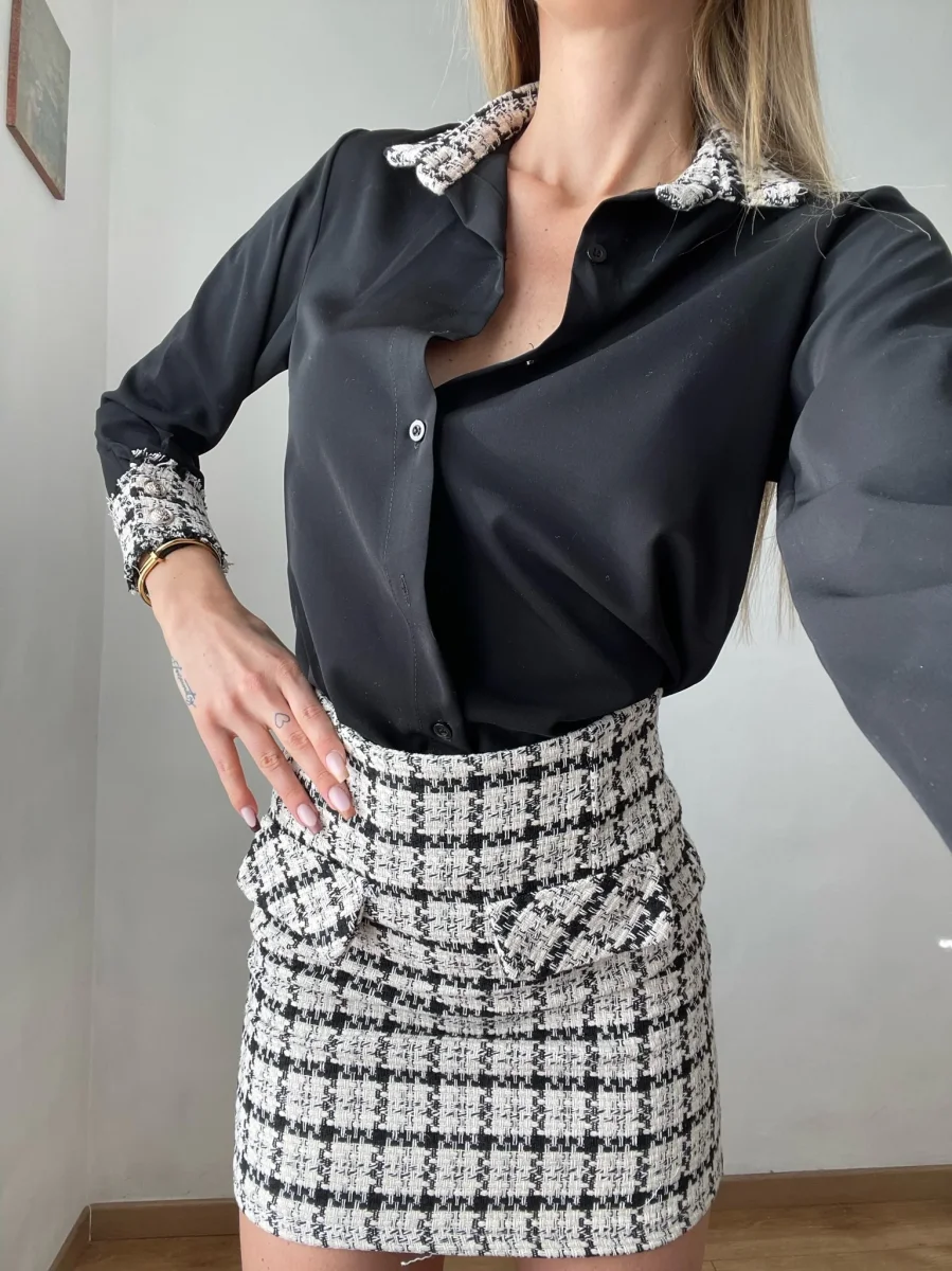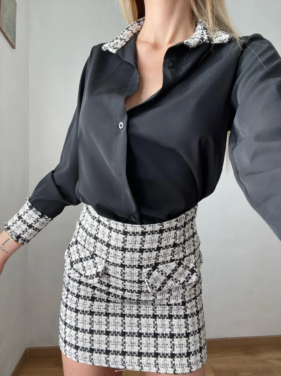 Camicia semplice nera con dettaglio in tweed sulle spalline e polsi. Bottoni gioiello