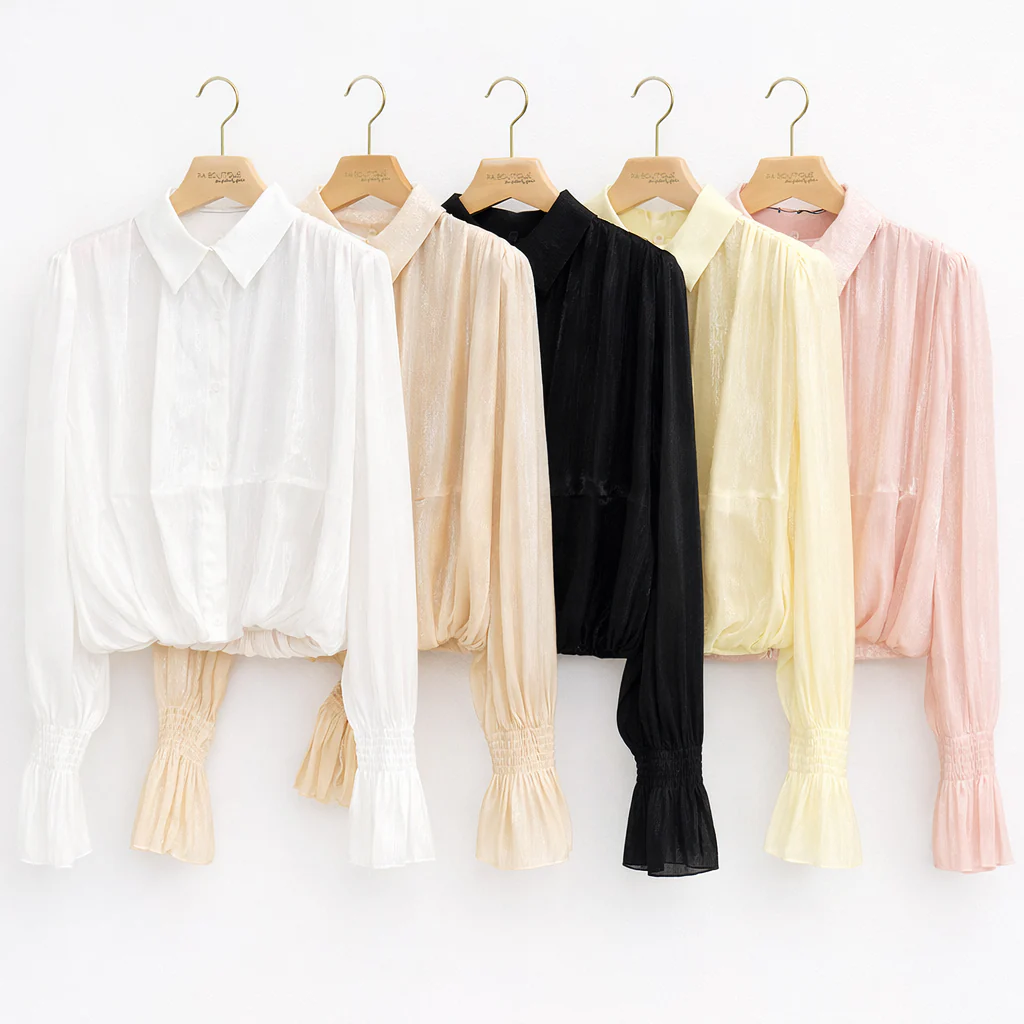 Le maniche morbide con polsini arricciati e volant creano un look romantico e sofisticato, mentre il fit fluido valorizza la silhouette senza segnare. Ideale da abbinare a jeans, shorts o pantaloni eleganti, è perfetta sia per il giorno che per la sera.