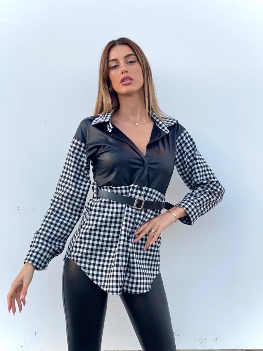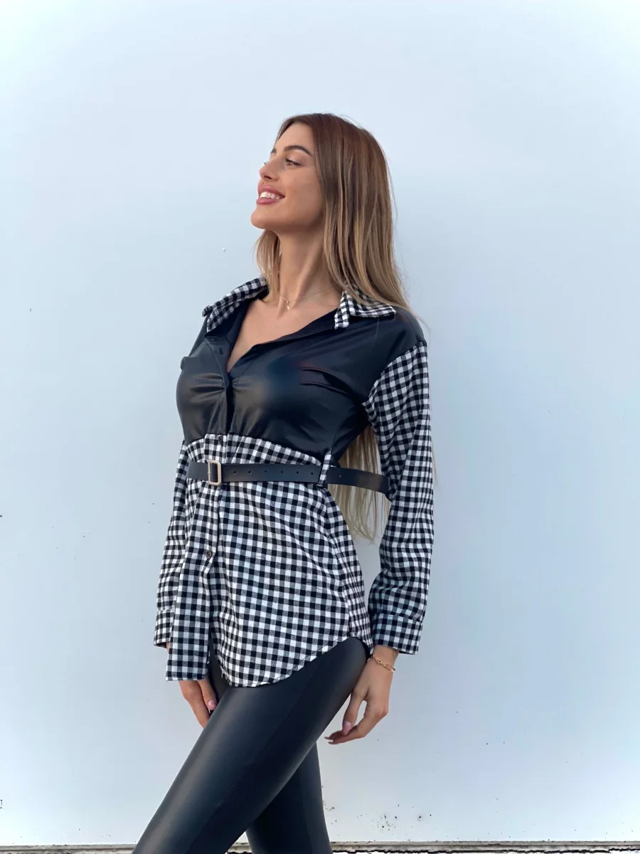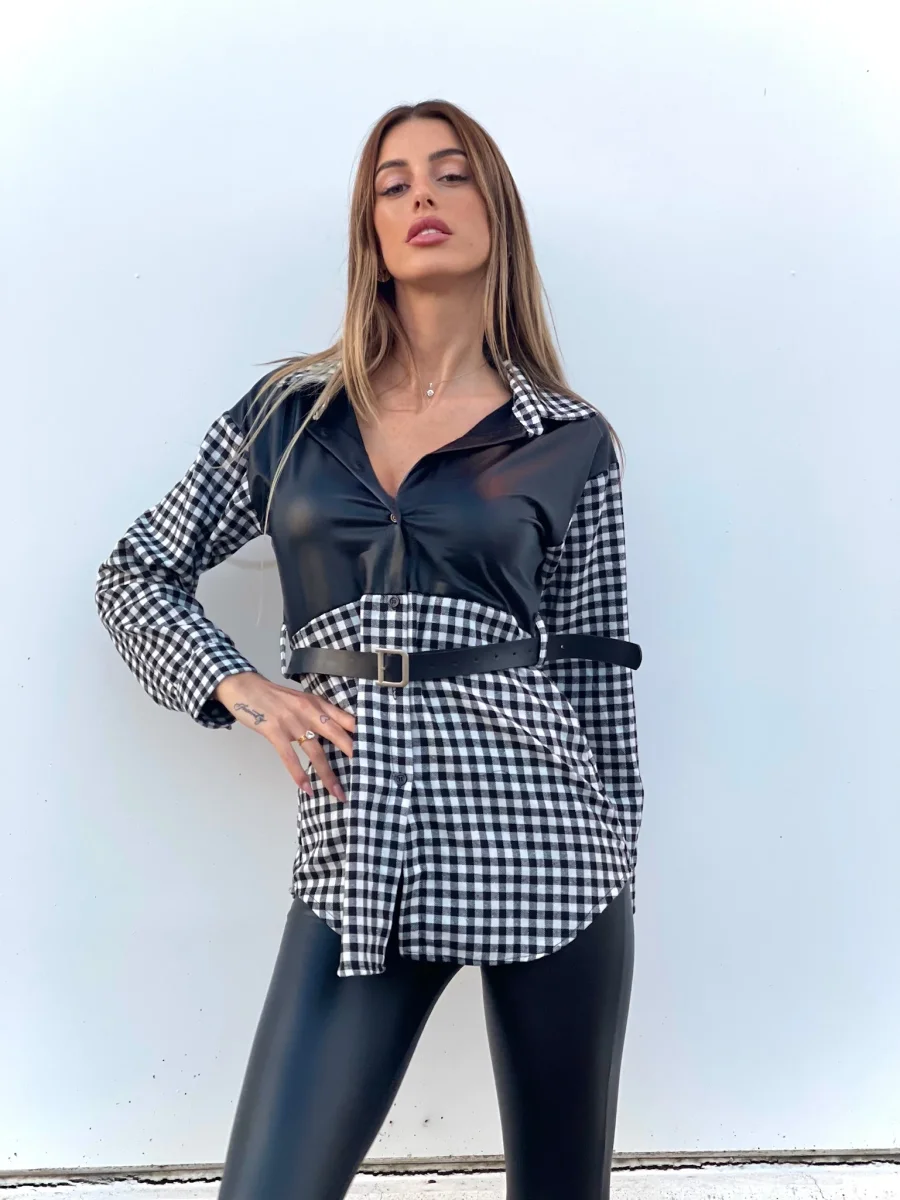 Camicione a quadri bianco e nero con dettagli in pelle. Cintura con D in color argento.