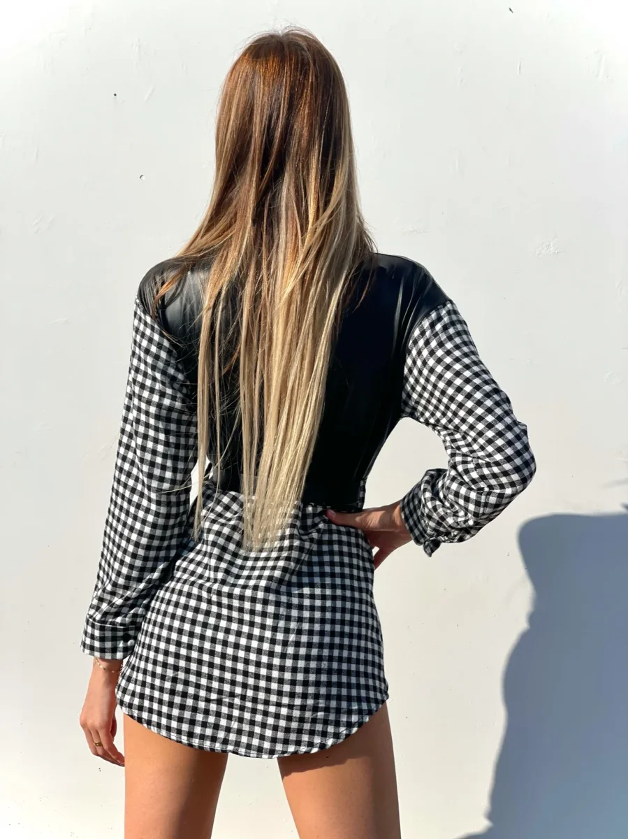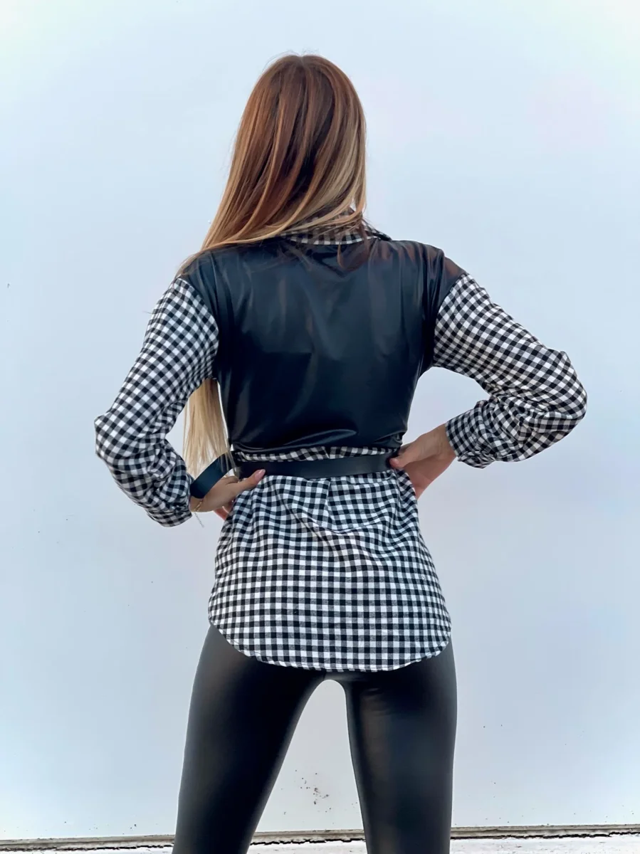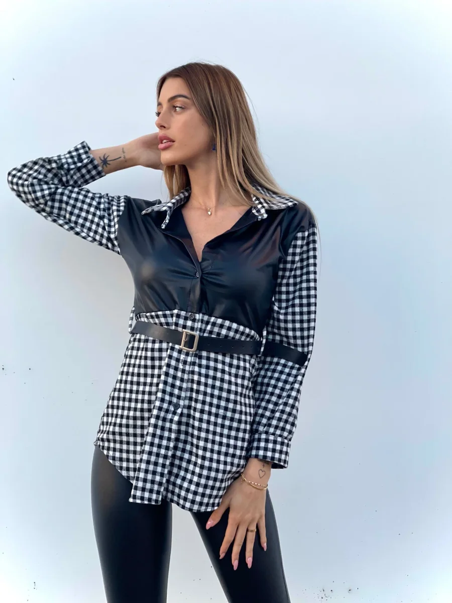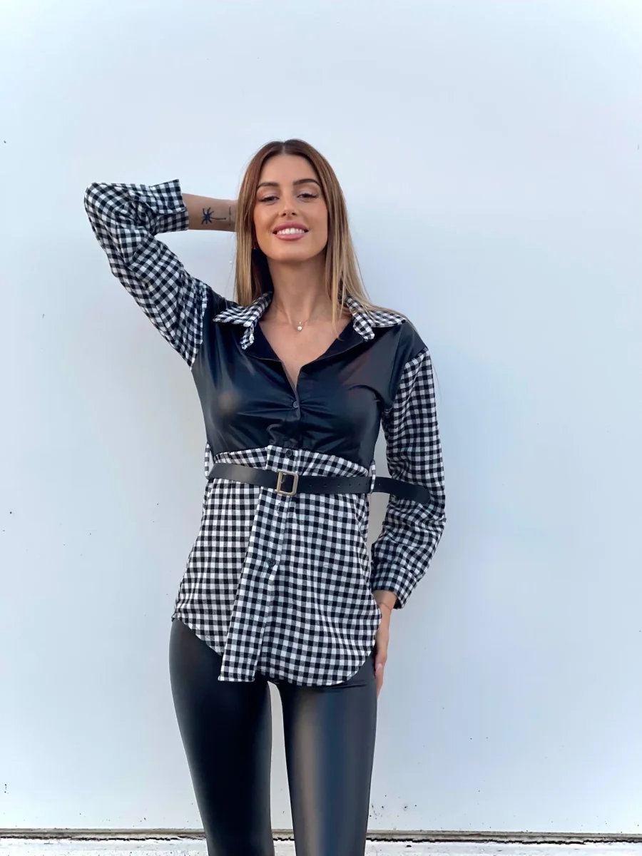 Camicione a quadri bianco e nero con dettagli in pelle. Cintura con D in color argento.