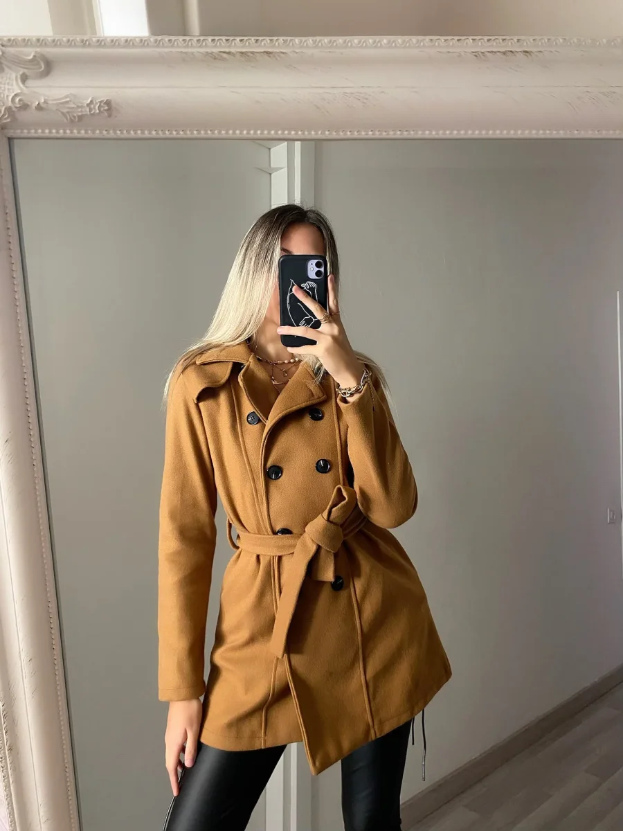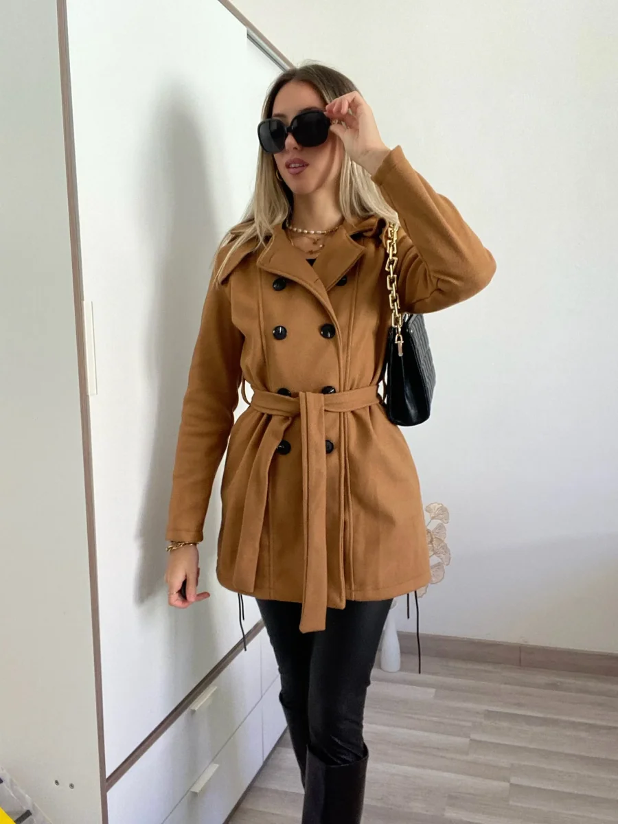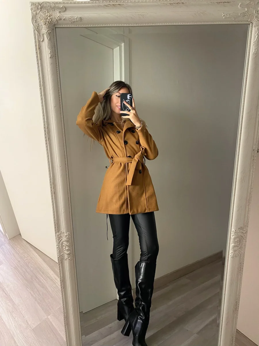 Cappotto in panno con fodera interna con cintura e particolare doppio petto