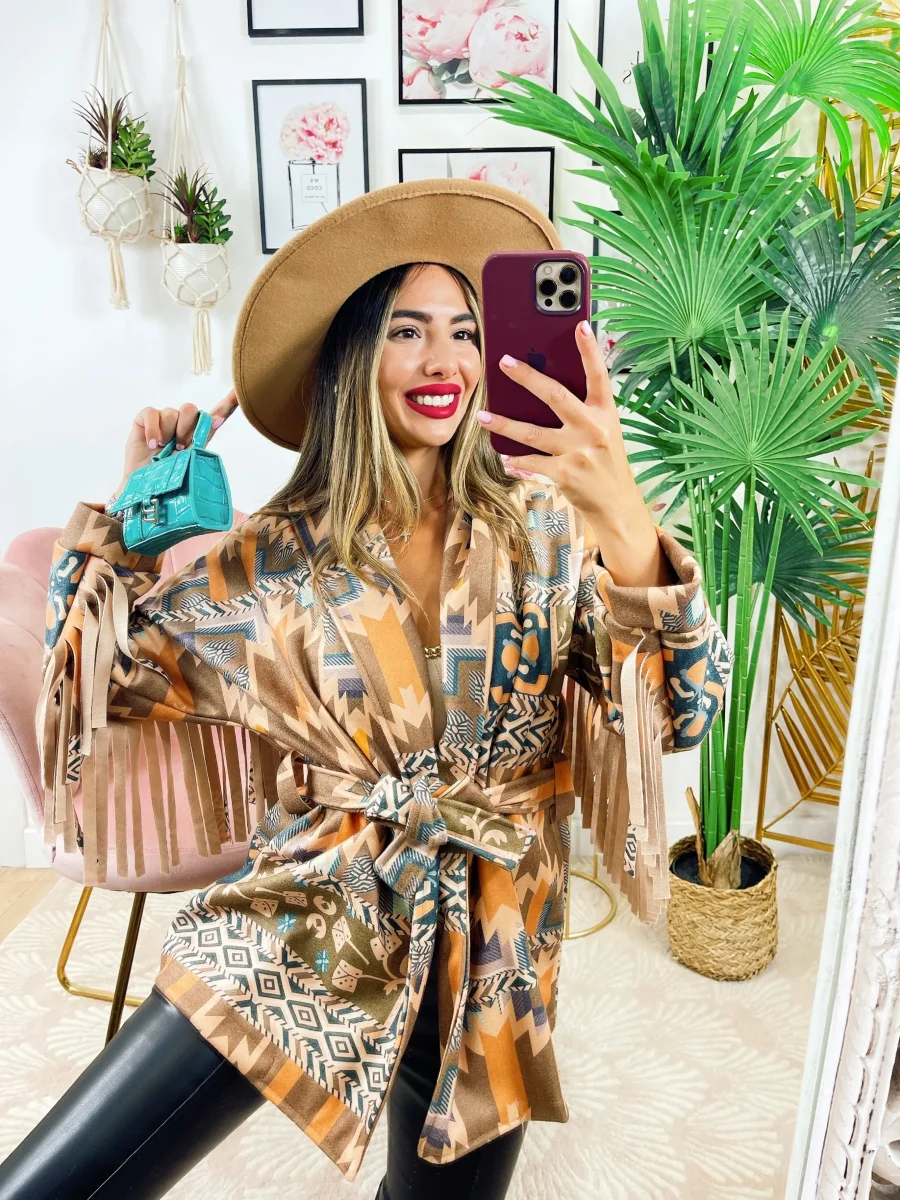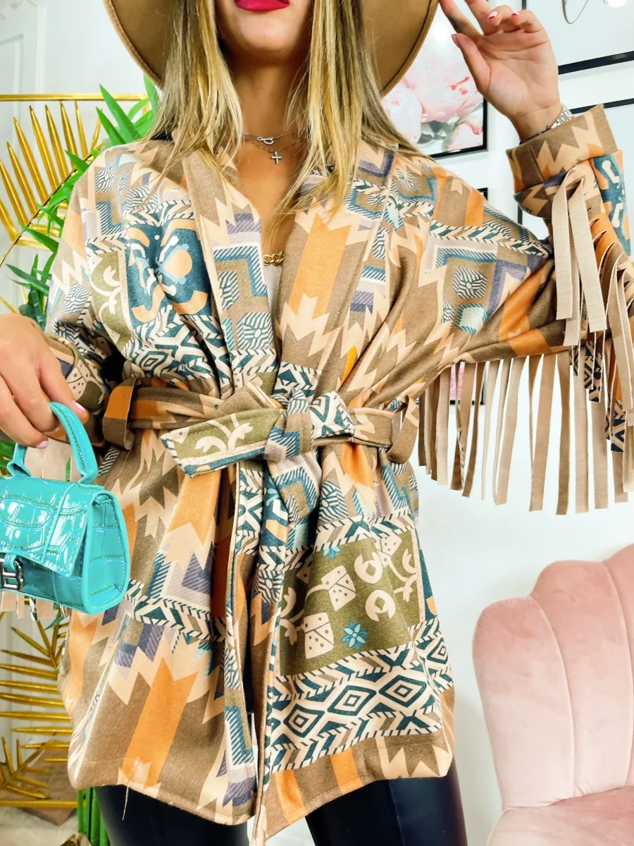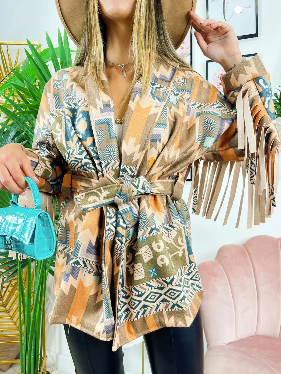 Cappotto in tessuto medio pesante con frange.