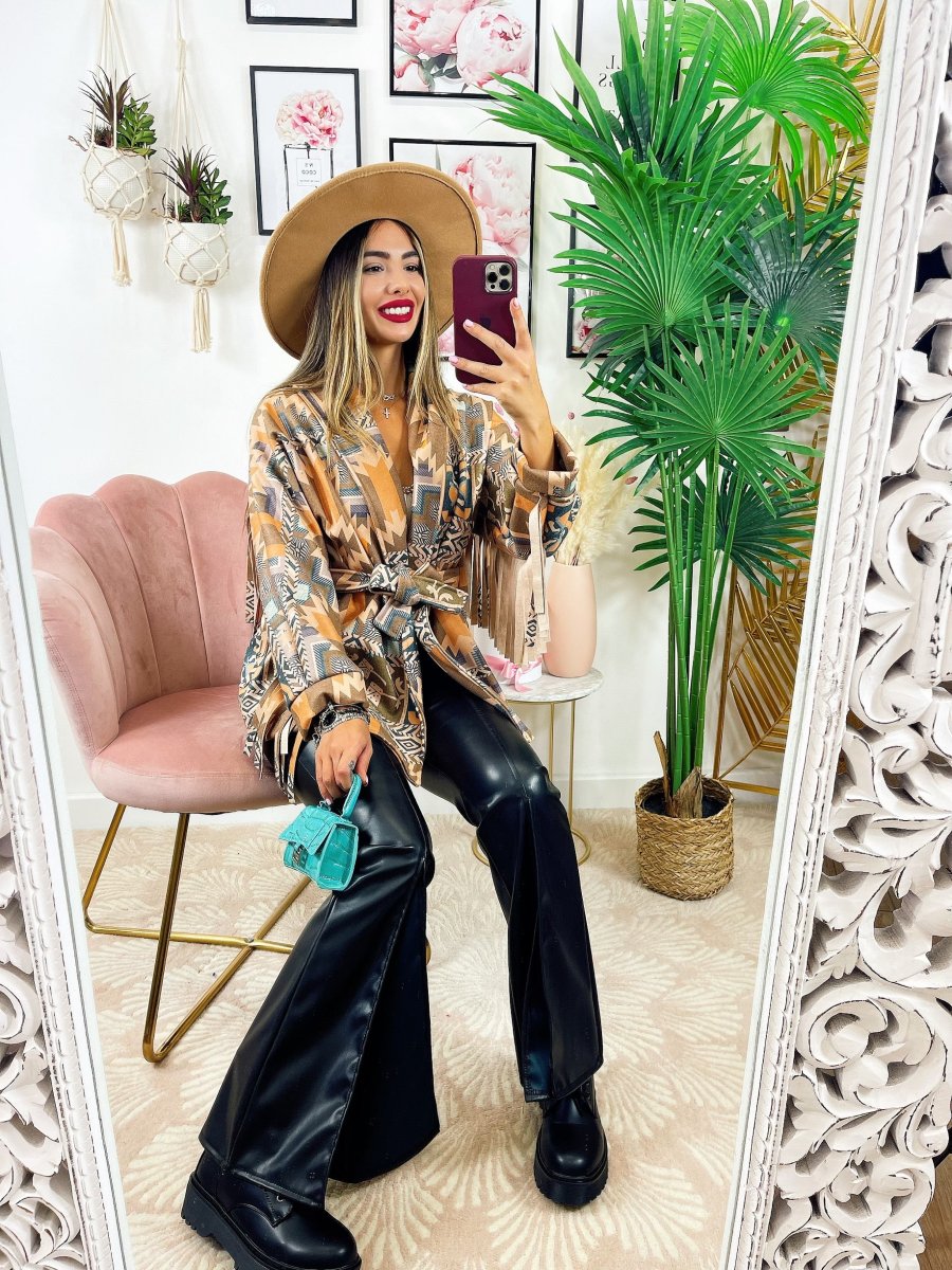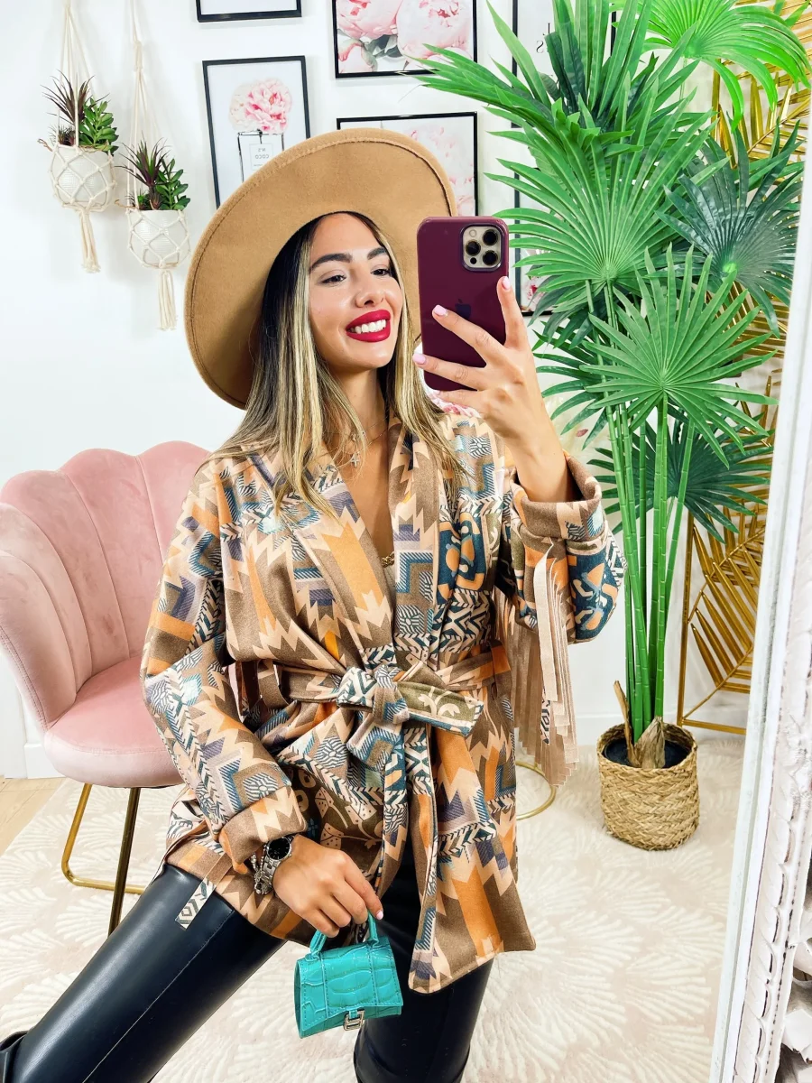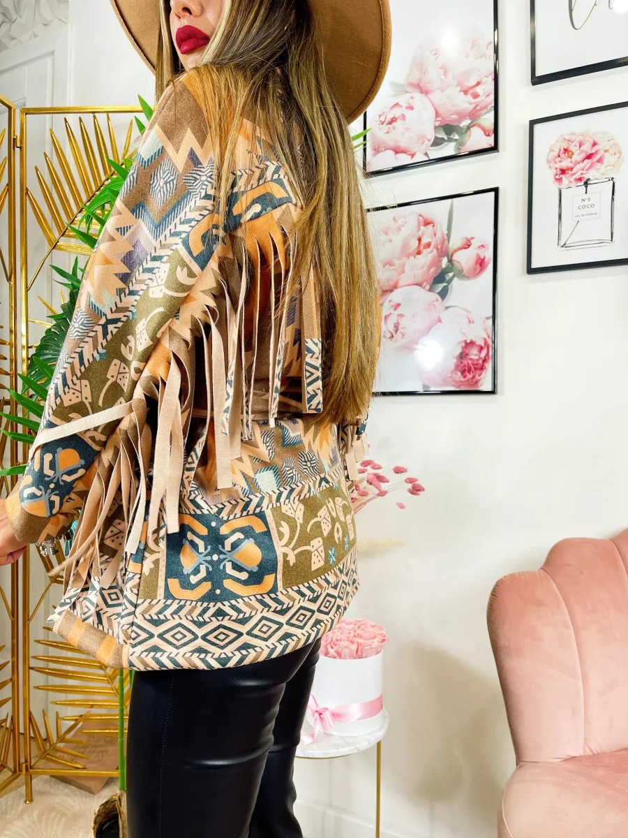 Cappotto in tessuto medio pesante con frange.