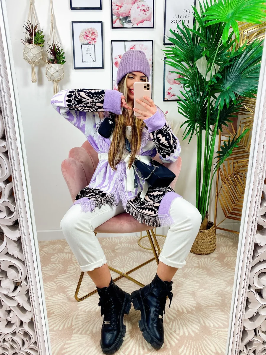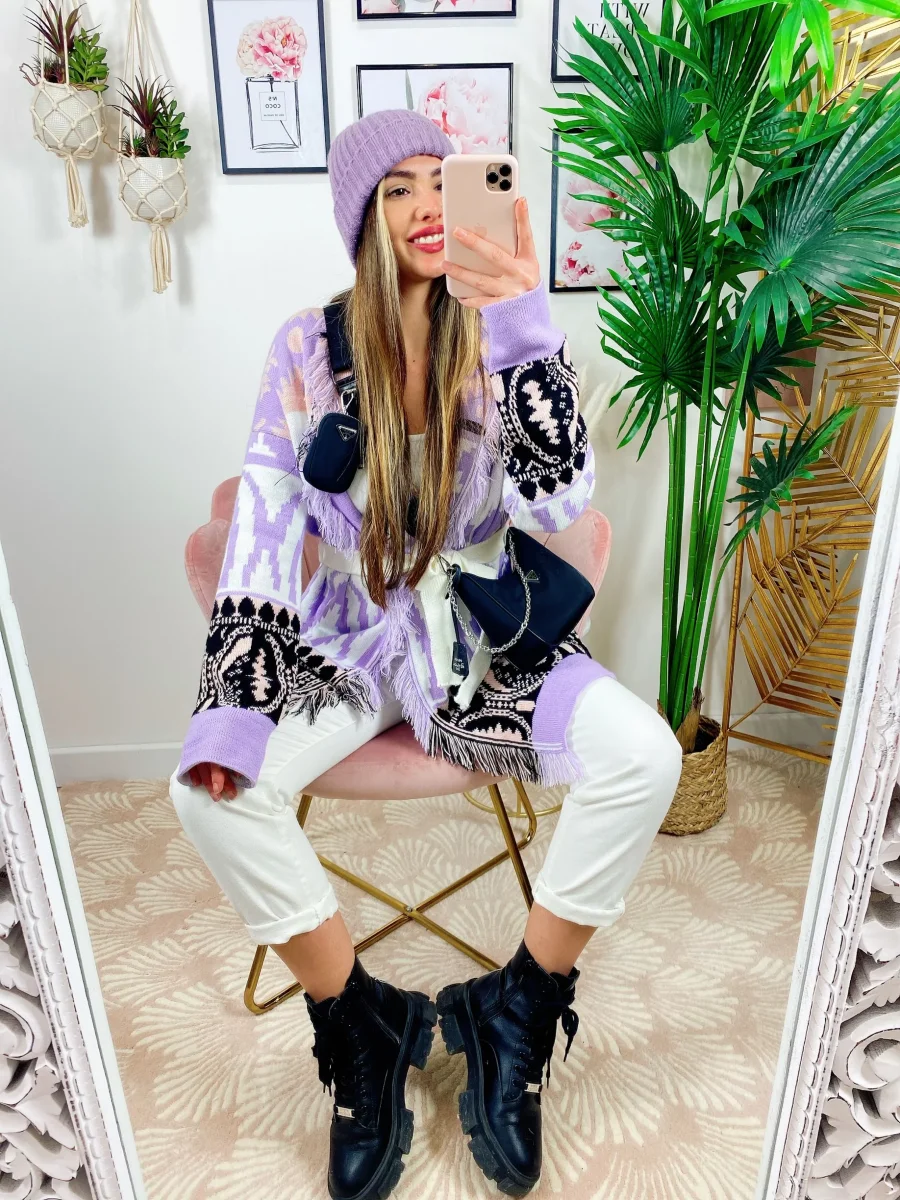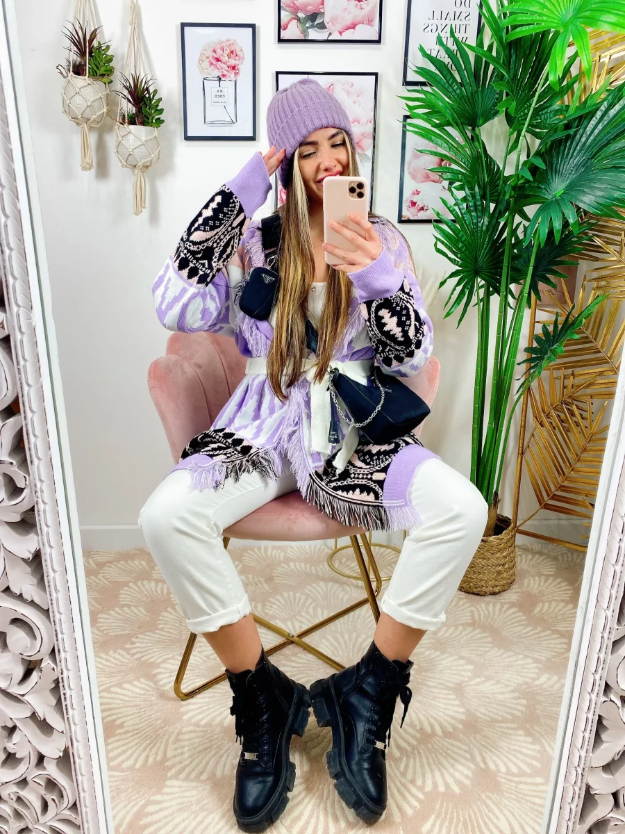 Cardigan in tessuto medio pesante con frange e cintura in vita. Alta qualità