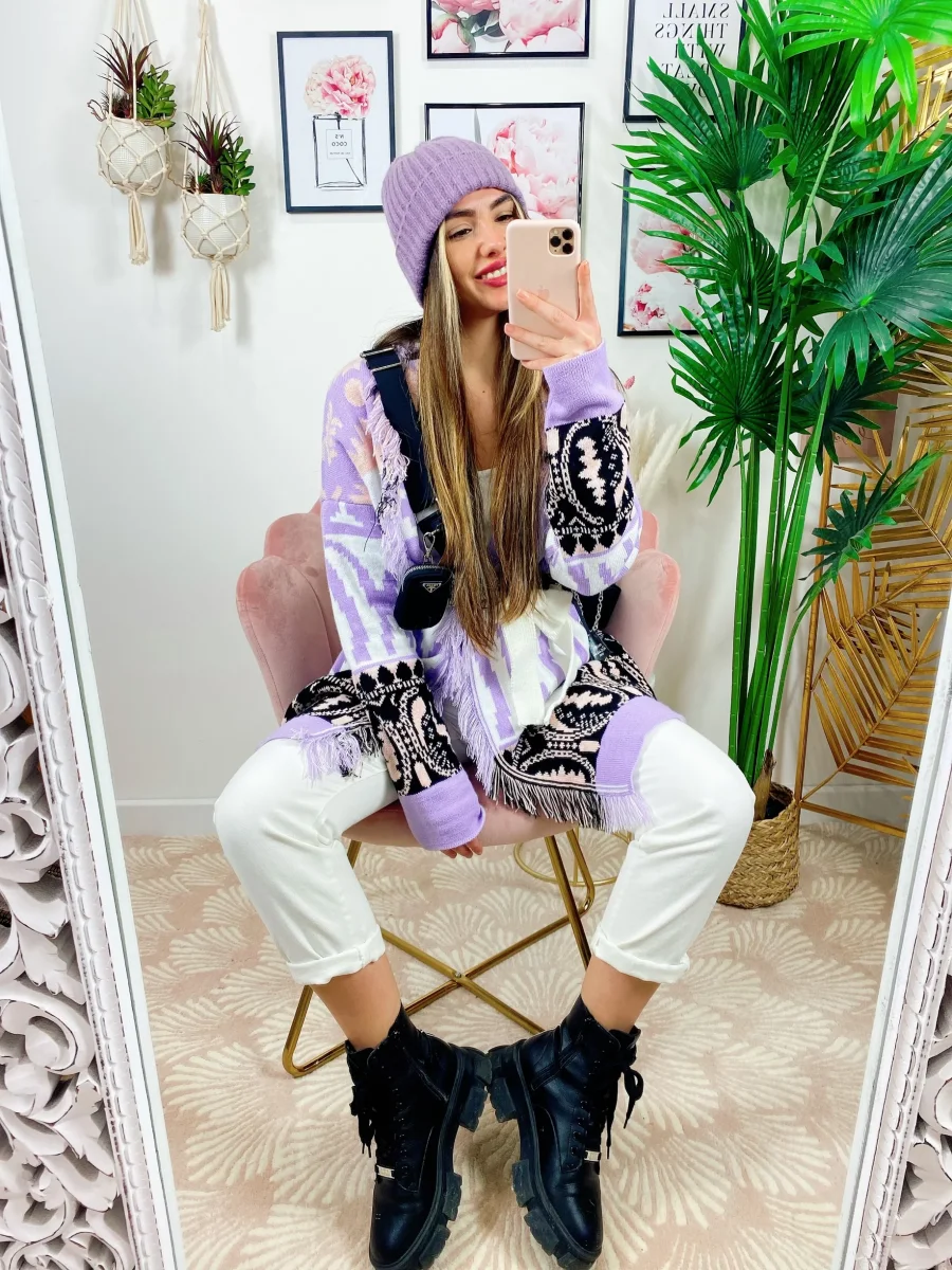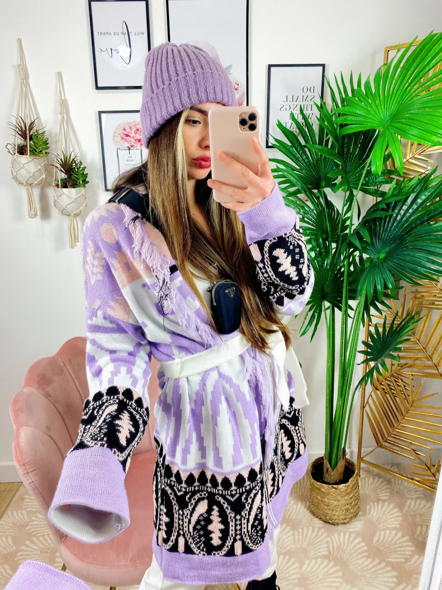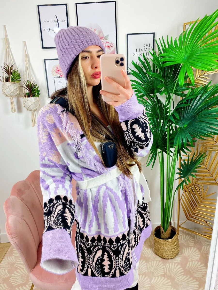 Cardigan in tessuto medio pesante con frange e cintura in vita. Alta qualità