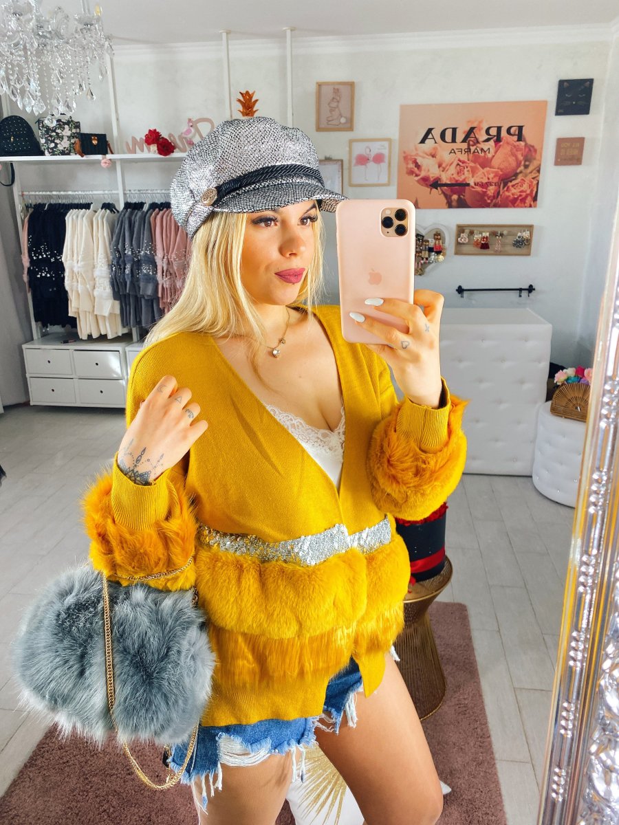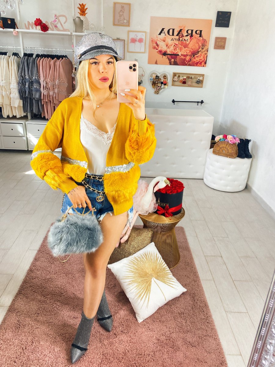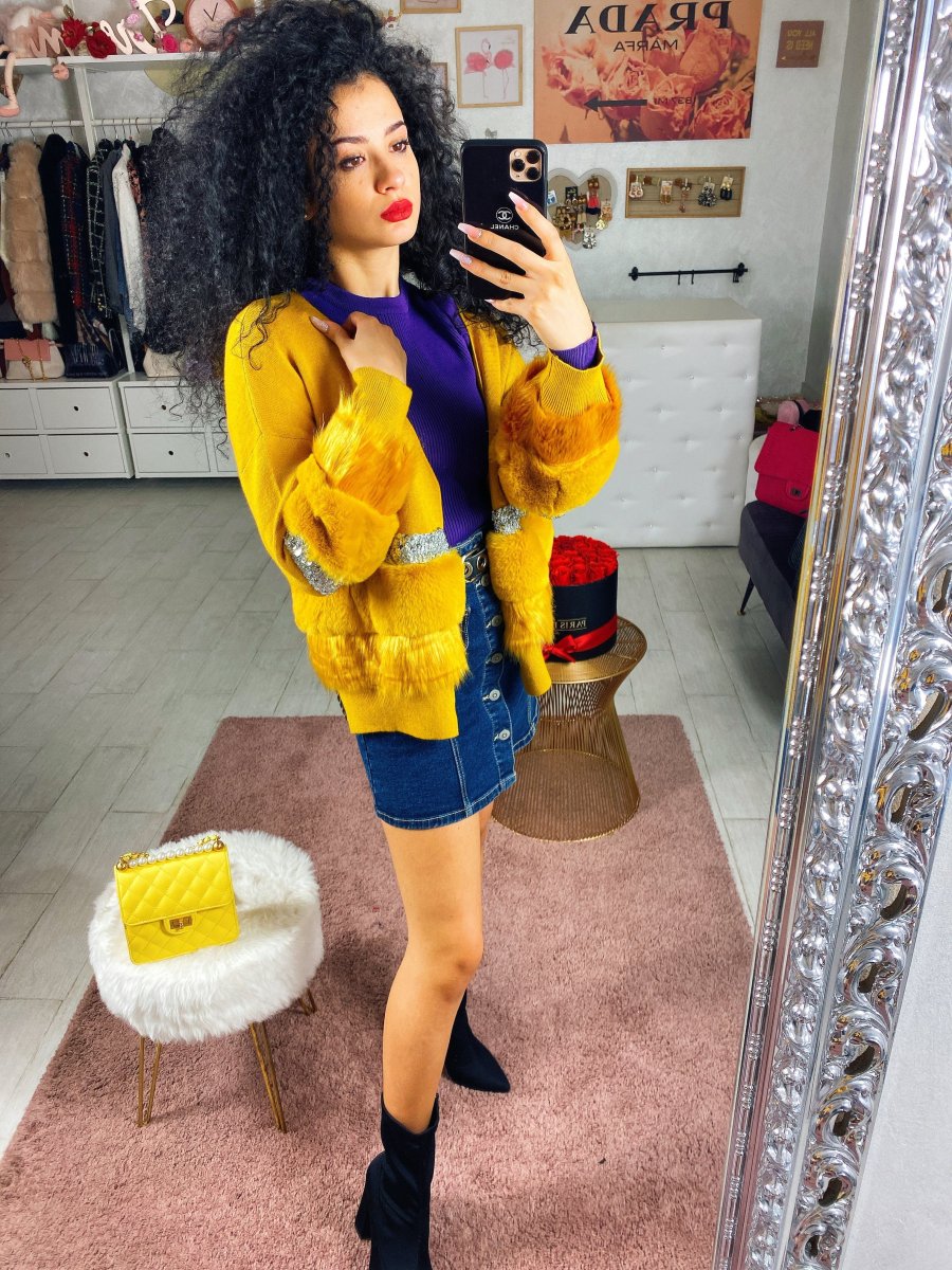 Cardigan in lana con pelliccia e strass. Tessuto morbido e caldo