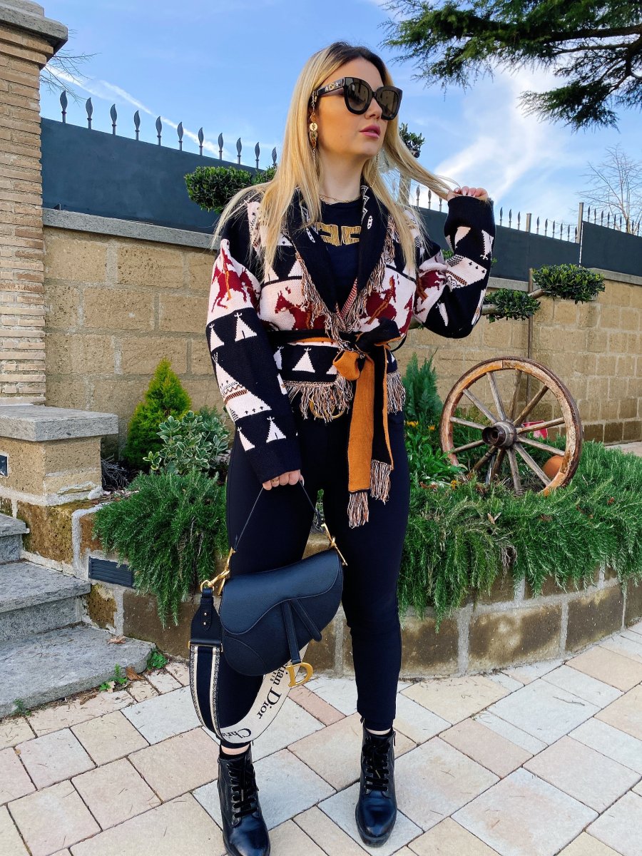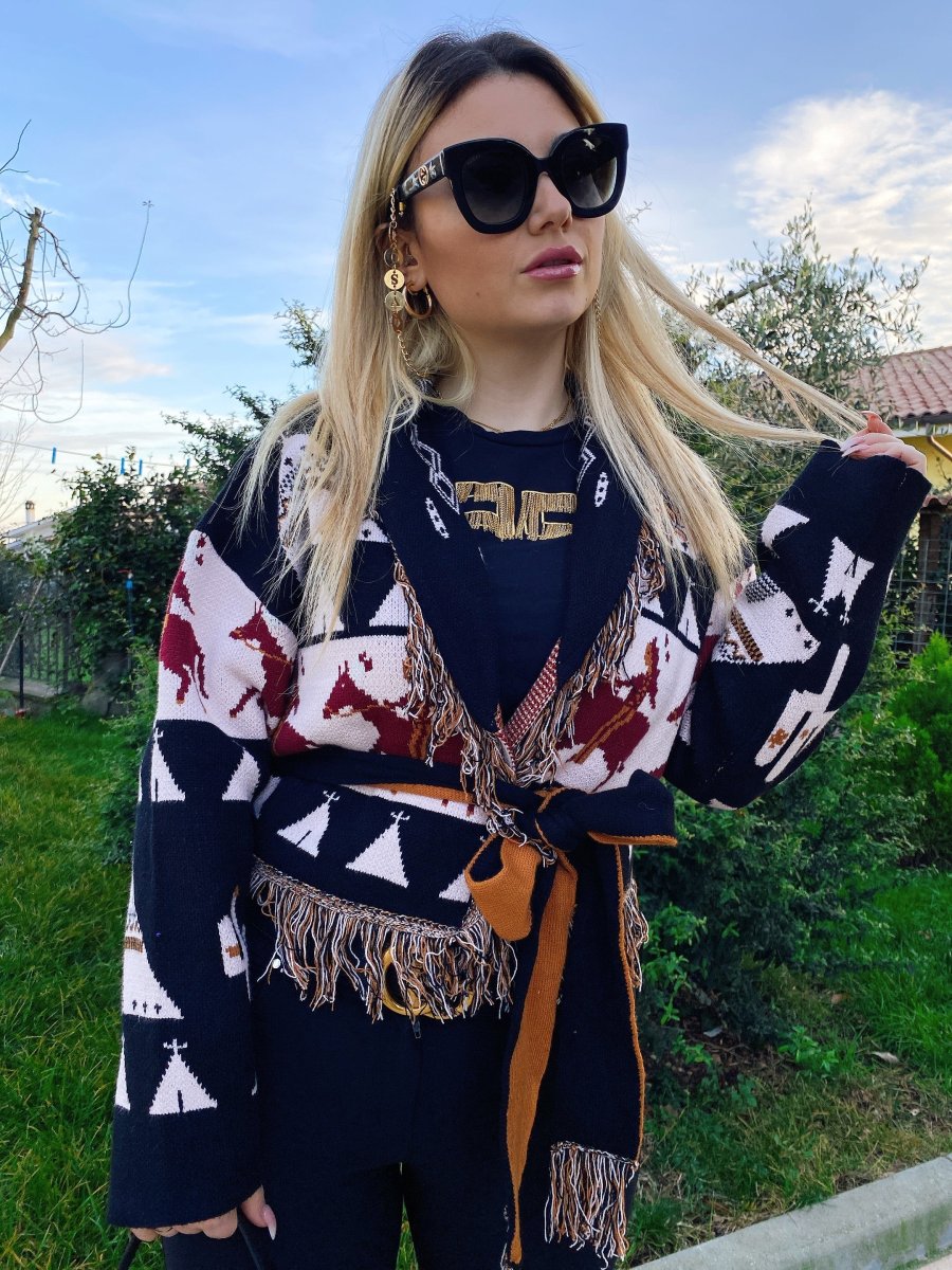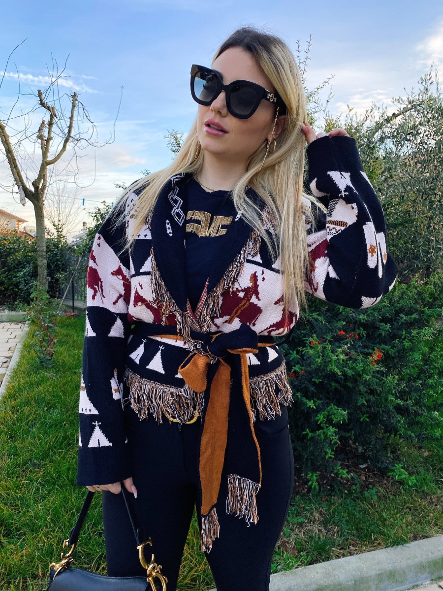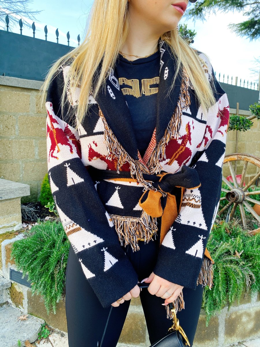 Cardigan corto frange e cinta con cavallo nero