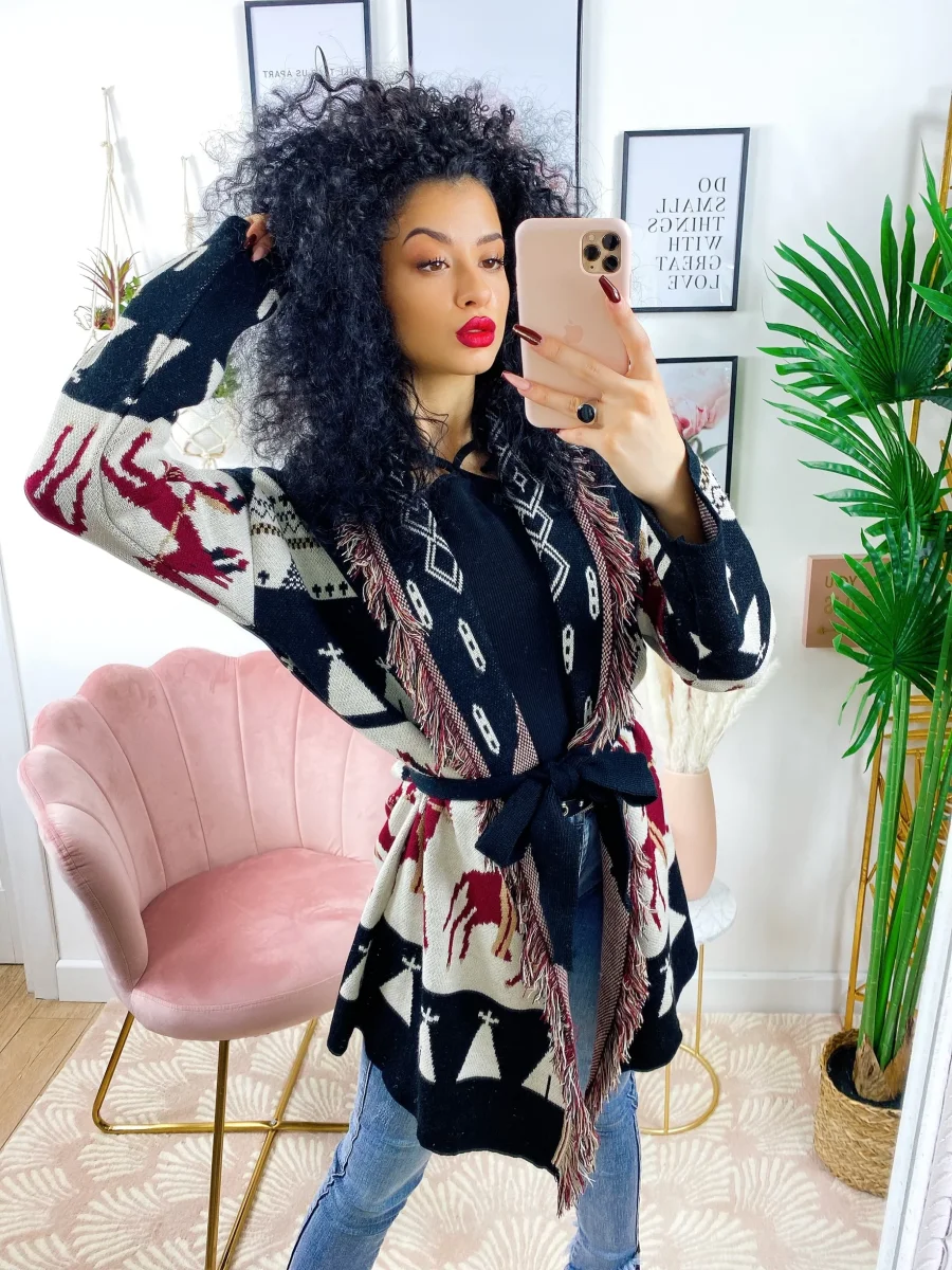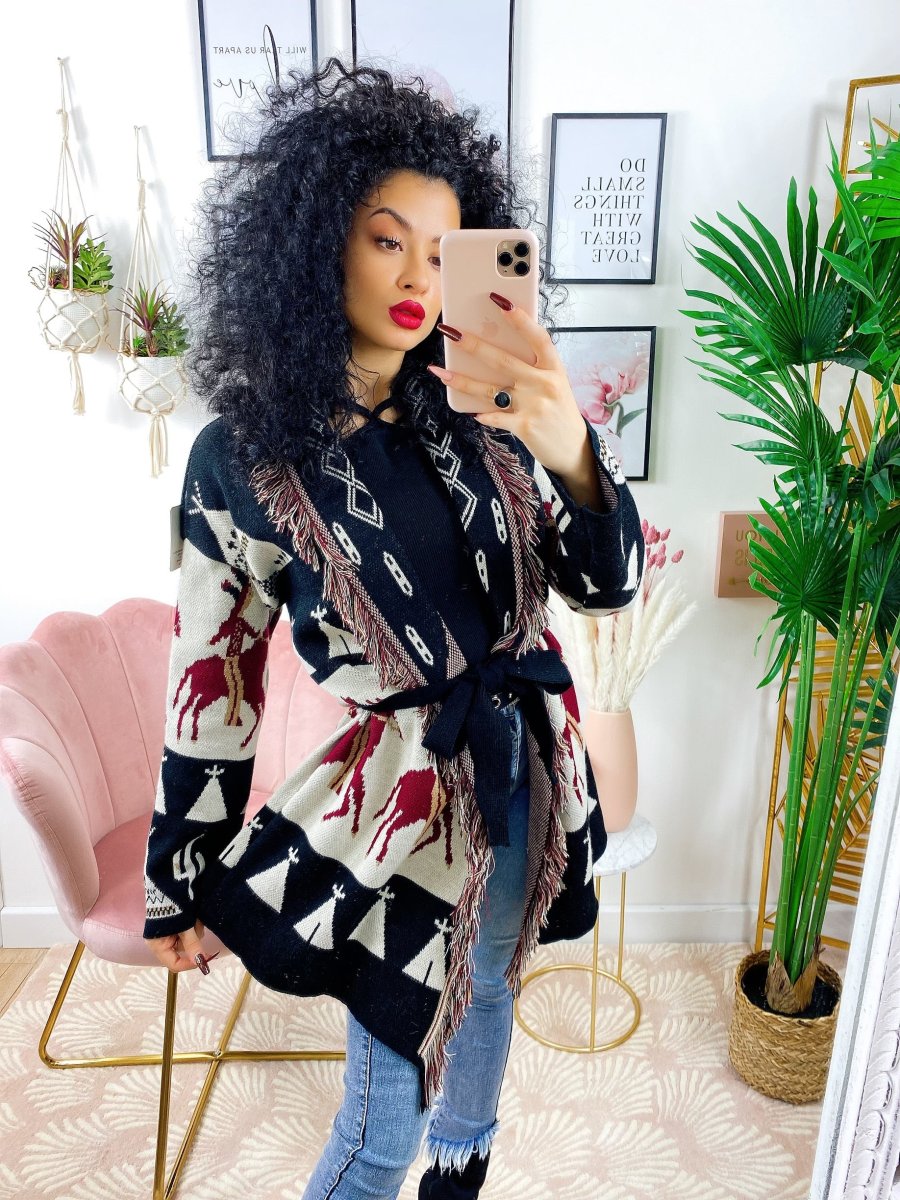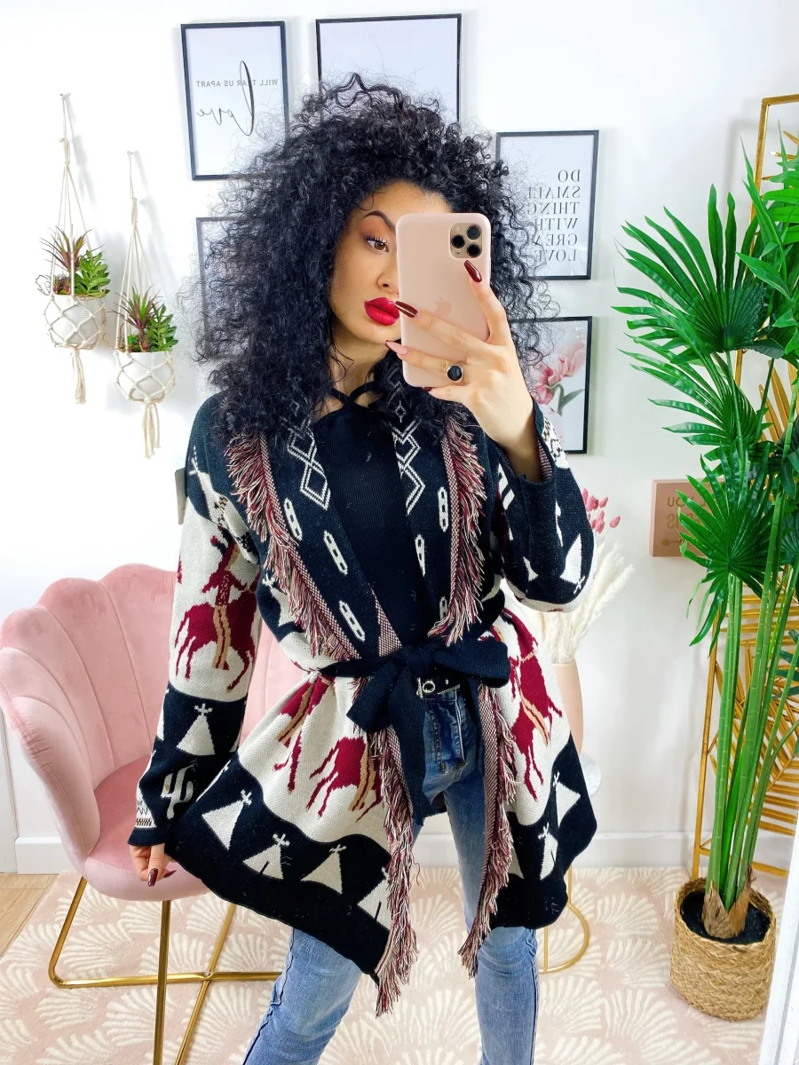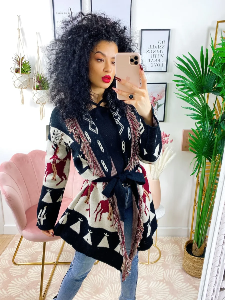 Cardigan frange e cinta cavallo nero e Bordeaux