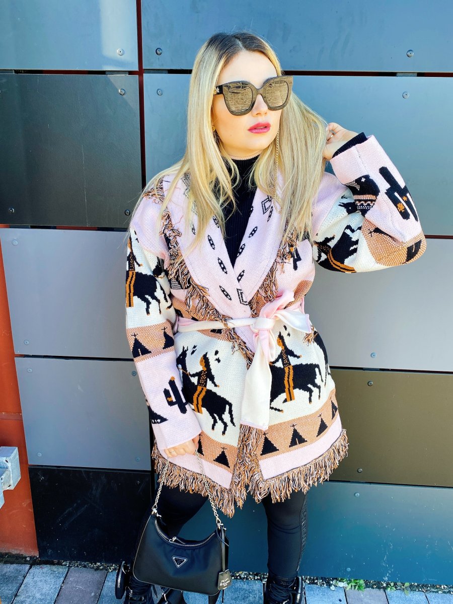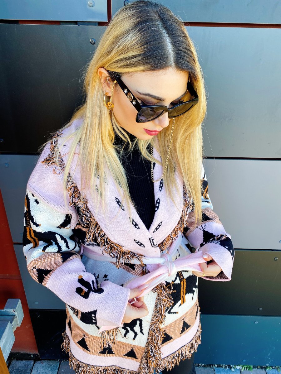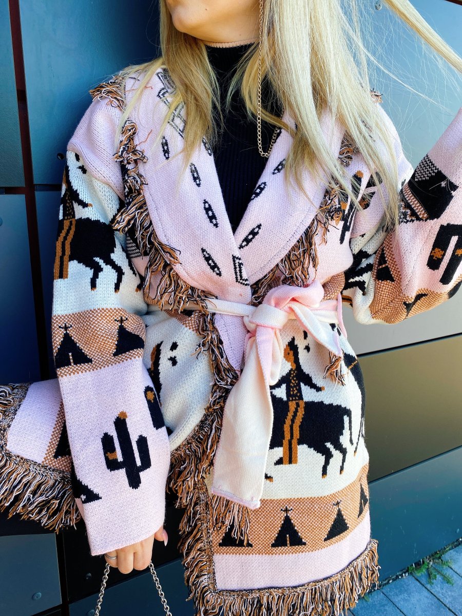 Cardigan in tessuto medio pesante con frange e cintura in vita. Alta qualità