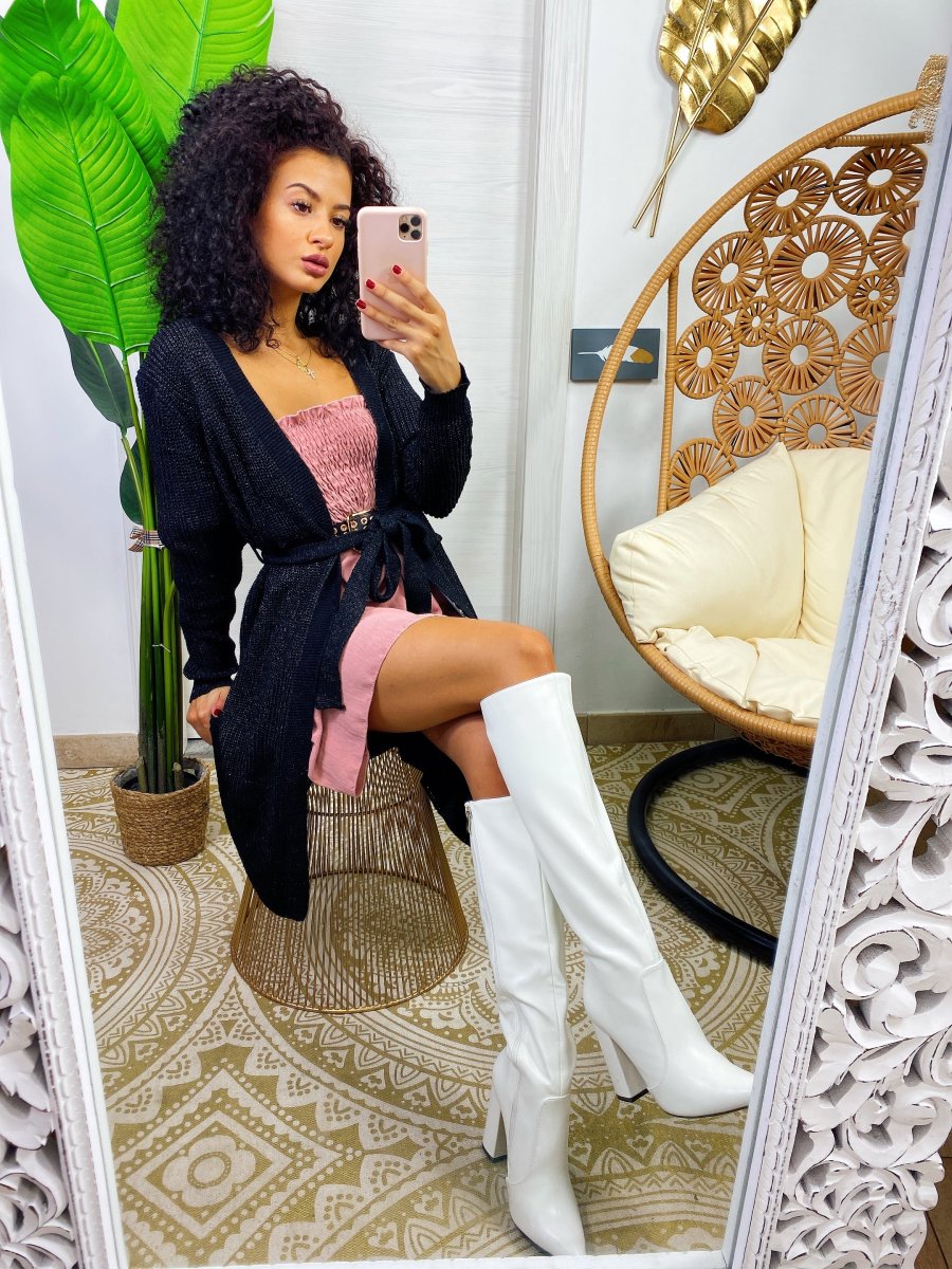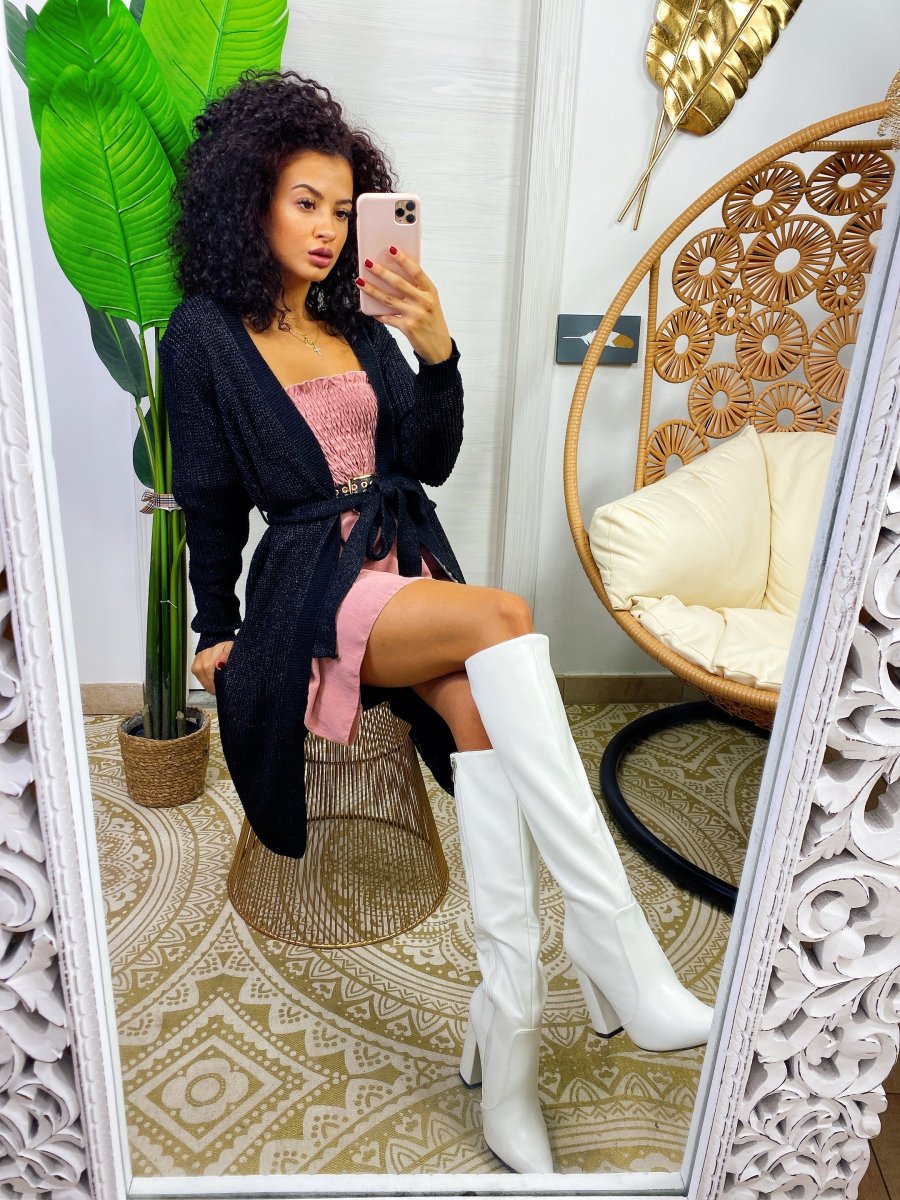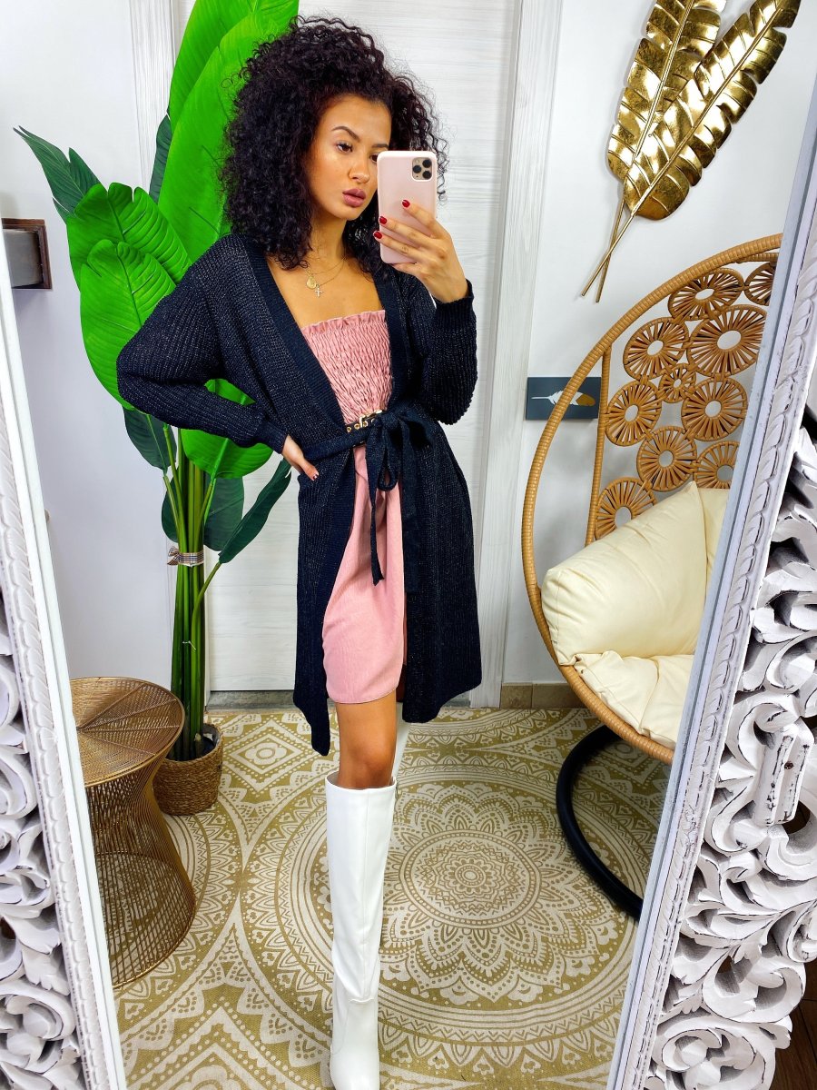 Cardigan lungo in lurex con cintura in vita tono su tono. Elegante o sportivo.