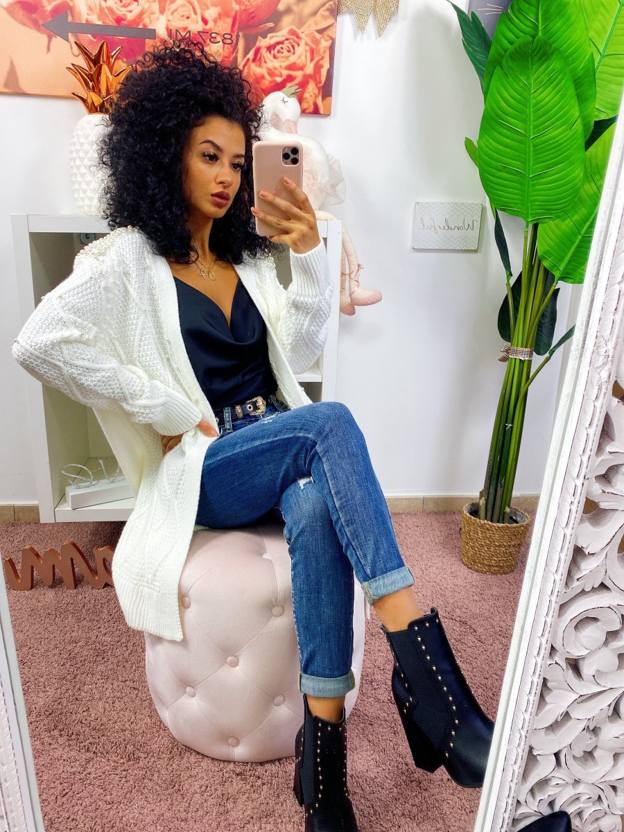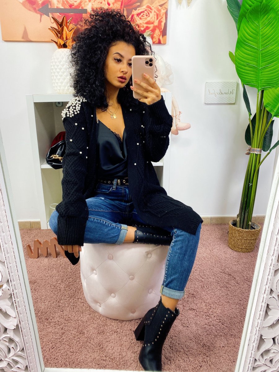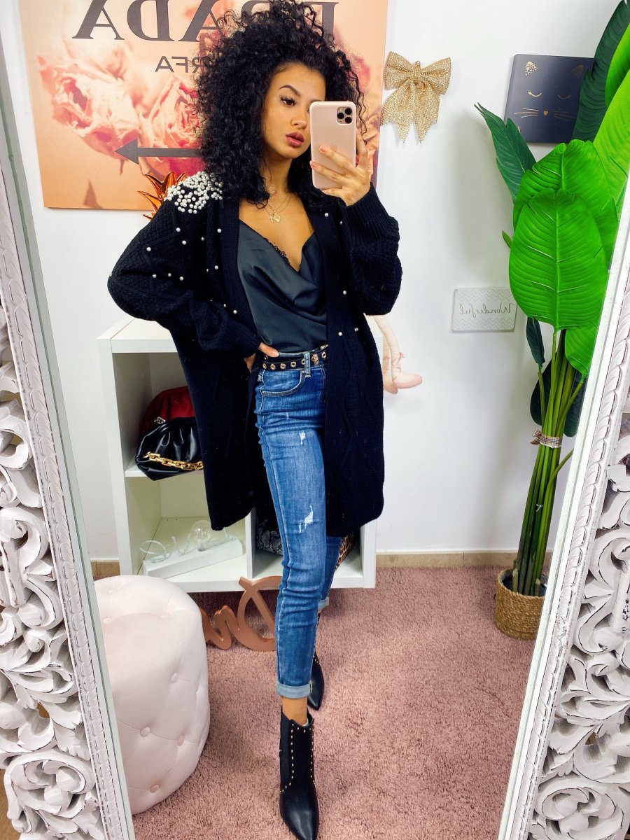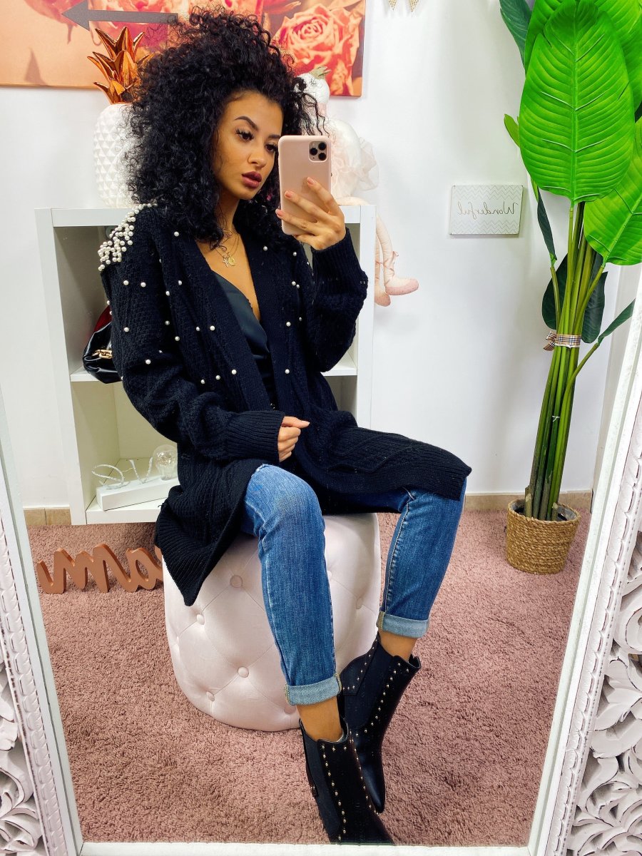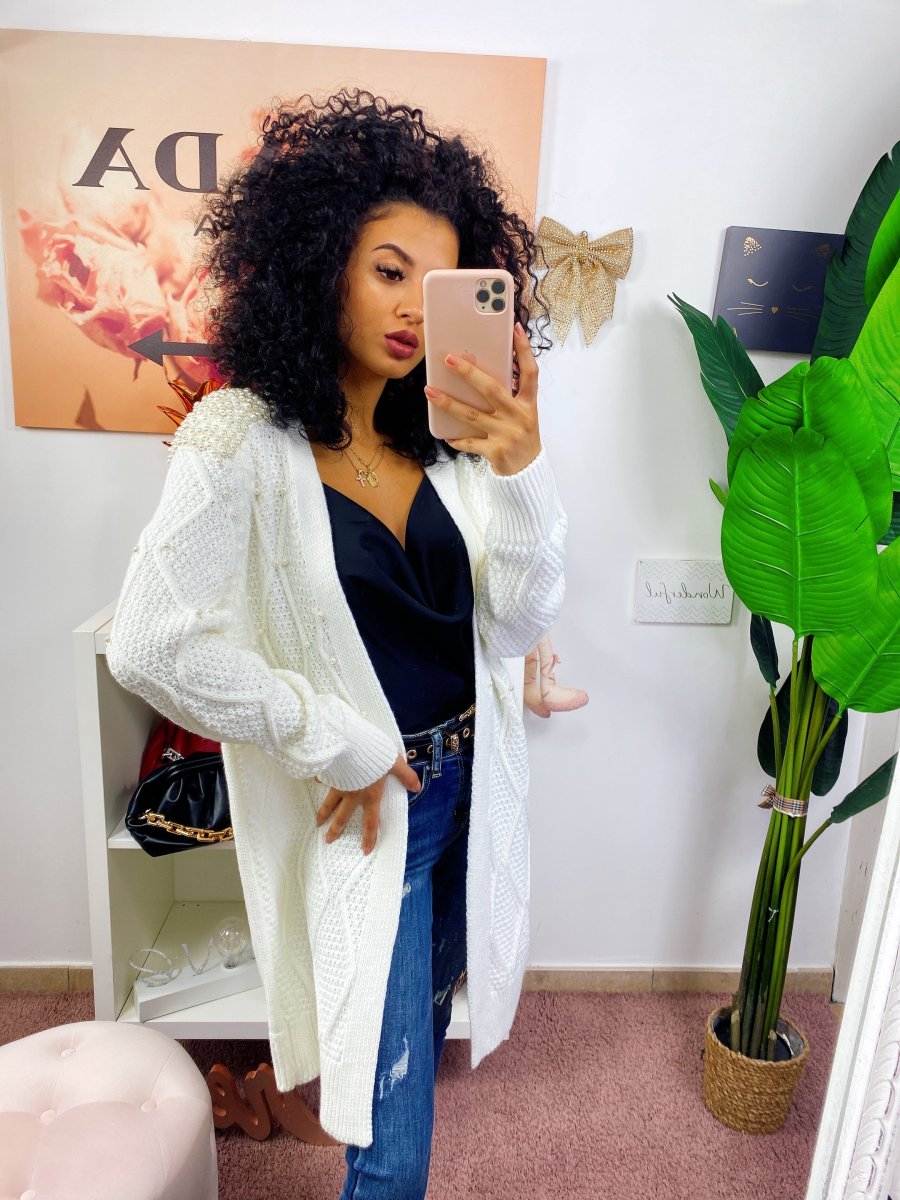 Cardigan lungo in tessuto morbido. Ricchissimo di perle e dettaglio sul tessuto.