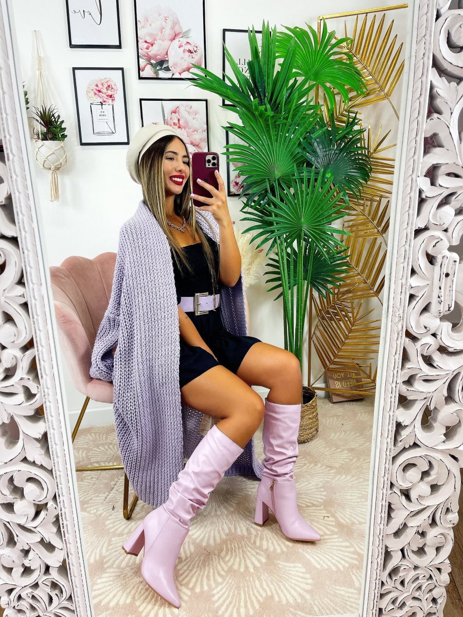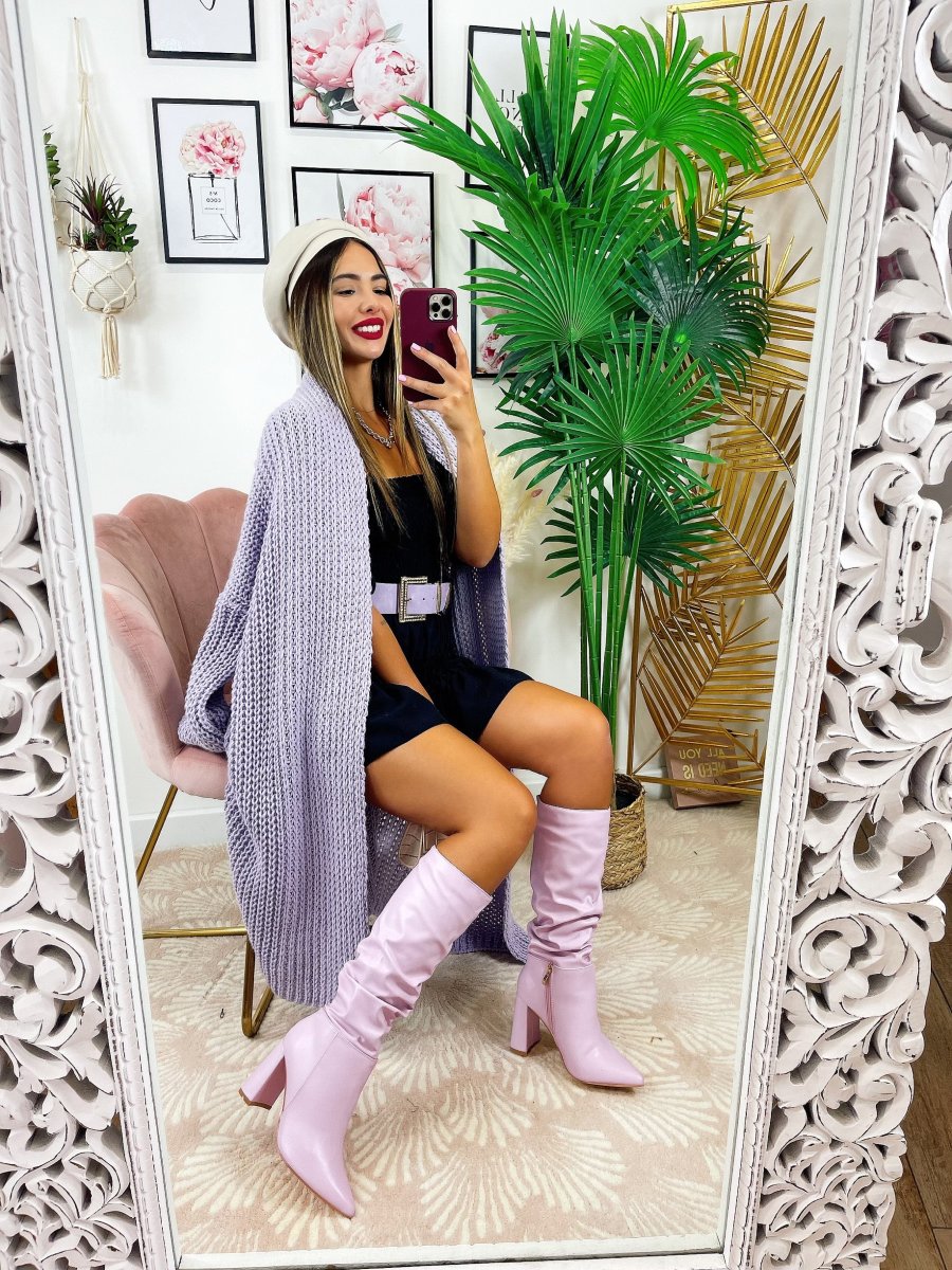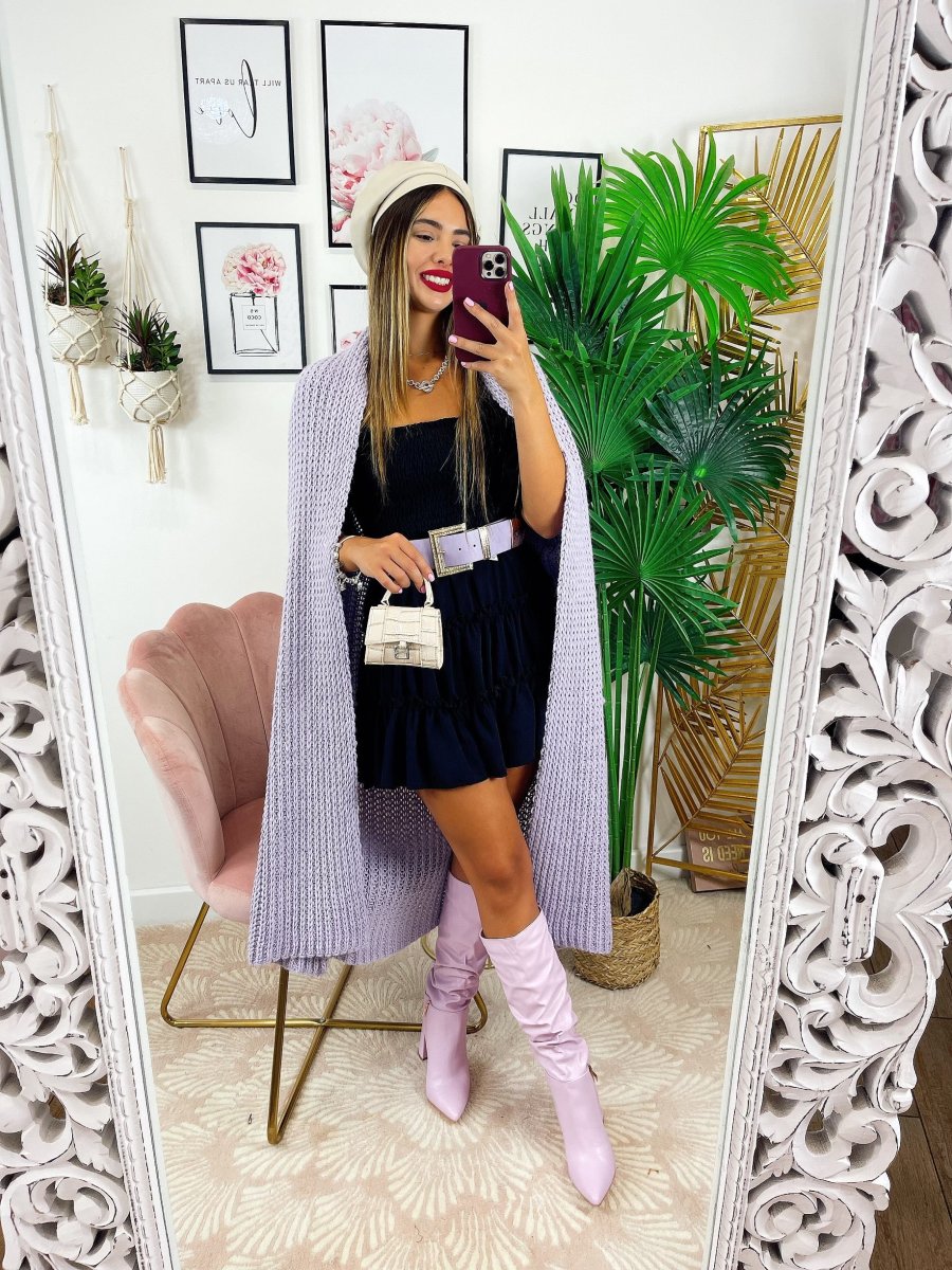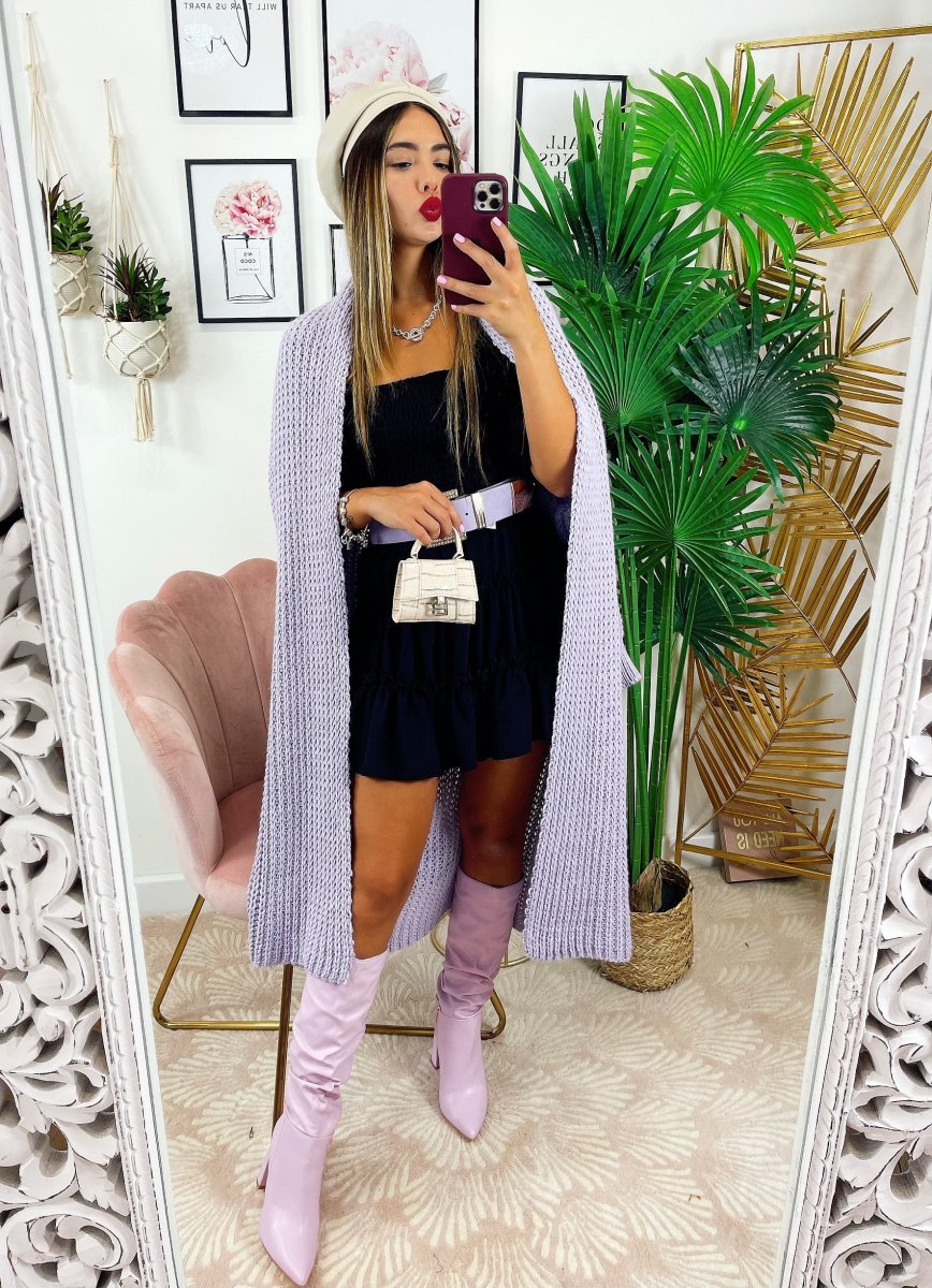 Cardigan lungo lilla Con manica a polsino e tasche.