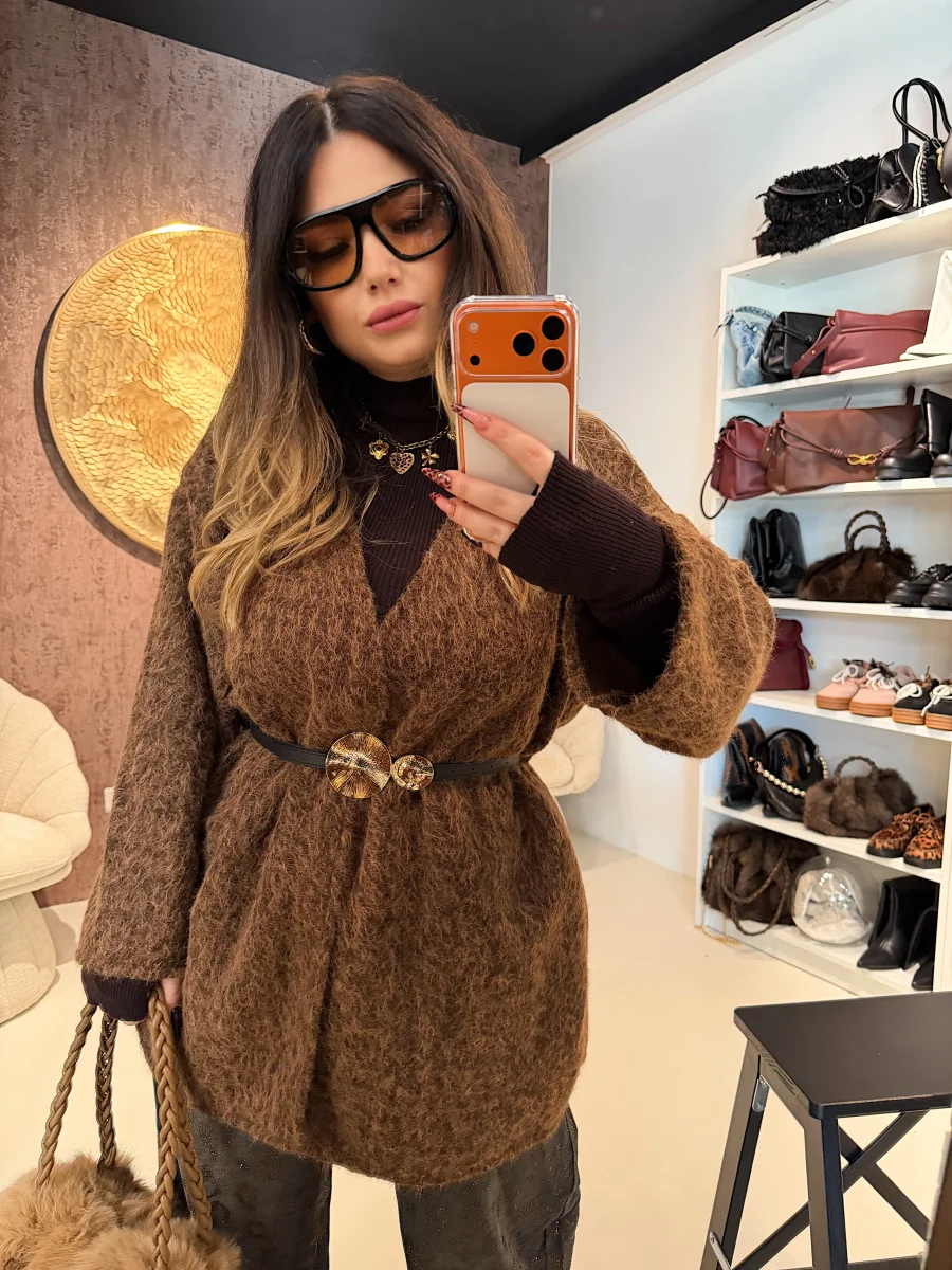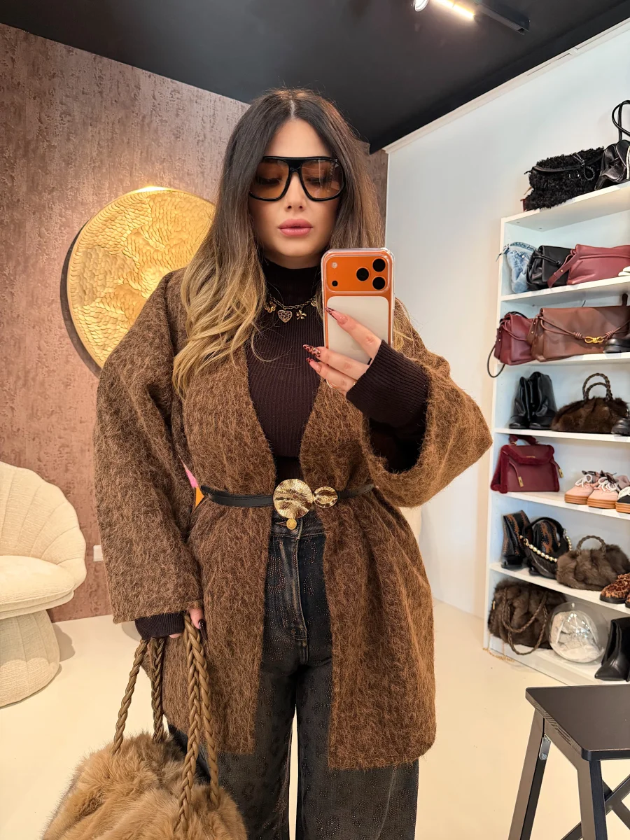 Cardigan aperto Made in Italy realizzato in filato morbido e caldo, dal particolare effetto pelliccia.