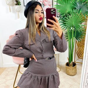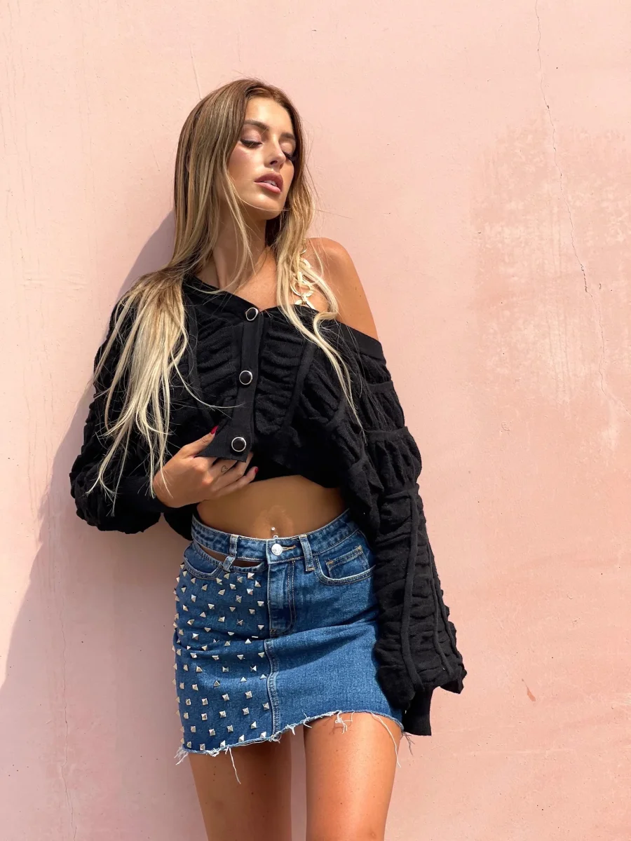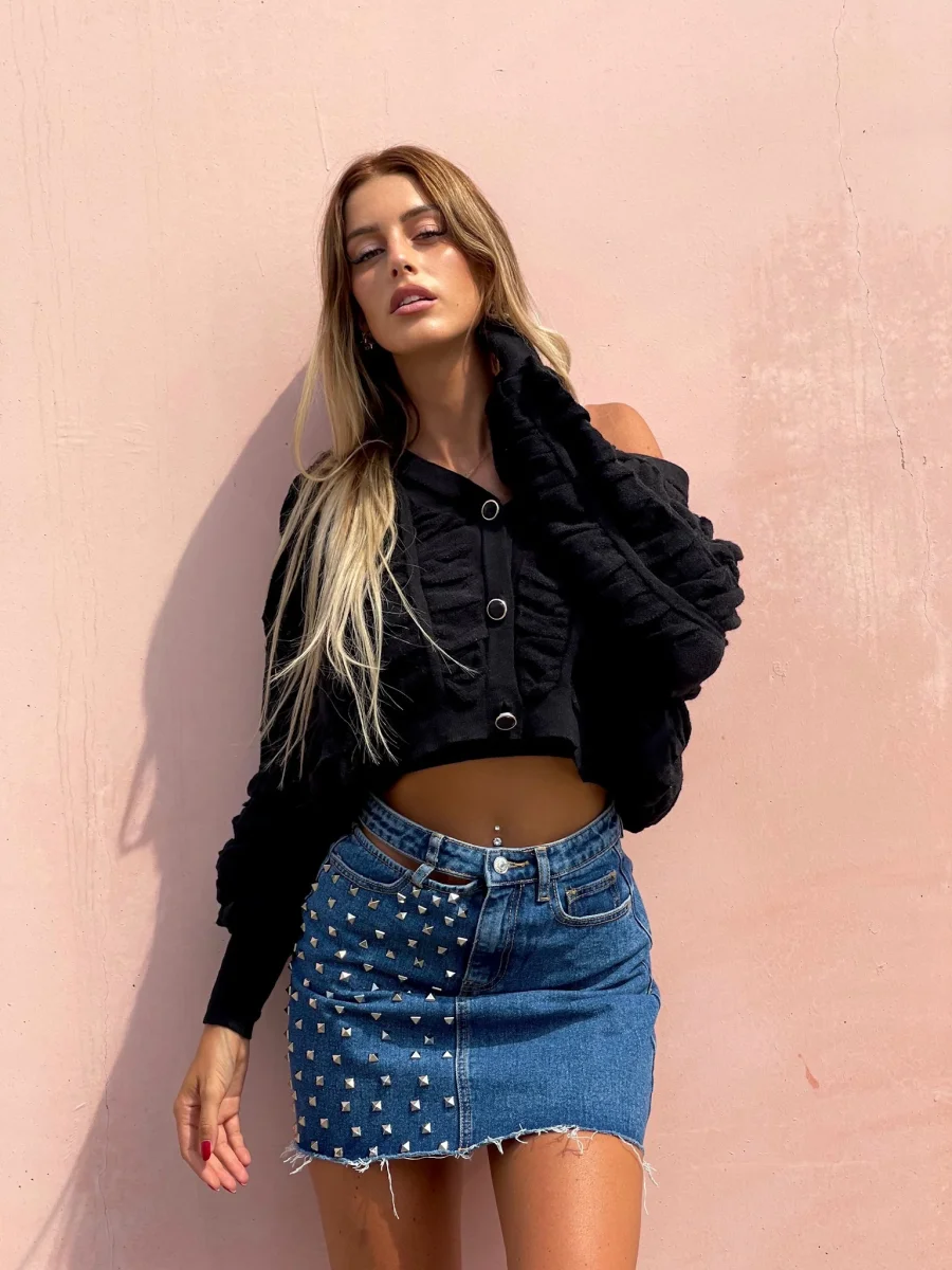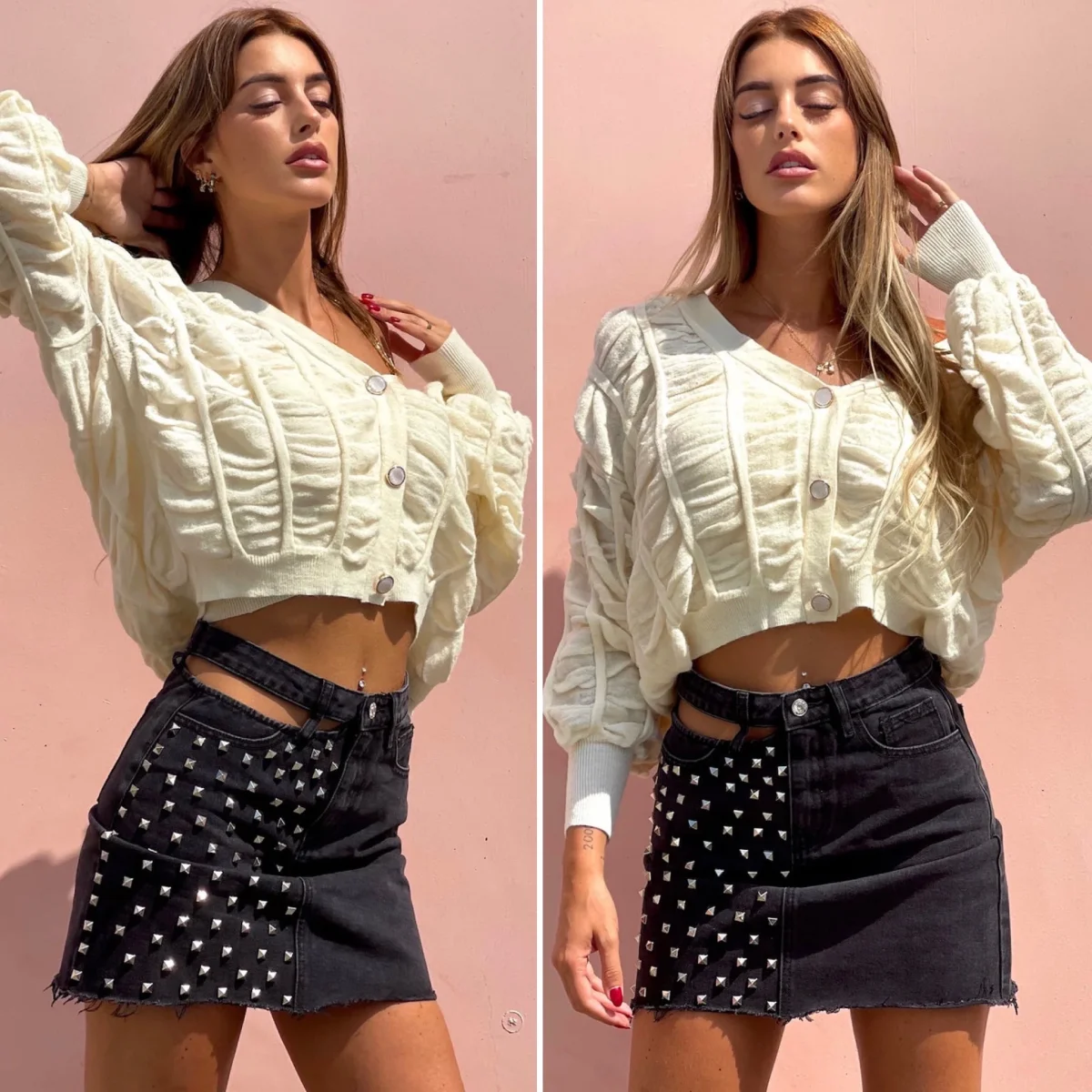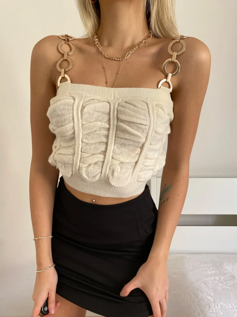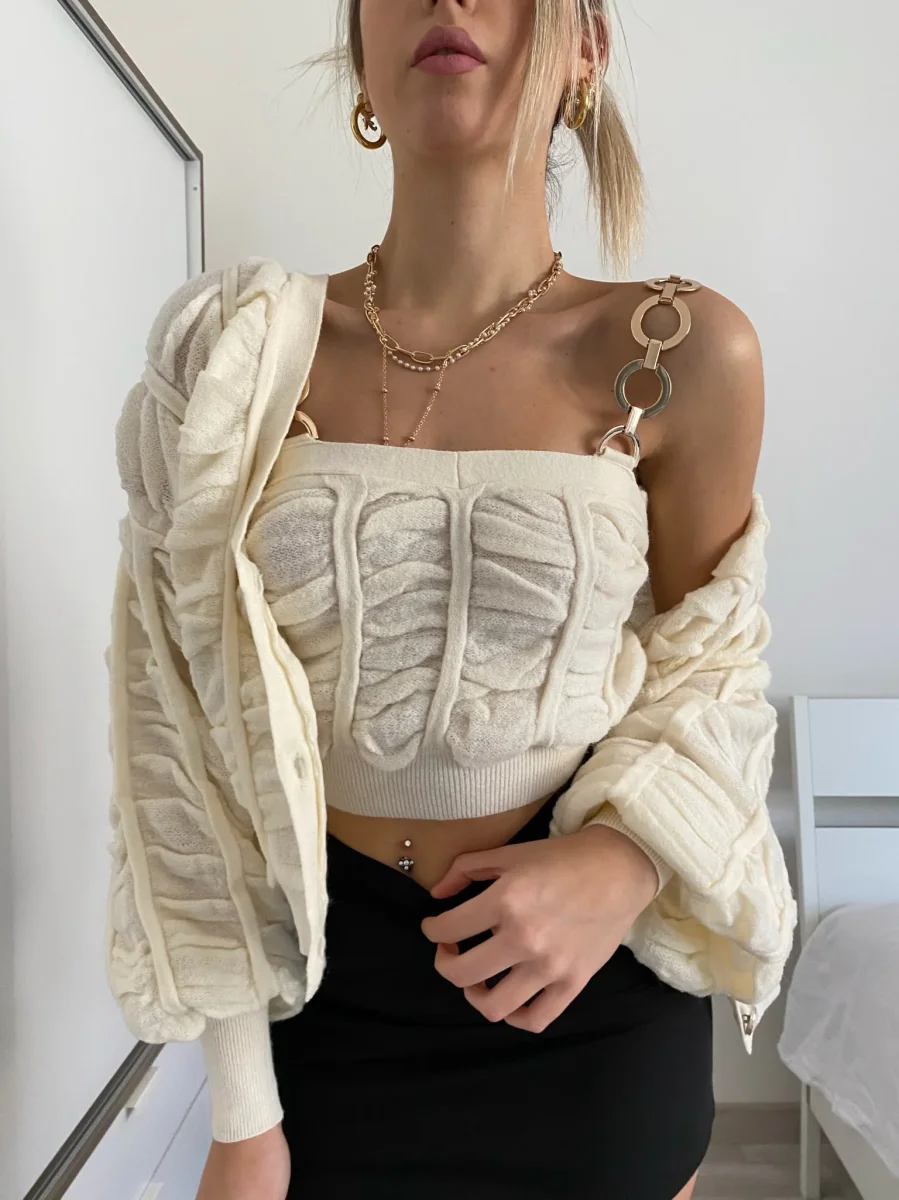 Completo composto da top e cardigan in tessuto molto pesante. Top con catene oro e cardigan con bottoni gioiello.