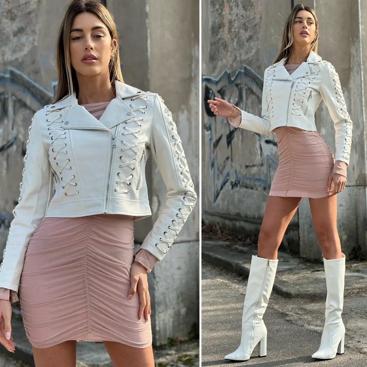 Giacca in ecopelle foderata con lacci in dettaglio.