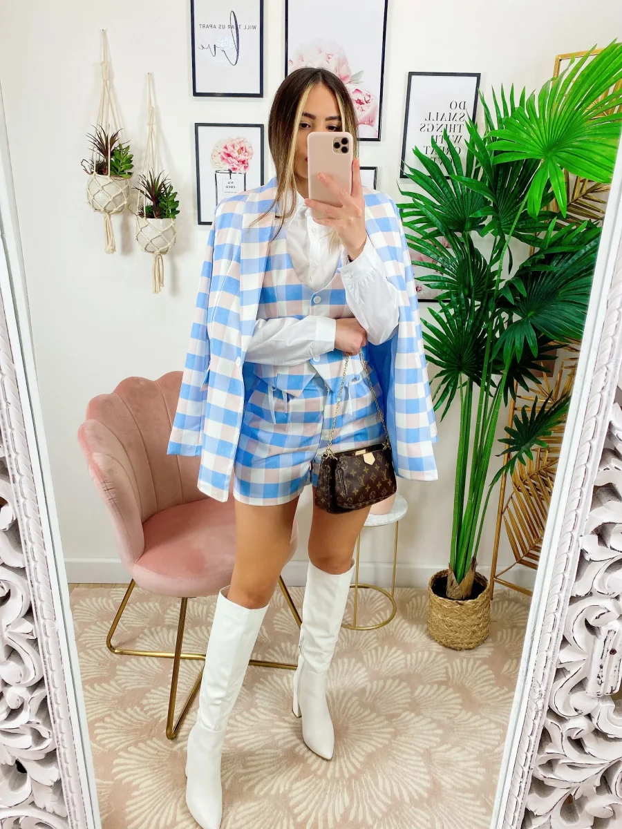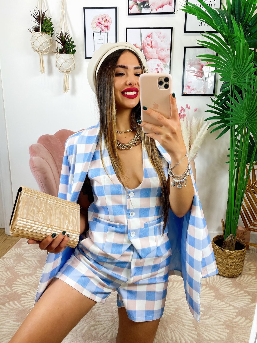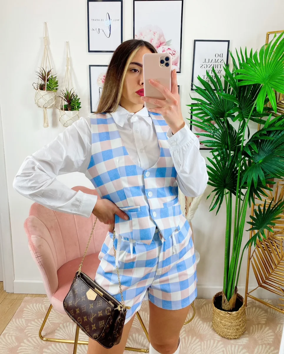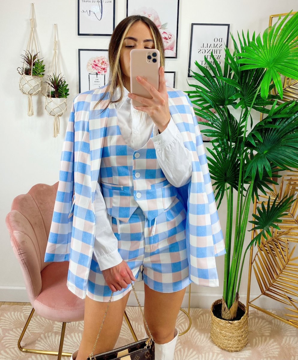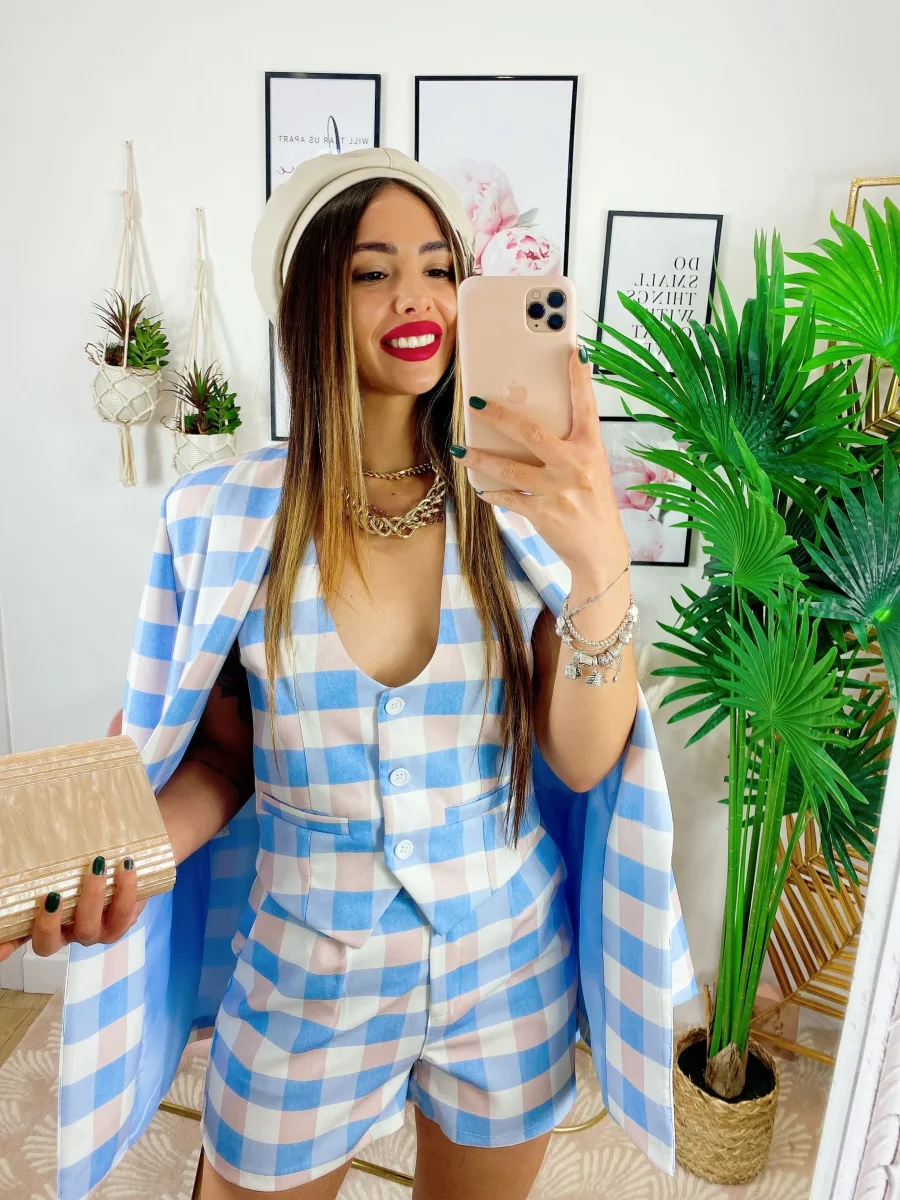 Completo 3 pezzi a quadri carta da zucchero, Short panciotto e giacca alta qualità.