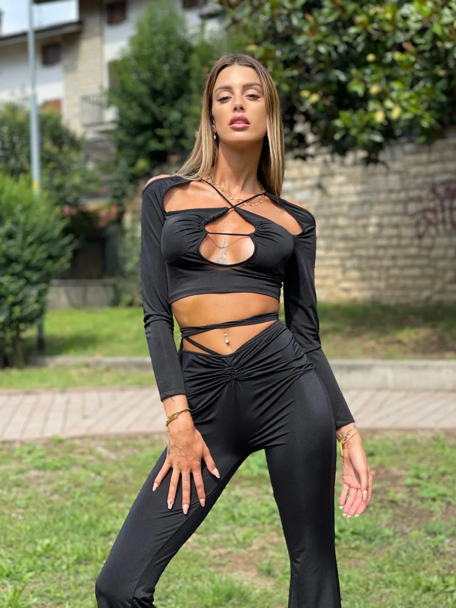 Due pezzi, tessuto elasticizzato, utilizzabile sia di giorno con una sneakers sia di sera con un tacco.
