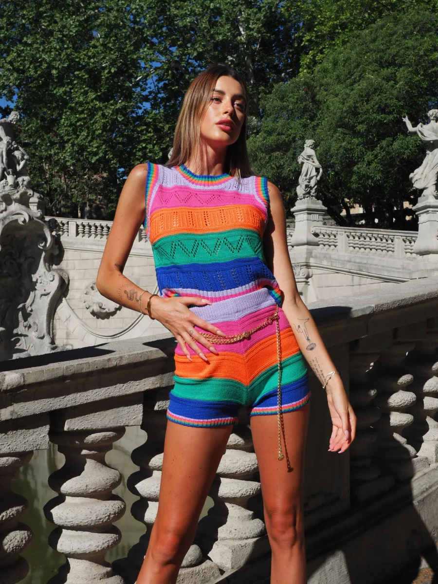 Completo composto da top e short in tessuto morbidissimo e elasticizzato. Corpino completamente ricamato e short con elastico