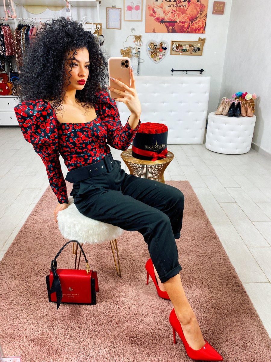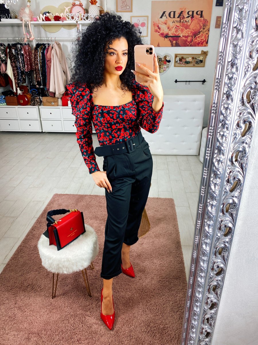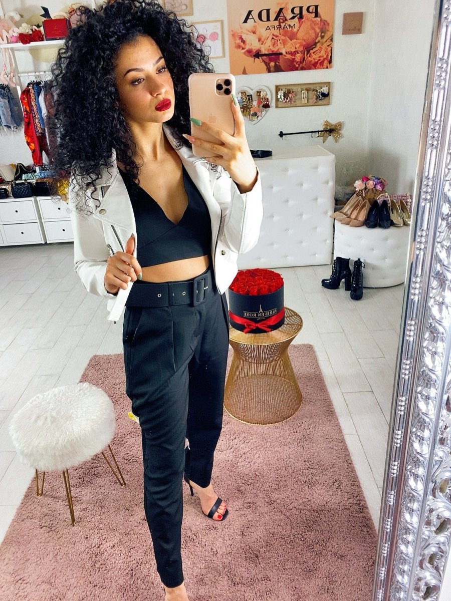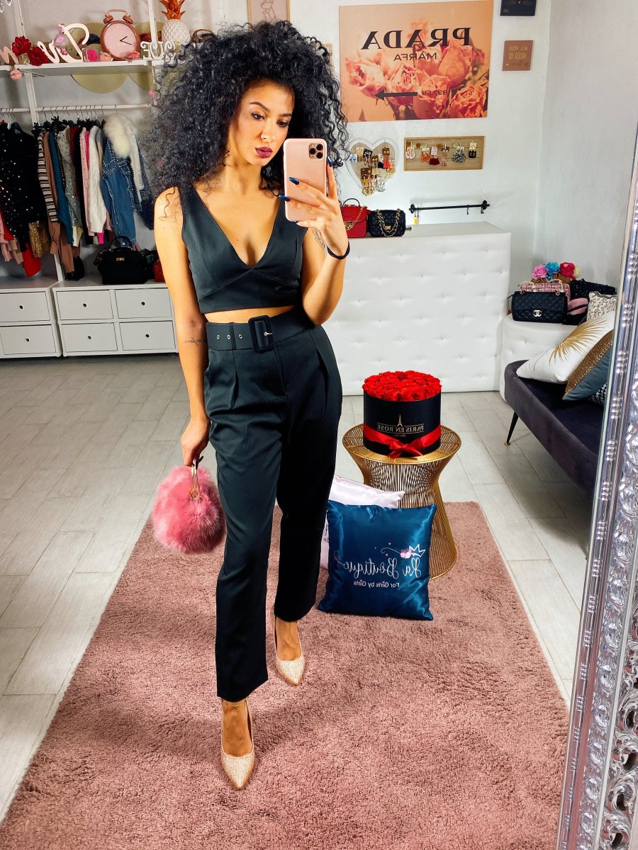 Completo composto da top con zip sulla schiena nero e pantalone elegante con cintura inclusa. Tasche nel dietro e gamba morbida. Perfetto sia da giorno che da sera