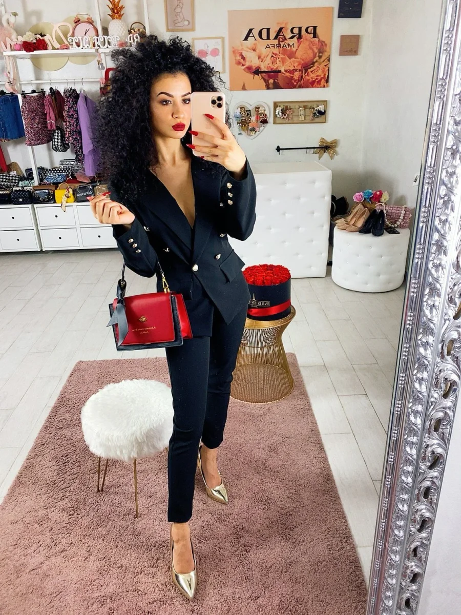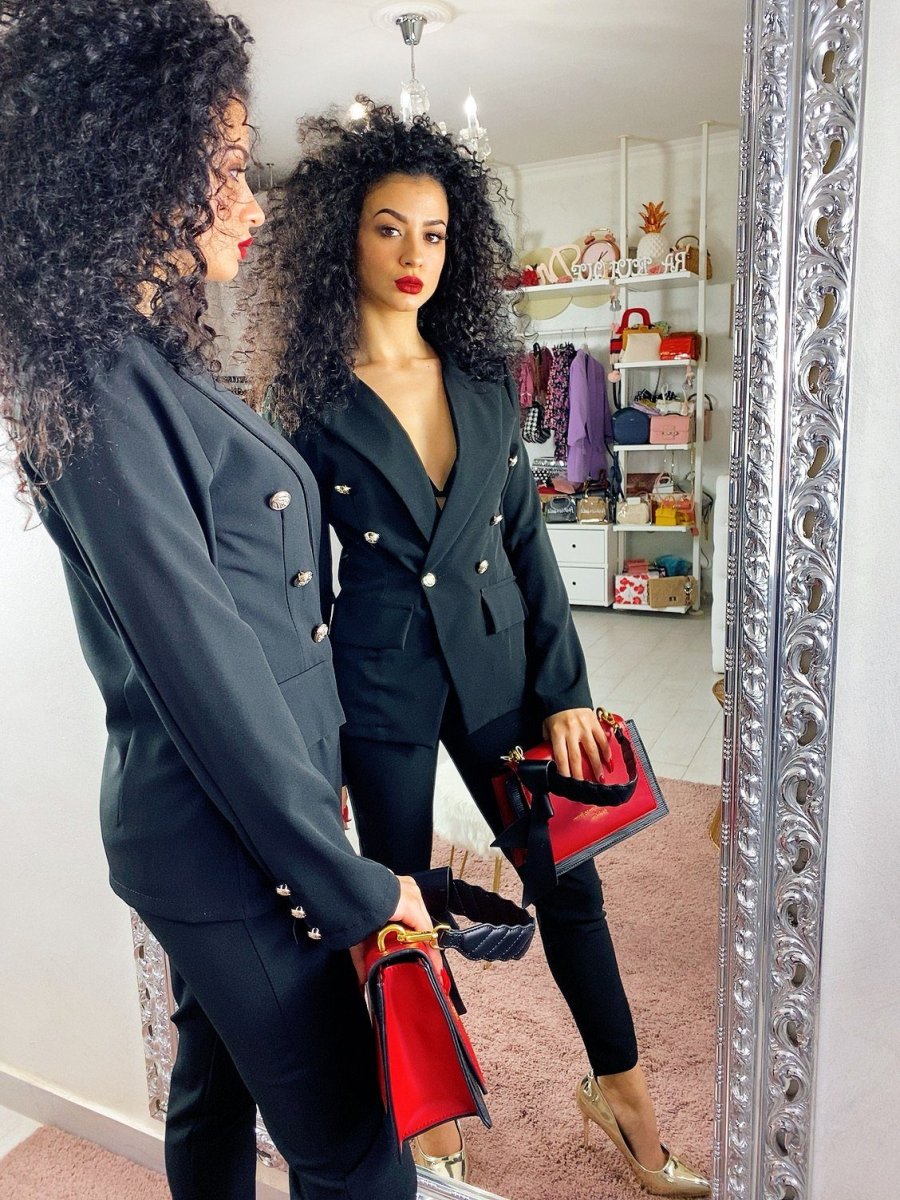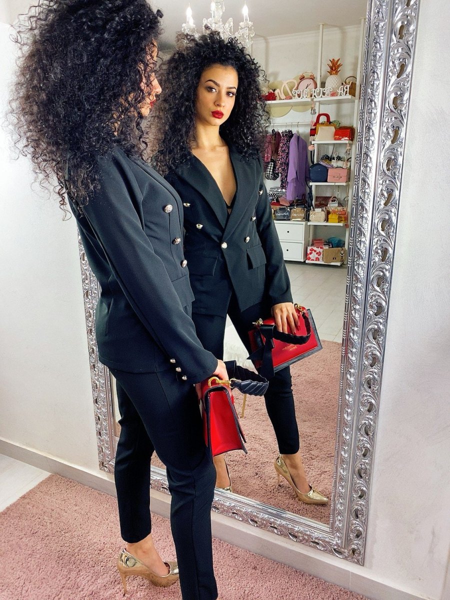 Completo composto da pantalone e giacca dalla vestibilità piccola. Leggermente elasticizzato.