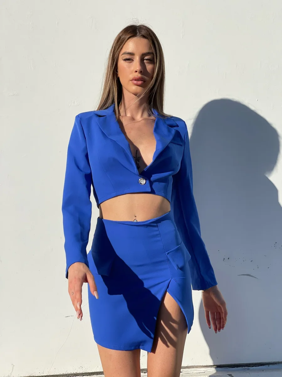 Completo due pezzi giacca e gonna. Giacca con bottone gioiello modello crop, gonna con zip e spacchetto
