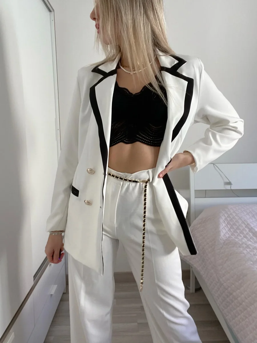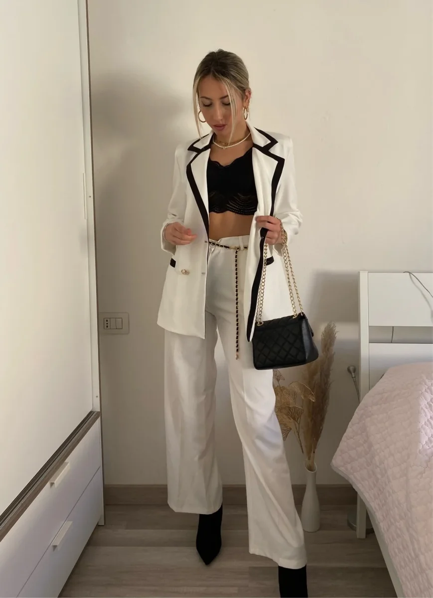 Completo composto da giacca foderata con manica morbida e pantalone a palazzo.