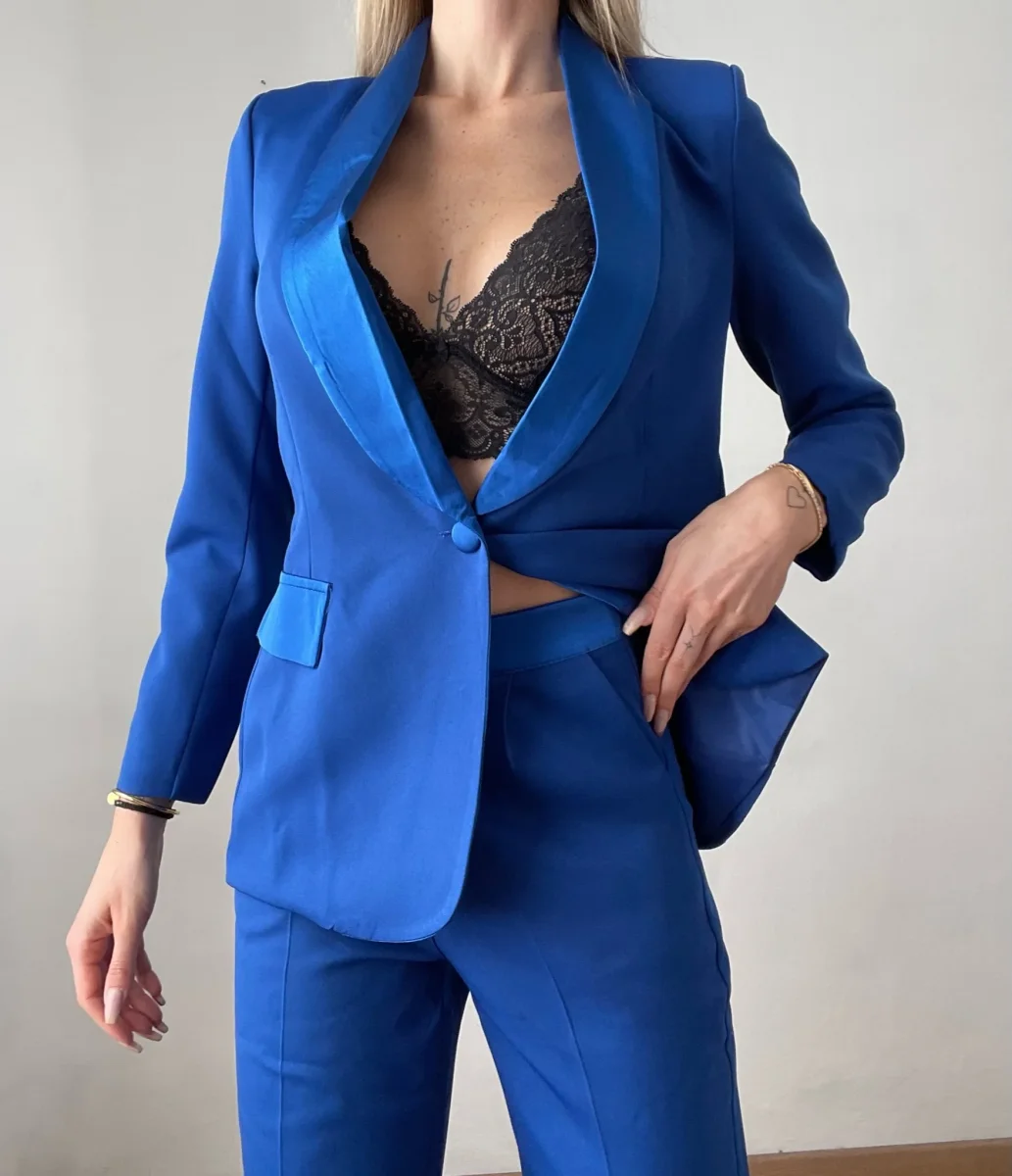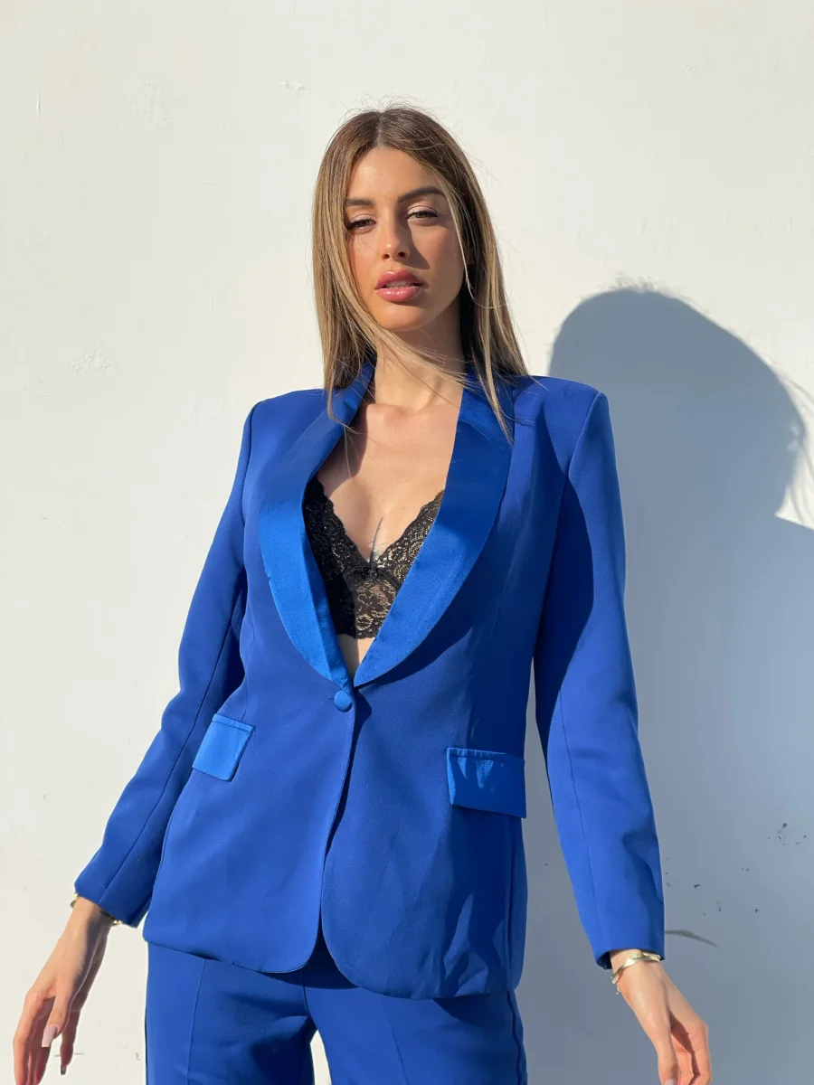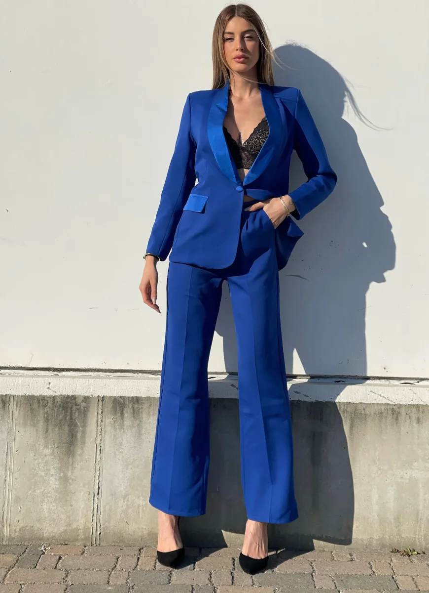 Completo composto da giacca foderata con manica lunga e bottone. Collo reverse effetto raso. Pantalone ampio.