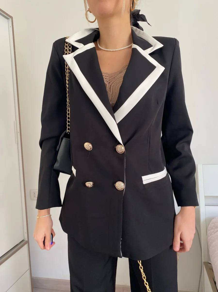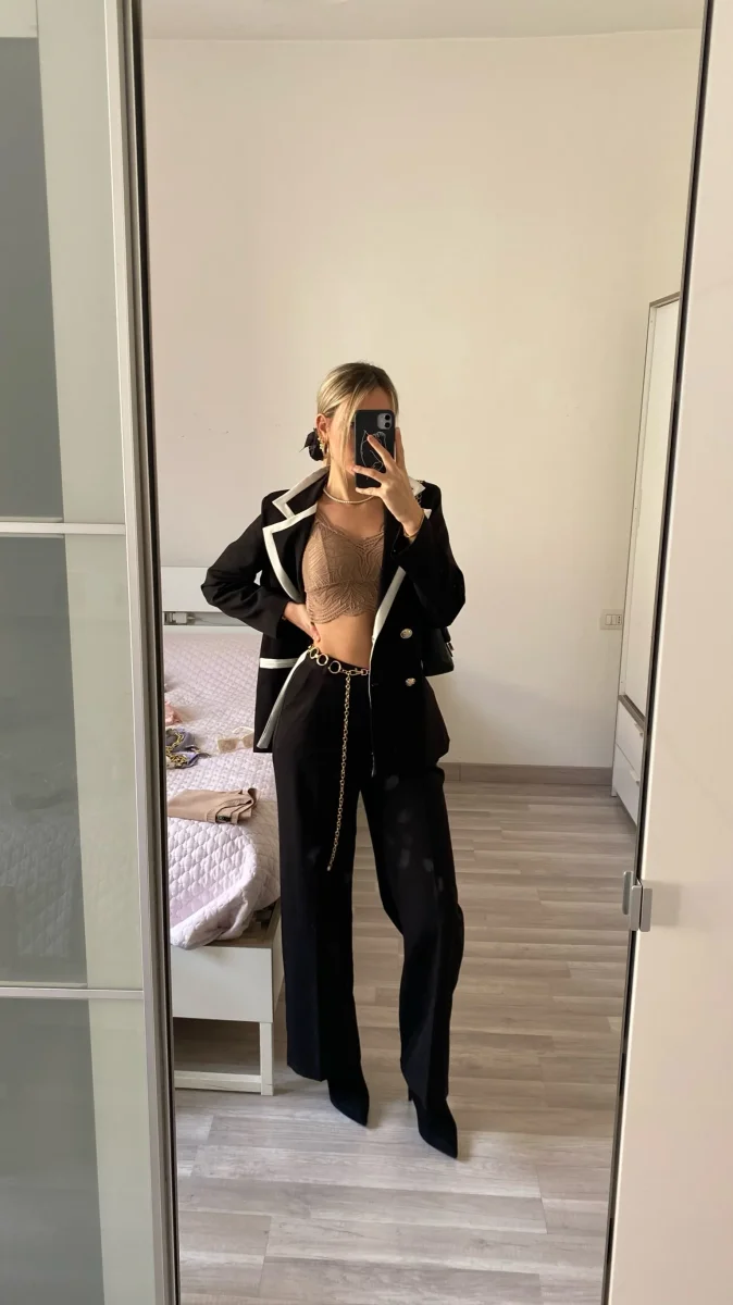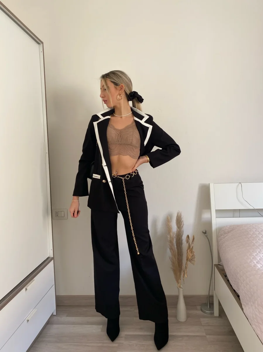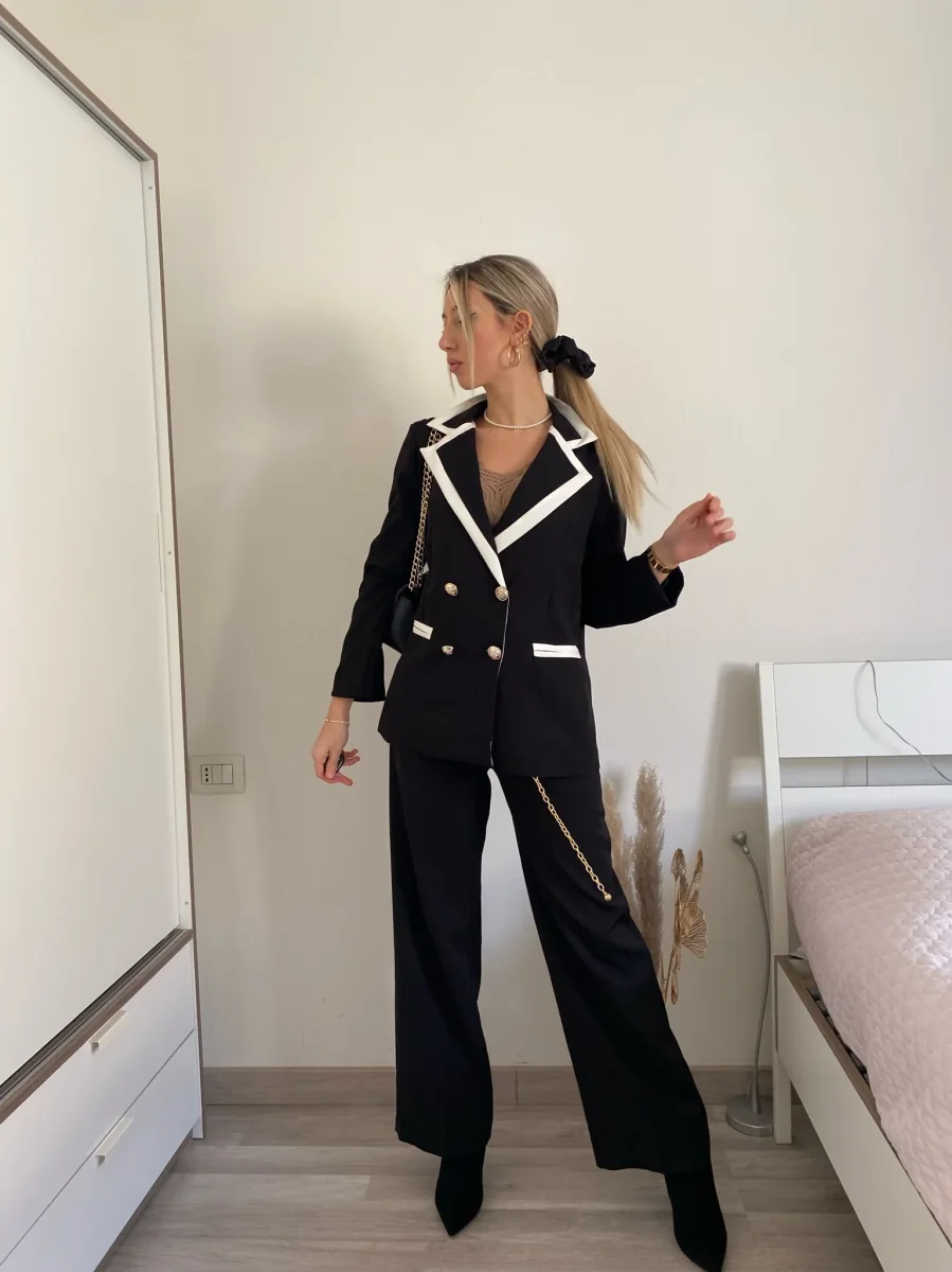 Completo composto da giacca foderata con manica morbida e pantalone a palazzo.