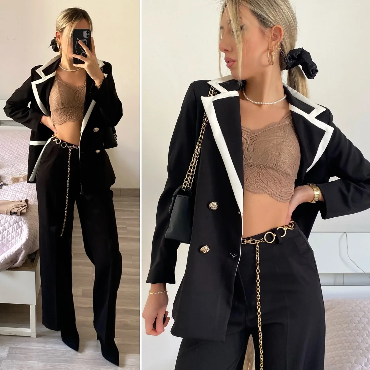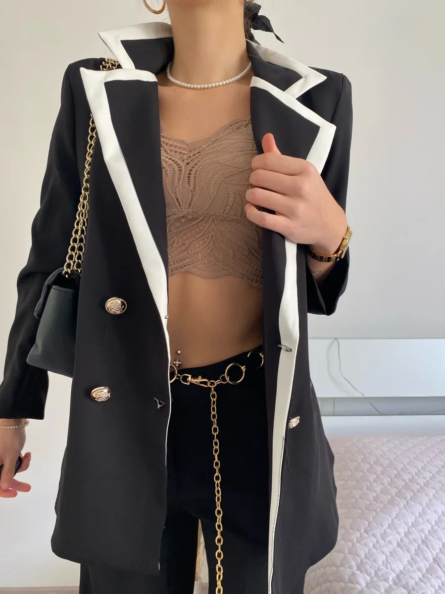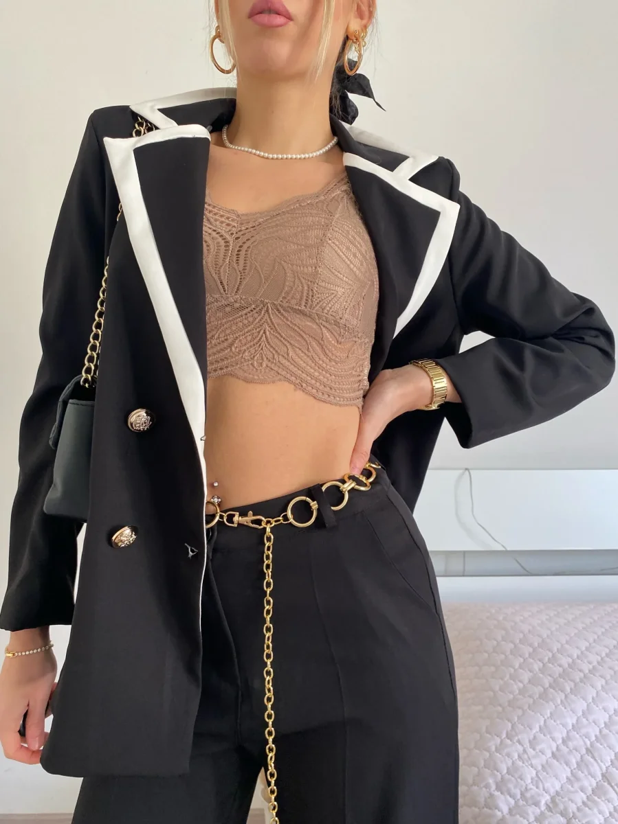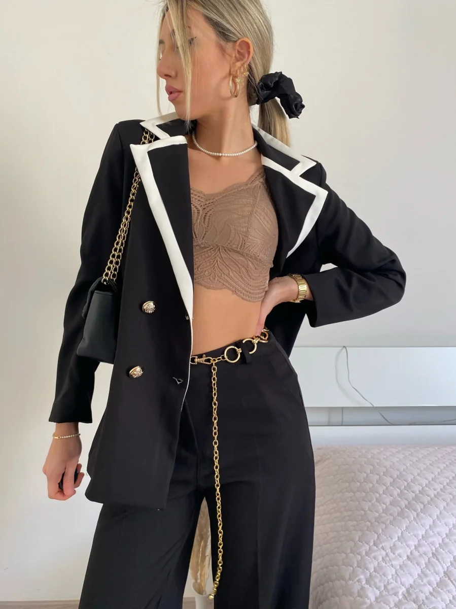 Completo composto da giacca foderata con manica morbida e pantalone a palazzo.