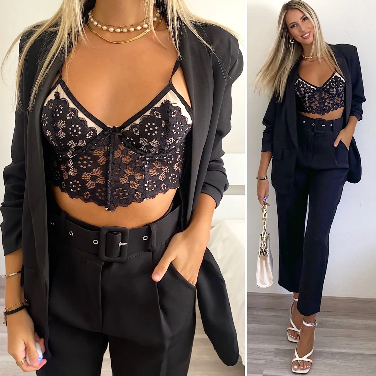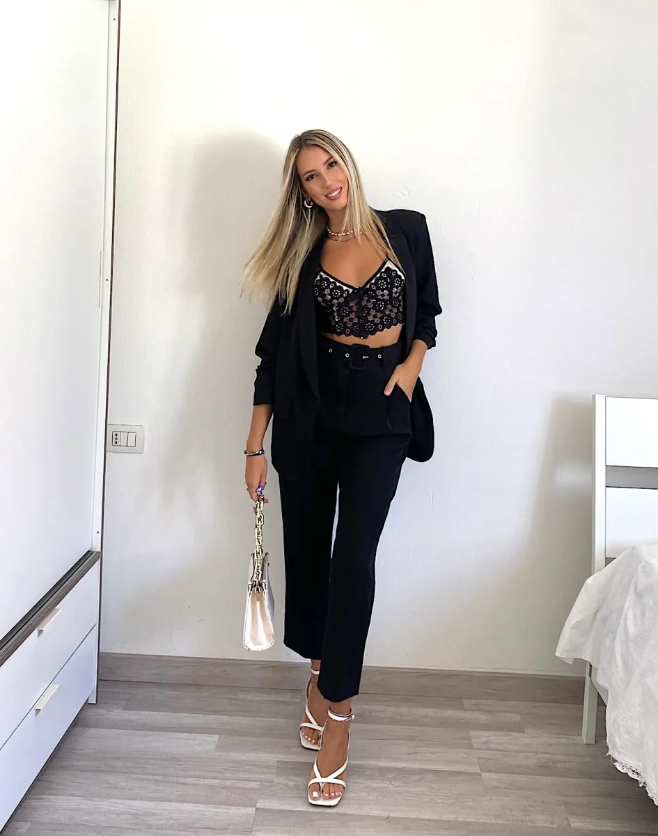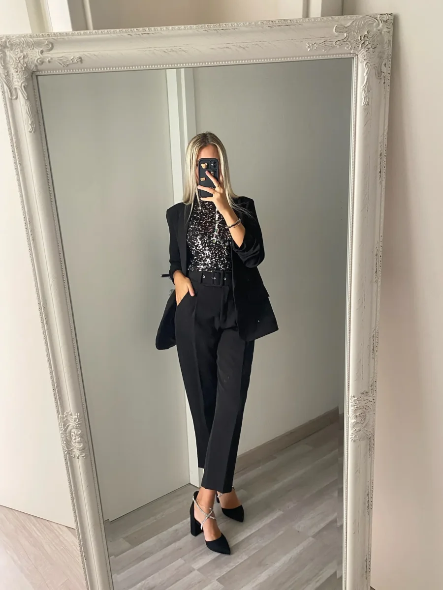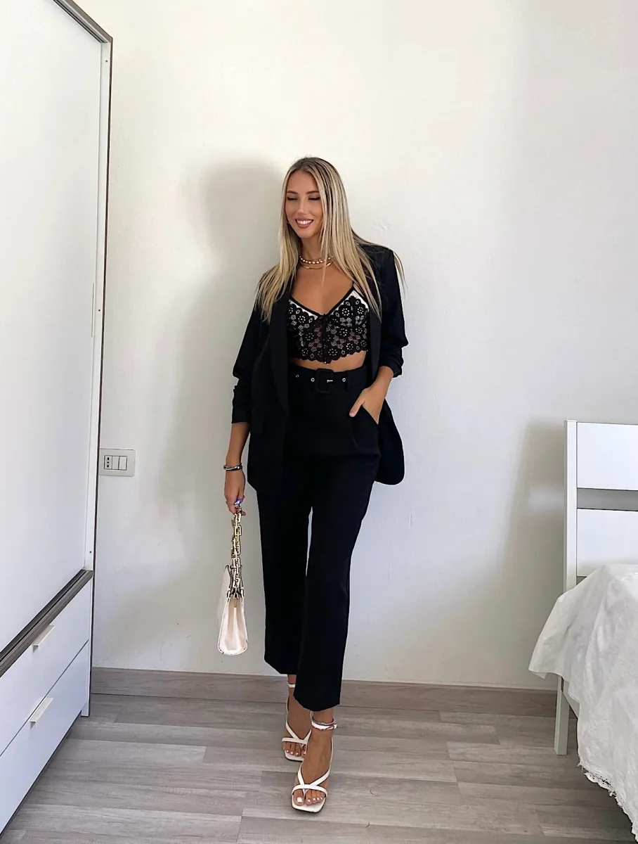 Completo composto da giacca foderata con manica arricciata e pantalone con cintura in vita. Elastico nel dietro