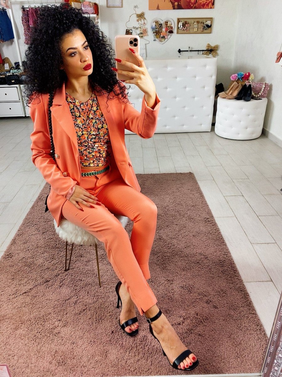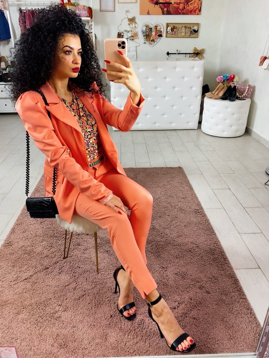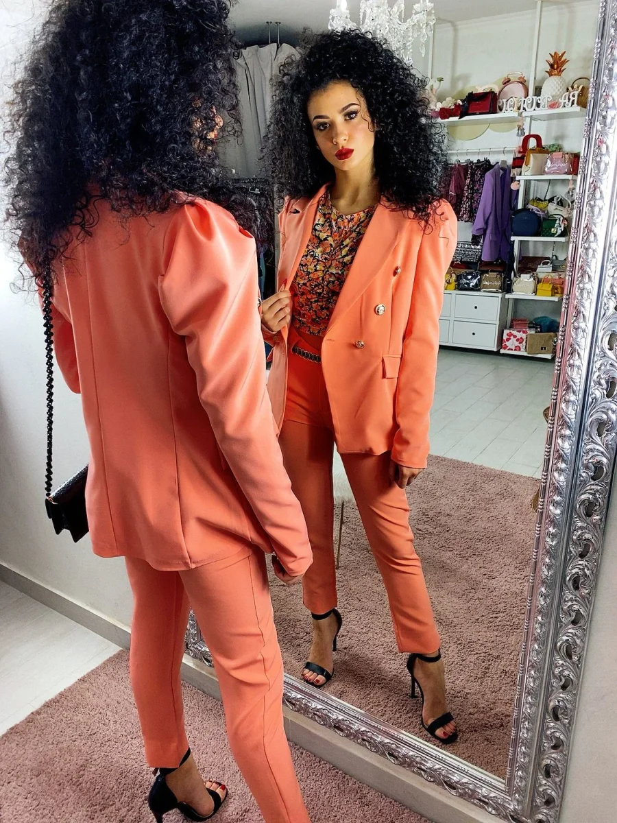 Completo composto da giacca e pantalone con chiusura a doppio petto. Pantalone aderente alla caviglia con spacchetto. Perfetto per qualsiasi occasione