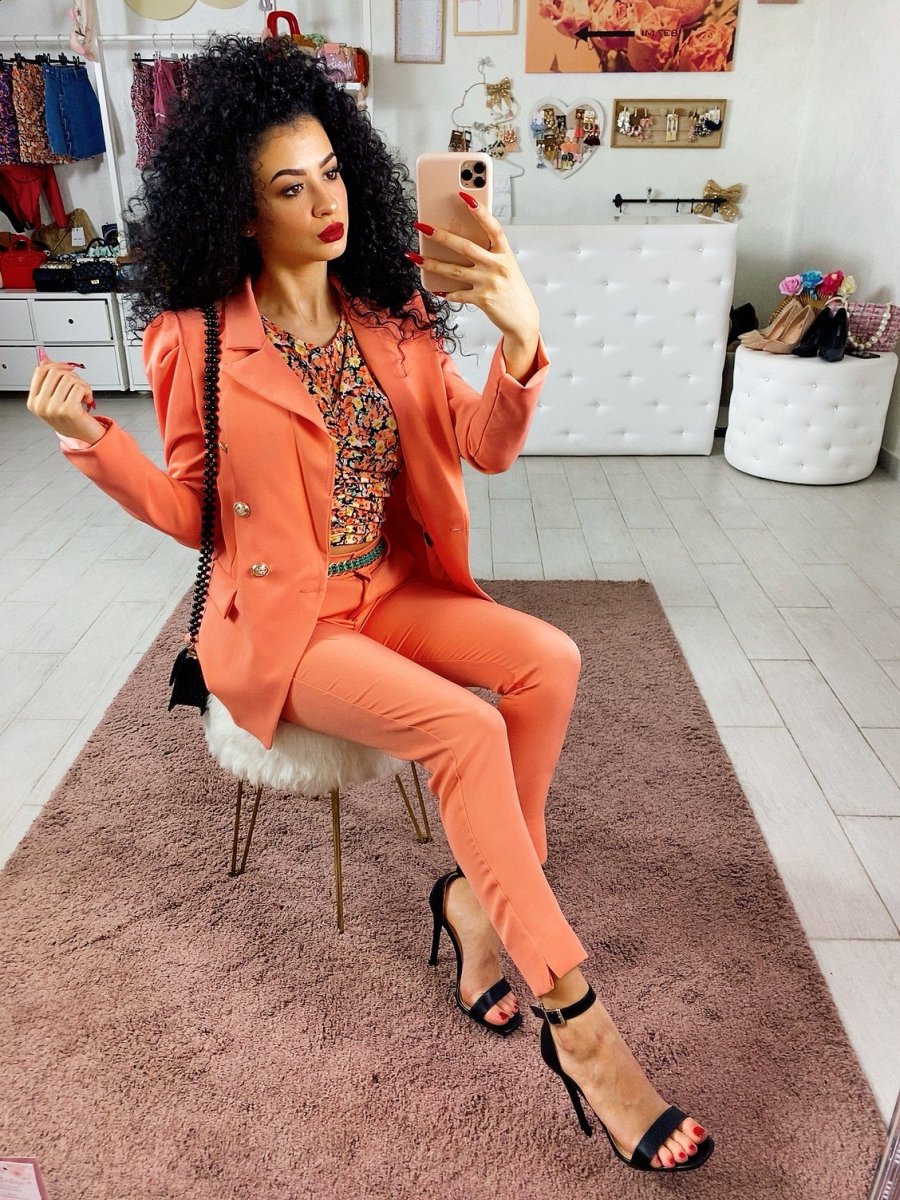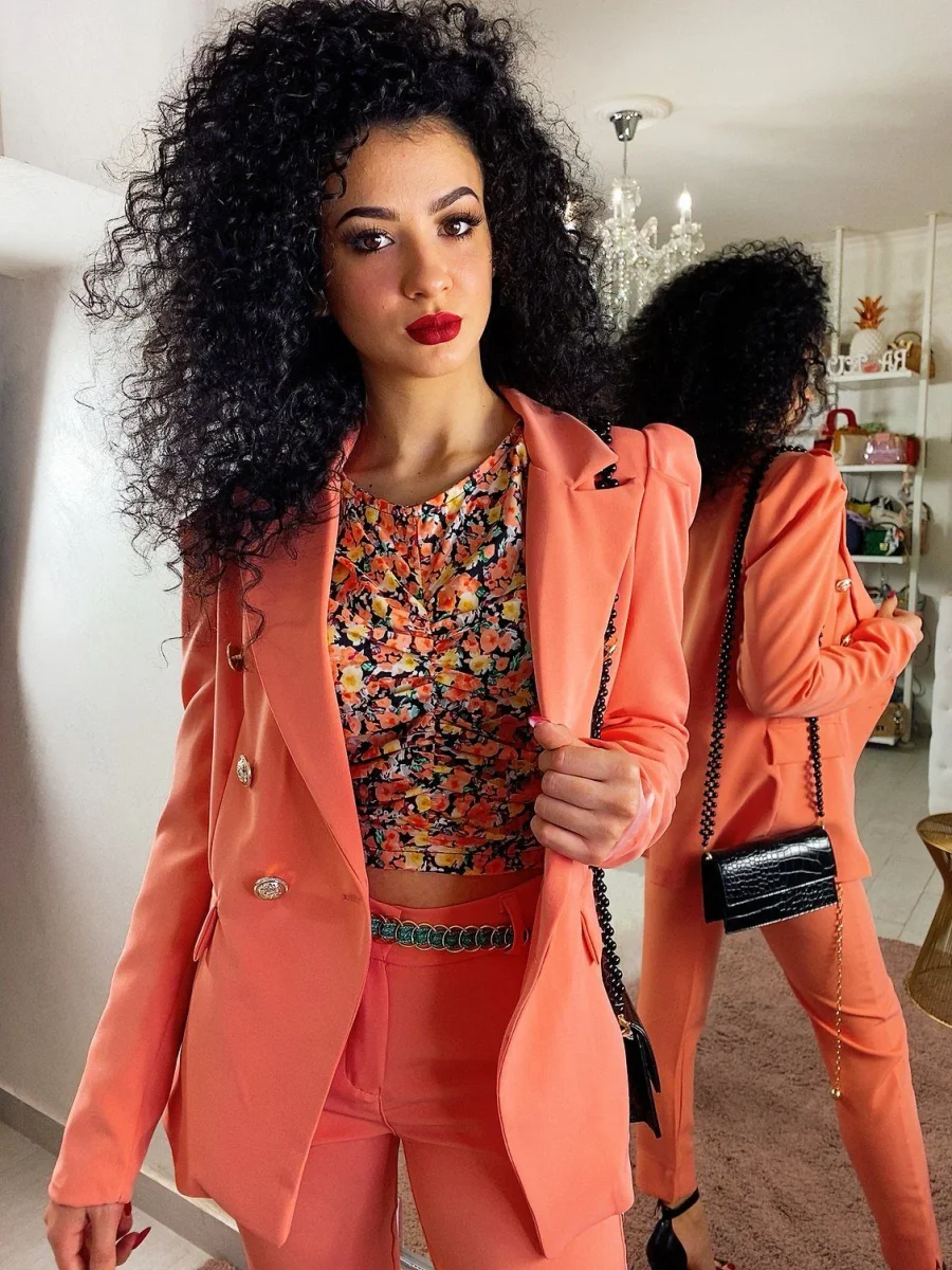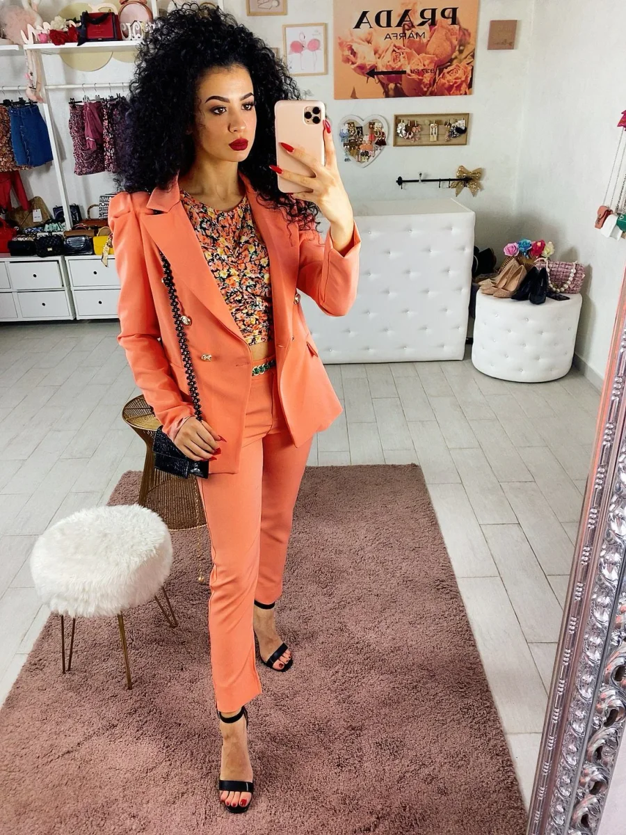 Completo composto da giacca e pantalone con chiusura a doppio petto. Pantalone aderente alla caviglia con spacchetto. Perfetto per qualsiasi occasione