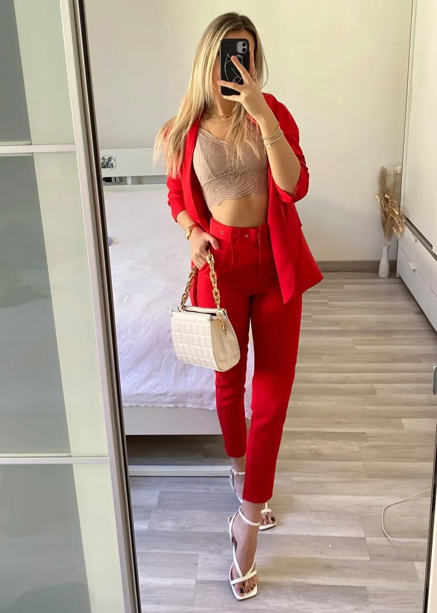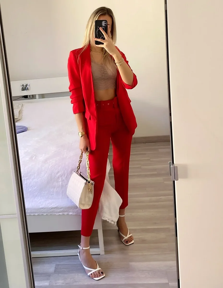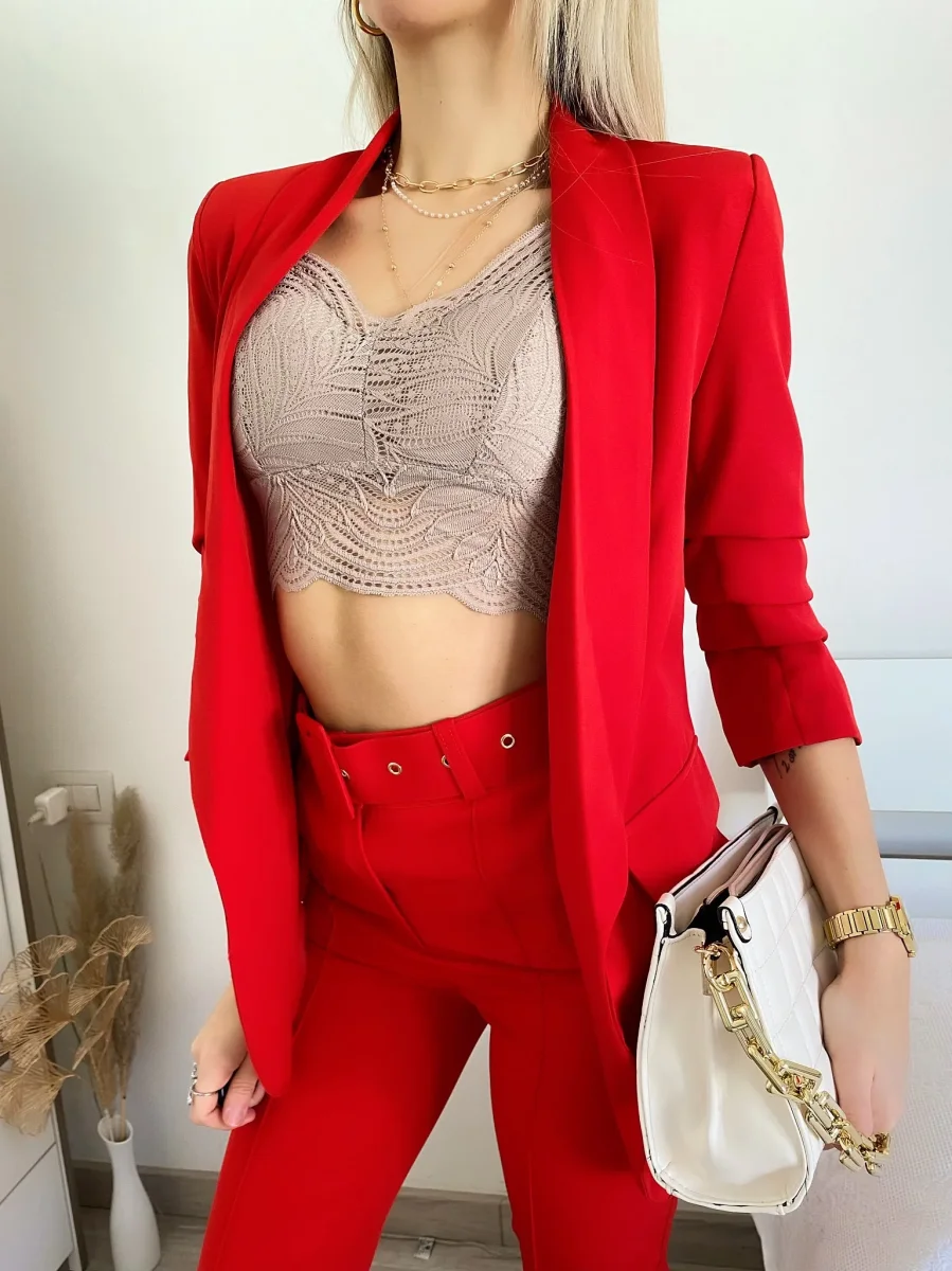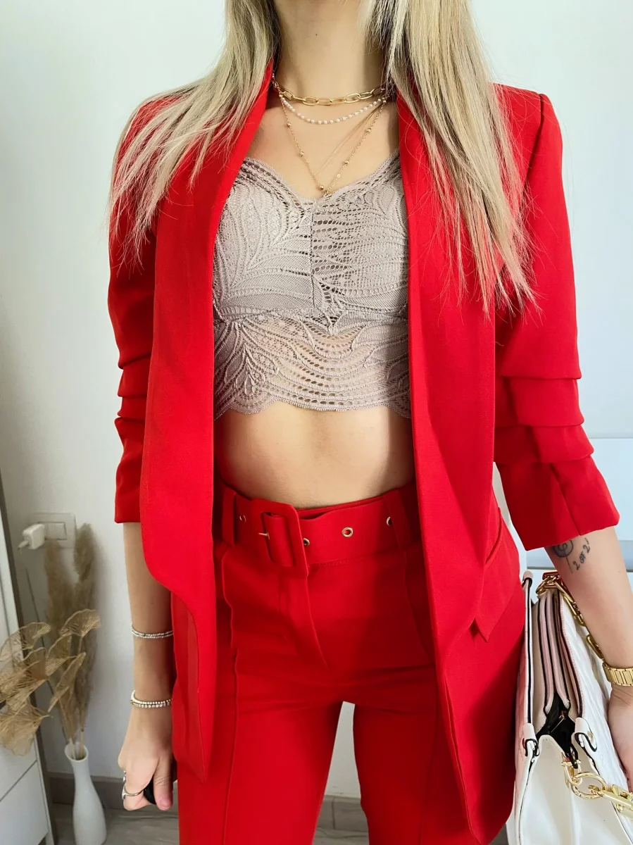 Completo composto da giacca foderata con manica arricciata e pantalone con cintura in vita.